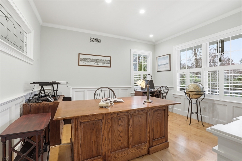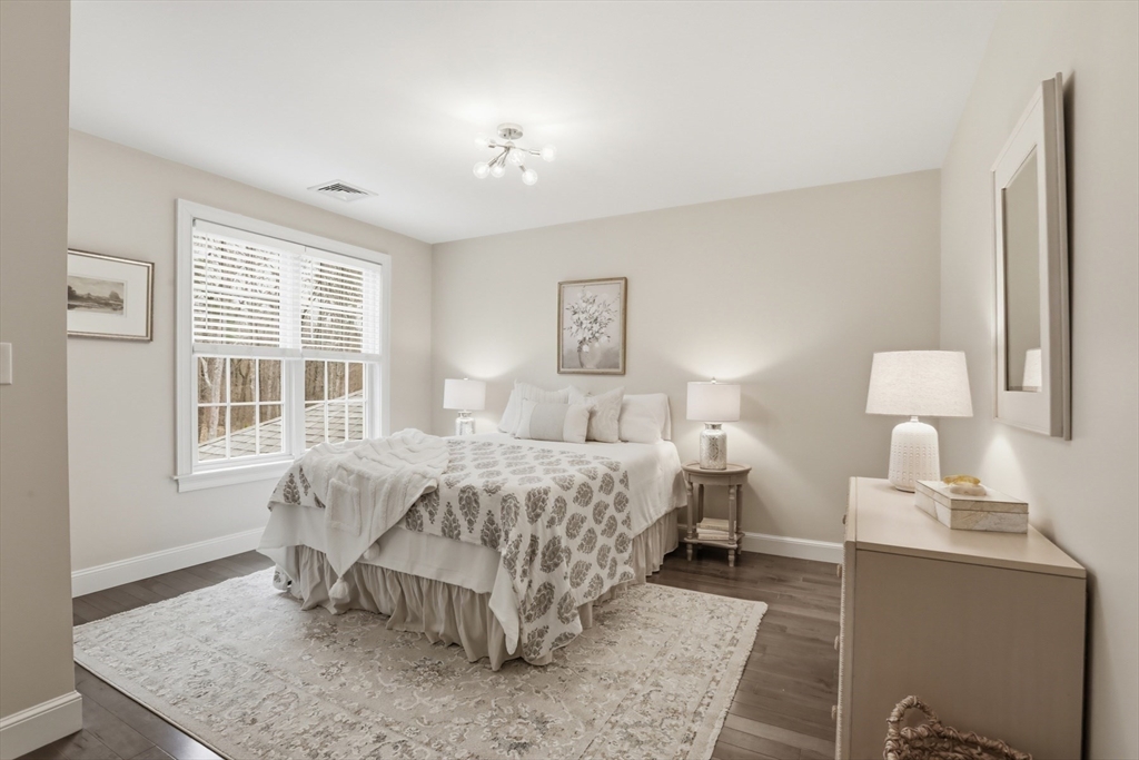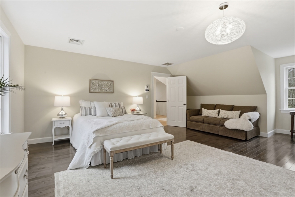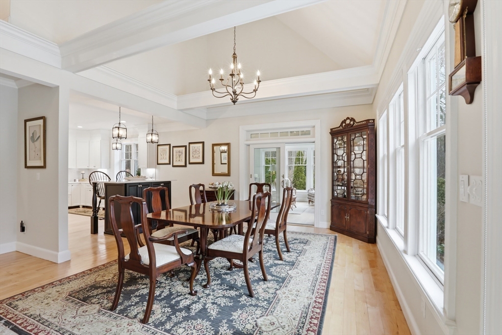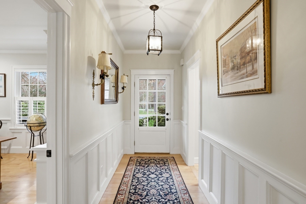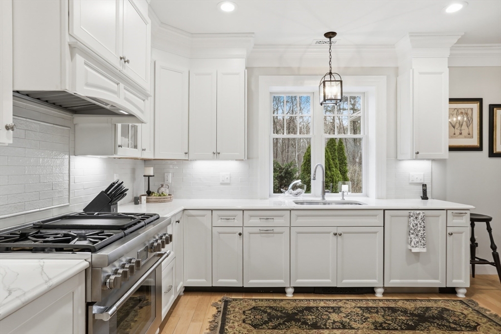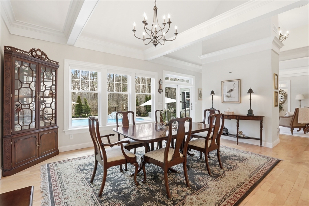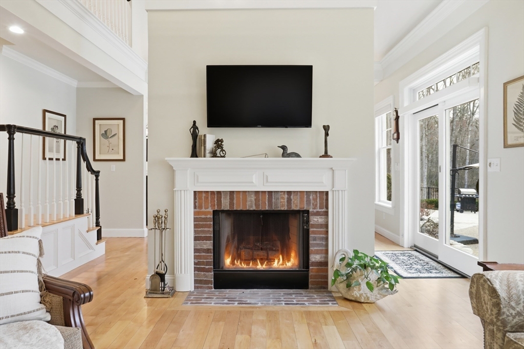 At the end of a quaint Newbury drive sits this exquisite Cape in a private, estate-like setting on just over three acres abutting conservation land. The beautifully designed grounds were created by one of Newburyport’s notable landscape designers, and the home was thoughtfully designed and crafted with exceptional attention to detail. The main level features an office or den, an expansive living room with a wood-burning fireplace, vaulted ceilings, exposed beams, and a wall of windows overlooking the gunite pool and terrace. A gracious dining room leads to a sunroom and a chef’s kitchen with custom white cabinetry, quartz counters, tile backsplash, and Thermador appliances. The first-floor primary suite offers a gas fireplace, soaring ceilings, walk-in closet, and spa-like bath. Upstairs are a second primary suite and two additional en-suite bedrooms. Three-bay garage, home gym, and ample storage. Ten minutes to downtown Newburyport, Plum Island beaches and under five minutes to Rt 95.