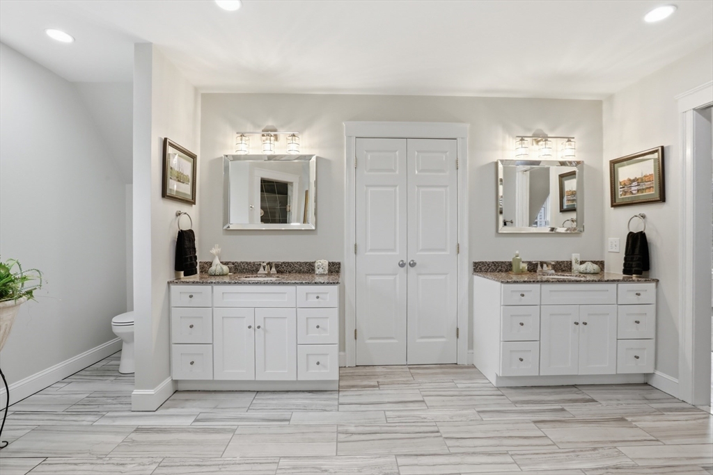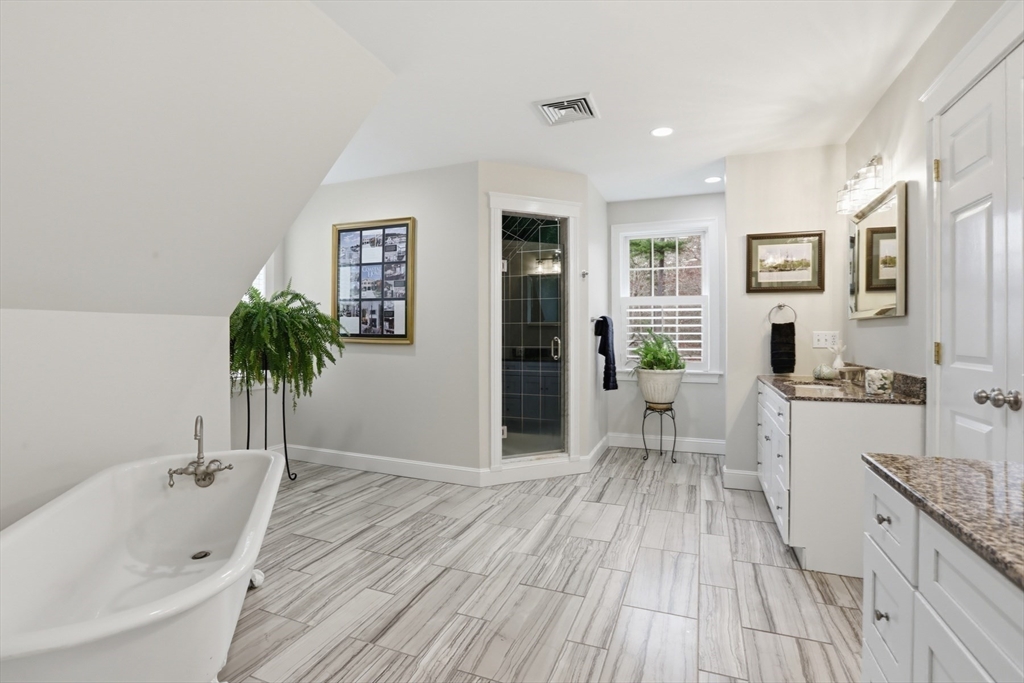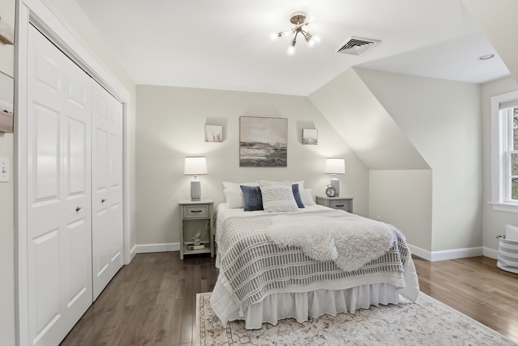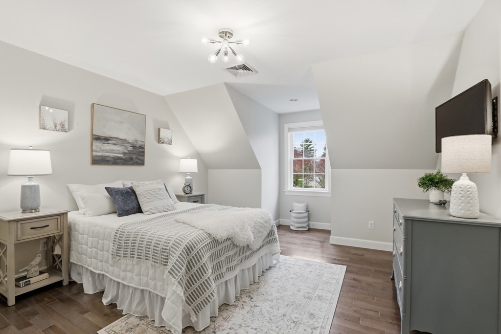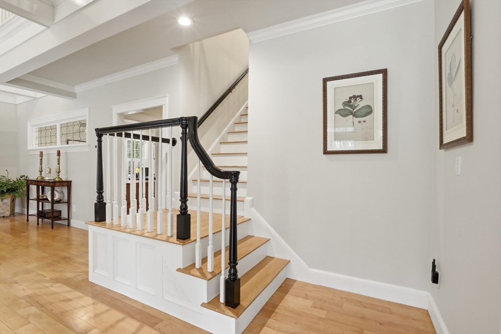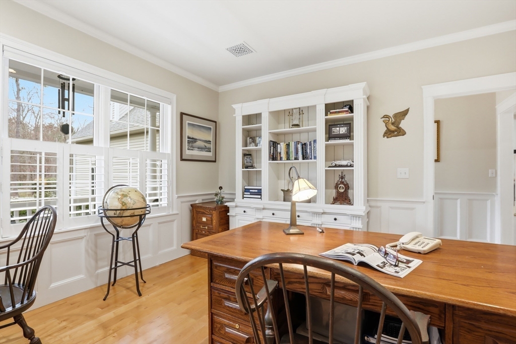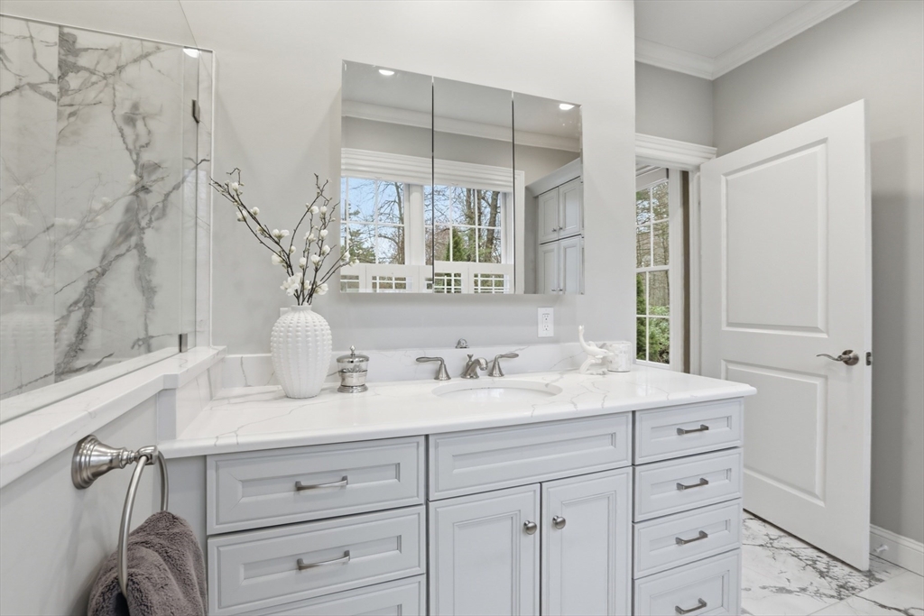 At the end of a quaint Newbury drive sits this exquisite Cape in a private, estate-like setting on just over three acres abutting conservation land. The beautifully designed grounds were created by one of Newburyport’s notable landscape designers, and the home was thoughtfully designed and crafted with exceptional attention to detail. The main level features an office or den, an expansive living room with a wood-burning fireplace, vaulted ceilings, exposed beams, and a wall of windows overlooking the gunite pool and terrace. A gracious dining room leads to a sunroom and a chef’s kitchen with custom white cabinetry, quartz counters, tile backsplash, and Thermador appliances. The first-floor primary suite offers a gas fireplace, soaring ceilings, walk-in closet, and spa-like bath. Upstairs are a second primary suite and two additional en-suite bedrooms. Three-bay garage, home gym, and ample storage. Ten minutes to downtown Newburyport, Plum Island beaches and under five minutes to Rt 95.
