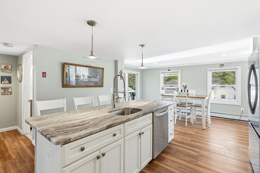 This beautiful 3-4 bedroom, 2 bath home offers the perfect blend of comfort, style, and versatility. Thoughtfully renovated in recent years, it features a spacious layout designed for modern living. The heart of the home is the stunning kitchen, complete with a large center island, granite countertops, and stainless steel appliances, ideal for everyday living and entertaining. Inside, you'll find flexible living spaces perfect for multi-generational living, including a private entrance that offers added convenience and privacy. The home also boasts vinyl siding and replacement windows for low-maintenance living. Step outside and enjoy your own private retreat. The beautifully fenced backyard is both child- and pet-friendly, offering ample space to play, relax, and entertain. Gather with family and friends around the hardscaped fire pit and patio area, or enjoy outdoor dining and summer evenings on the deck. Additional features include a one-car garage and plenty of off-street parking.