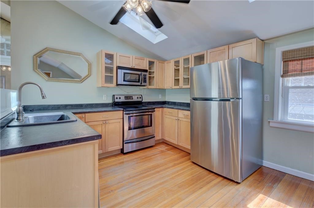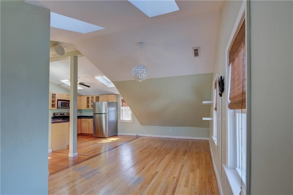 Sophisticated 2-bedroom, 1-bath penthouse just off Hope Street, steps from Seven Stars Bakery and Hope Village dining. Bright, open living/dining area flows to a stainless-steel kitchen — perfect for entertaining. Hardwood floors, skylights, central air, in-unit washer/dryer, and two-car parking (one garage space) deliver comfort and convenience. Shared fenced rear yard provides private outdoor space; minutes to Lippitt Park farmers market, Wayland Square, Wickenden Street, and downtown. Exterior is currently being restored.