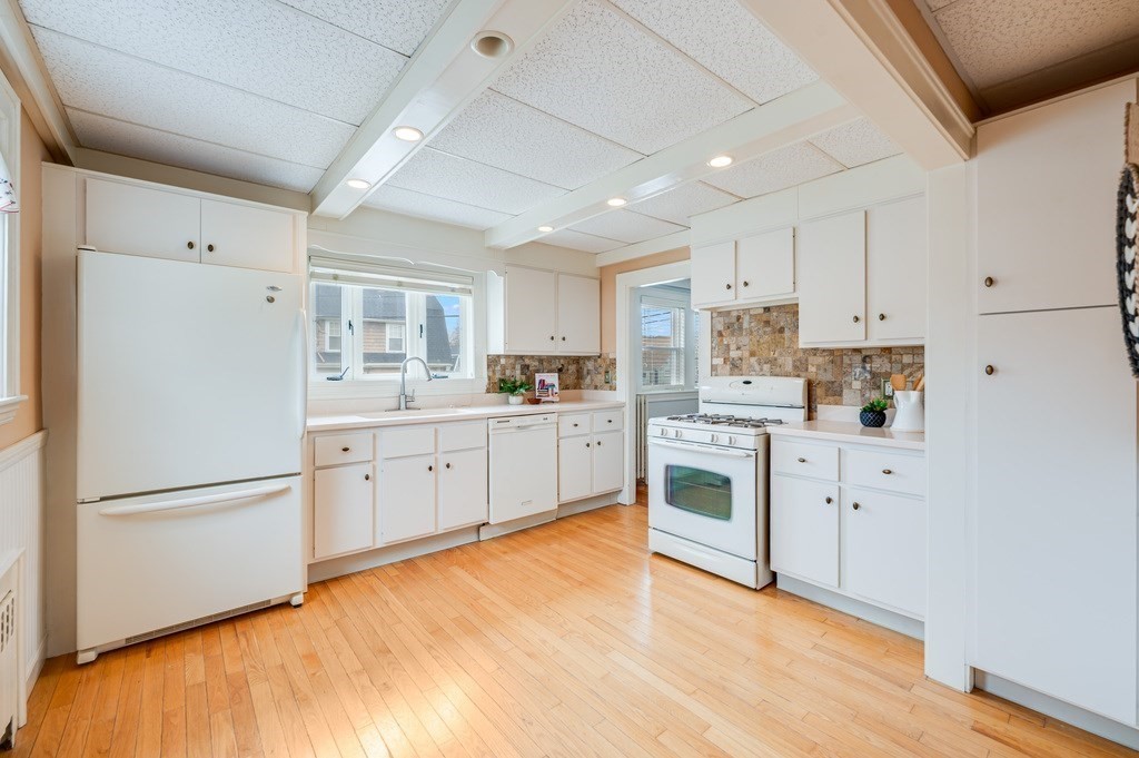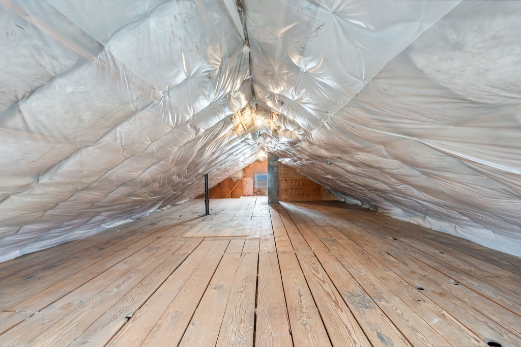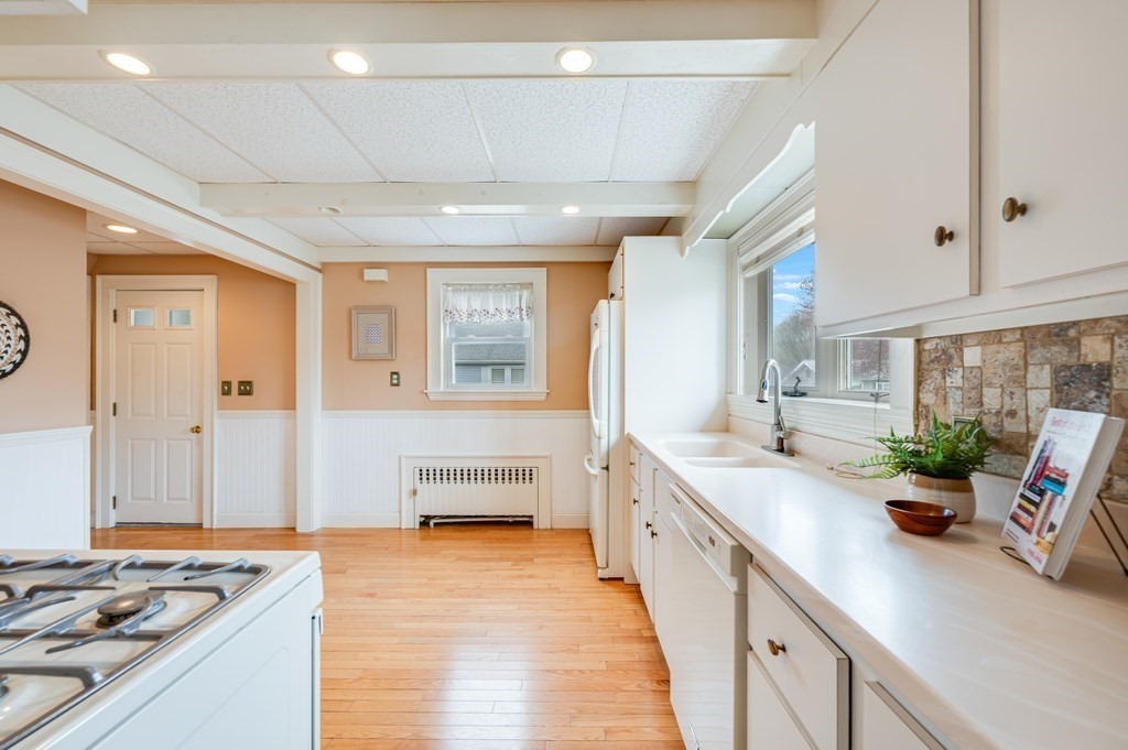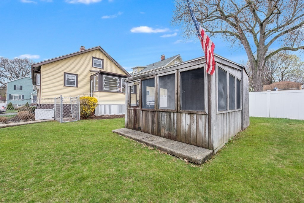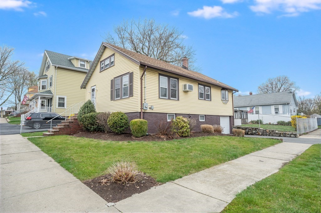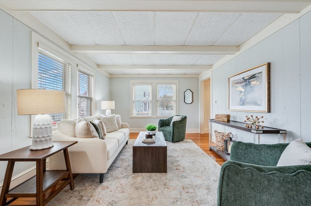 Tucked away in a quaint Saugus neighborhood, this 2-bedroom, 1-bath home offers a rare combination of single-level ease & incredible future potential. The interior features fresh paint, an open living & dining layout accented by classic coffered ceilings, wainscoting, & gleaming hardwood floors. Flooded with natural light, the space flows directly into a spacious kitchen, & 2 well-appointed bedrooms. The partially finished basement offers versatility for playroom or office possibilities. Step outside to the large, private, enclosed backyard, with custom-built shed. Also featuring low-maintenance vinyl siding & a convenient one-car garage. While move-in ready, this home is a canvas awaiting your vision, offering significant value-add expansion potential with space in both the attic & basement. Whether you are looking for a stylish starter home or a strategic investment with room to grow, this property offers the perfect foundation. Bring your design dreams & discover the possibilities.