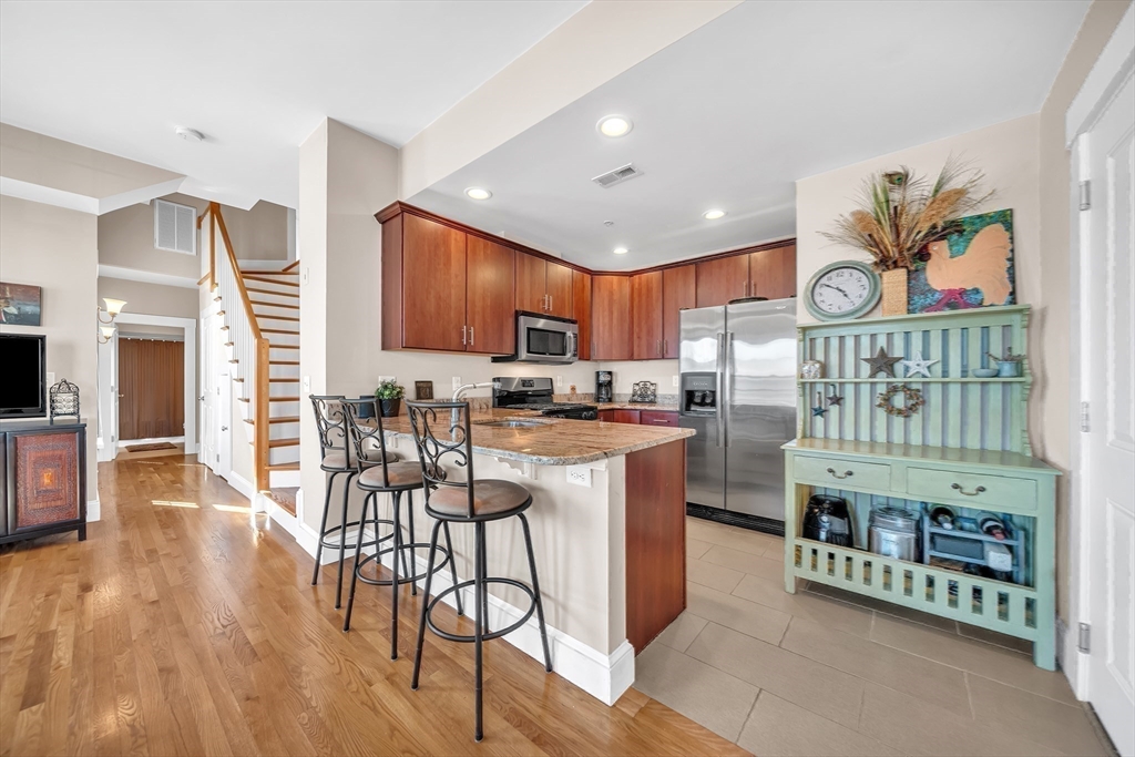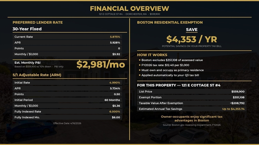 PREFERRED LENDER 5.875% 30 YEARS FIXED! Beautifully updated 2-bedroom, 1-bath condo offering approx. 933 sq ft of comfortable, well-designed living space with low condo fees, basement storage, shared outdoor space, and deeded parking for 2 cars. The sun-filled open layout connects the living/dining areas to a stylish kitchen with stainless steel appliances, granite countertops, breakfast bar seating, and hardwood floors. The spacious primary bedroom offers excellent closet space, while the full bath includes a large tub and in-unit laundry. Enjoy the fenced shared outdoor space, perfect for grilling, relaxing, or entertaining. Pet-friendly 9-unit association with recent updates including new siding, trim, paint, and window sills. Ideally located just blocks to Andrew Station on the Red Line and approx. 2.5 miles to Downtown Boston, South End, Back Bay, and Longwood Medical Area. Schedule a private showing today!