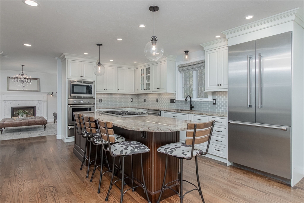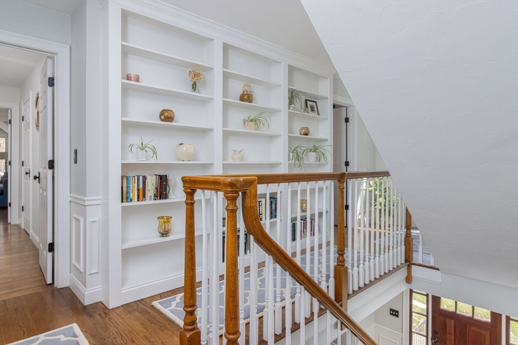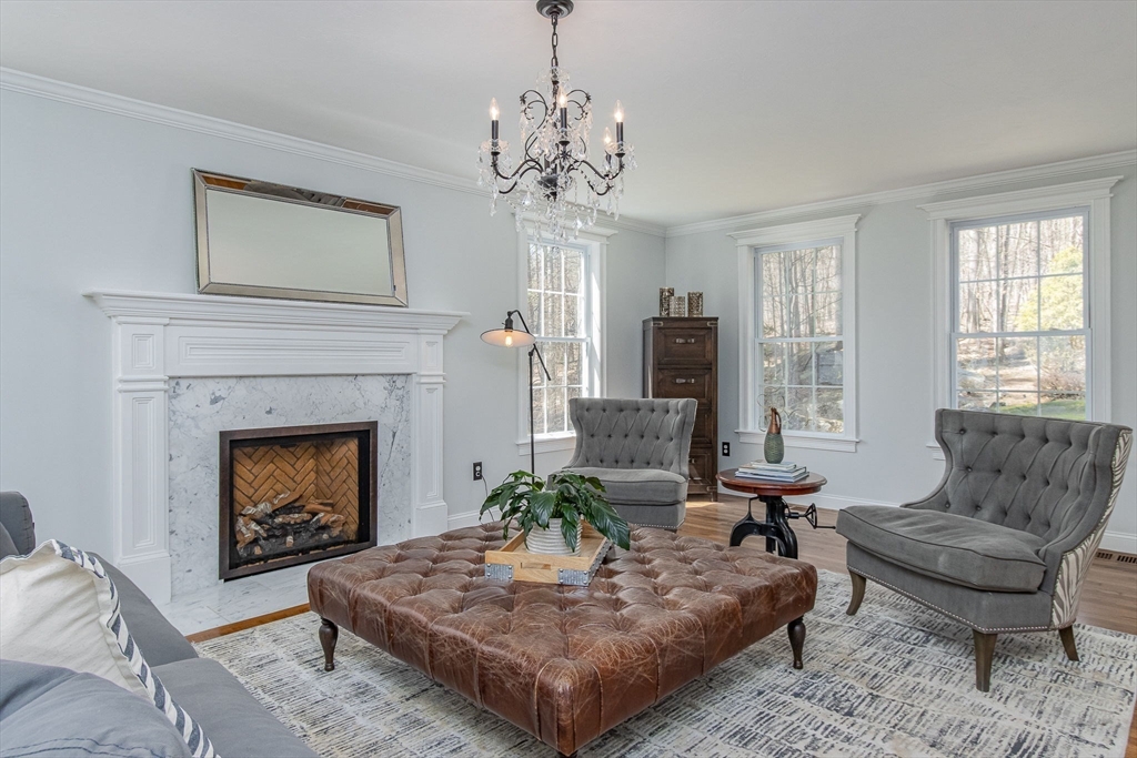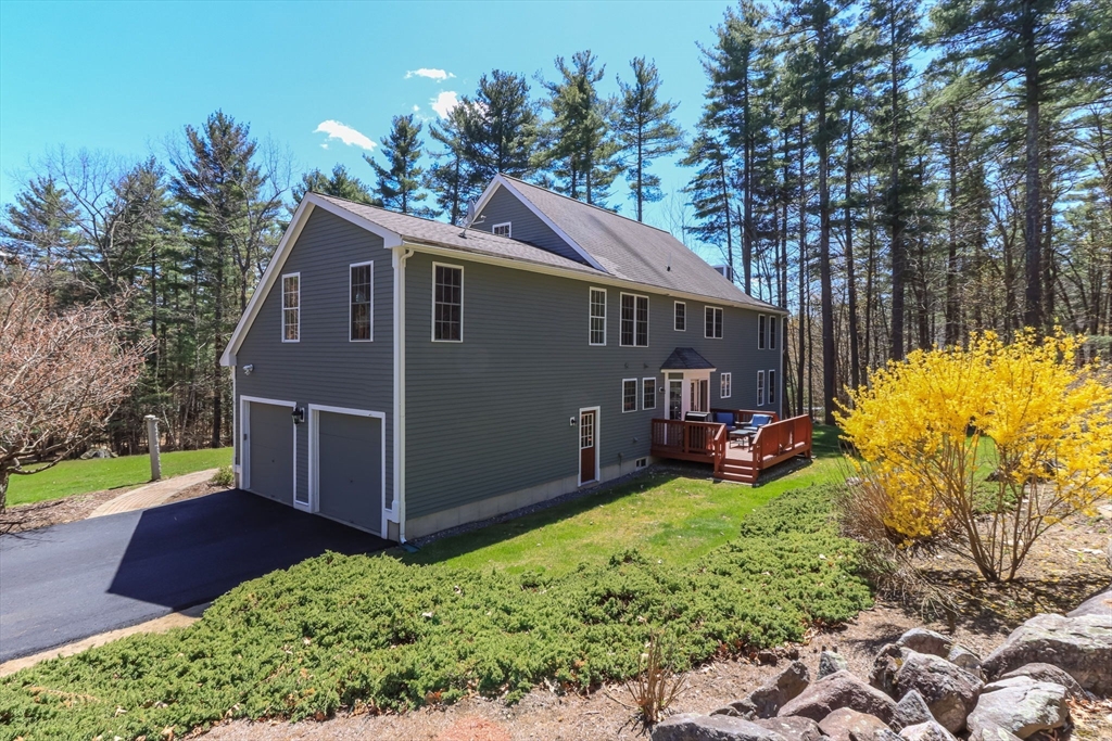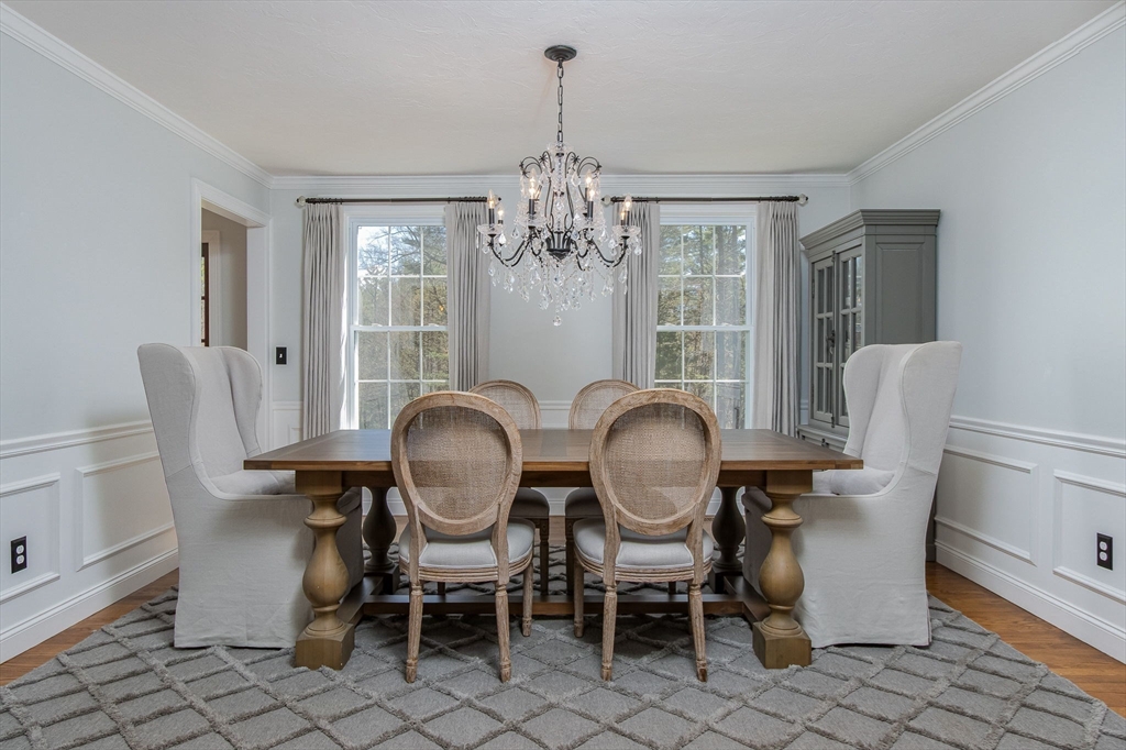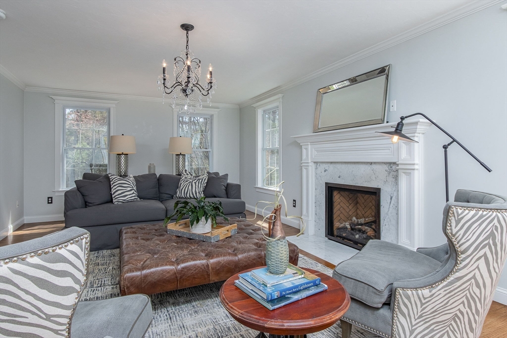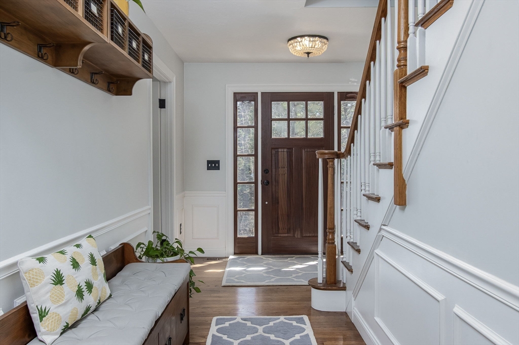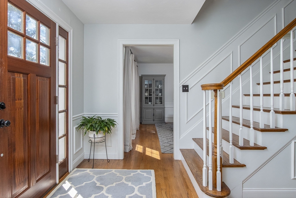 Gorgeous colonial home set back from a quiet country road directly abutting conservation land. Stunning updates featured throughout. Functional floor plan catering to both entertaining & everyday living. Hardwood flooring & beautiful trim work throughout the home. Remodeled kitchen w/inset cabinetry, built-in fridge, wall oven/micro & dining area. Open concept dining room w/ wainscoting & crown molding. Formal living room/office. Spacious front-to-back family room w/ inviting fireplace & marble surround. Updated half bath/laundry. Elaborate primary suite w/ walk-in closet & spa-like bath boasting tiled shower, soaking tub, & double sink vanity. Three spacious bedrooms share an updated bathroom w/ double sink vanity & tiled shower w/ built-in bench. Versatile space in bonus room w/ separate staircase also found on the 2nd floor. Walk-up attic for expansion potential & all your storage needs. Finished LL rec room. Well manicured landscaping, rear deck, & very private outdoor space.