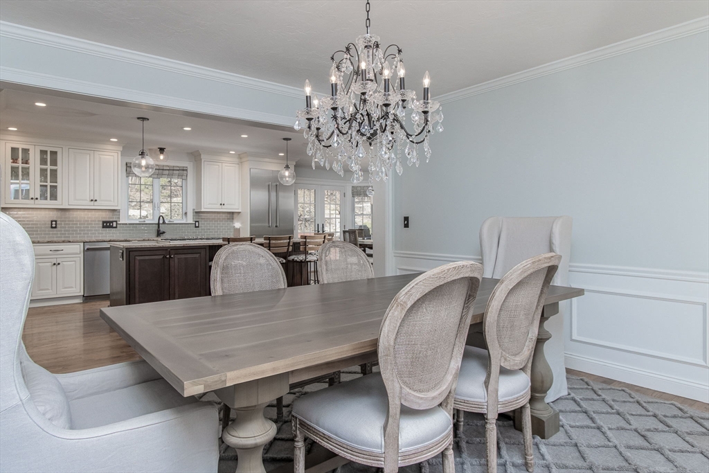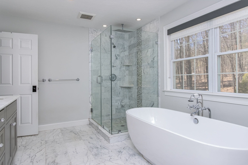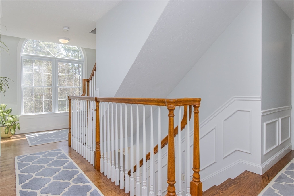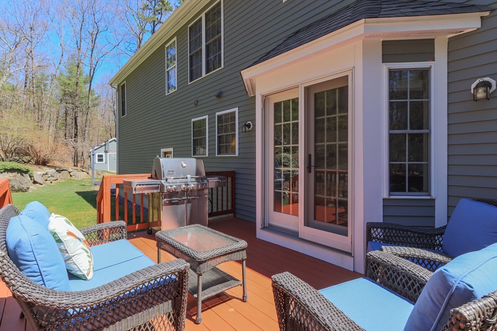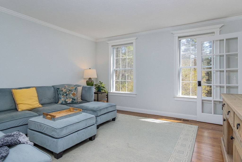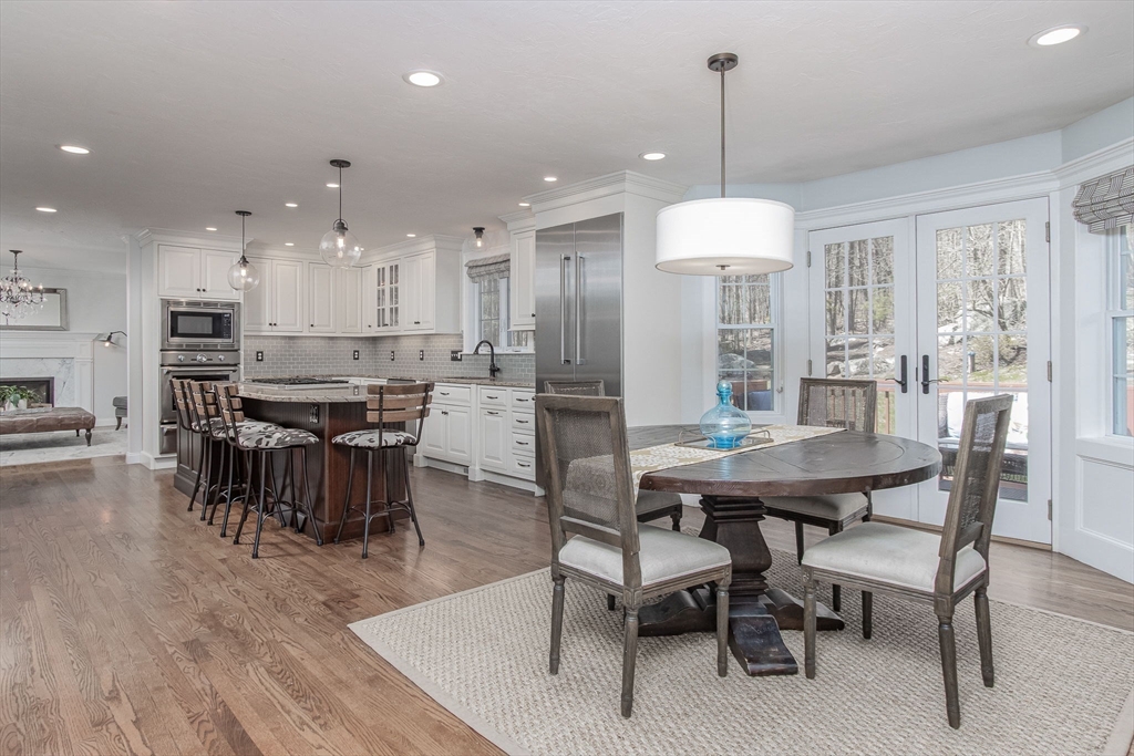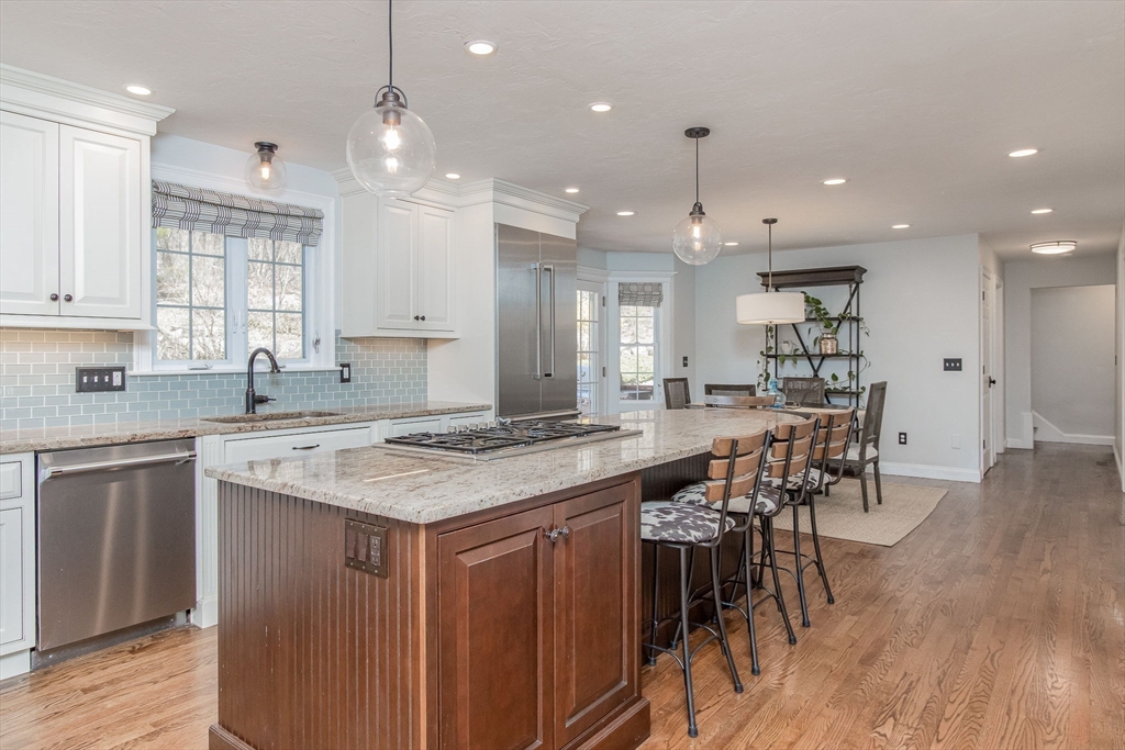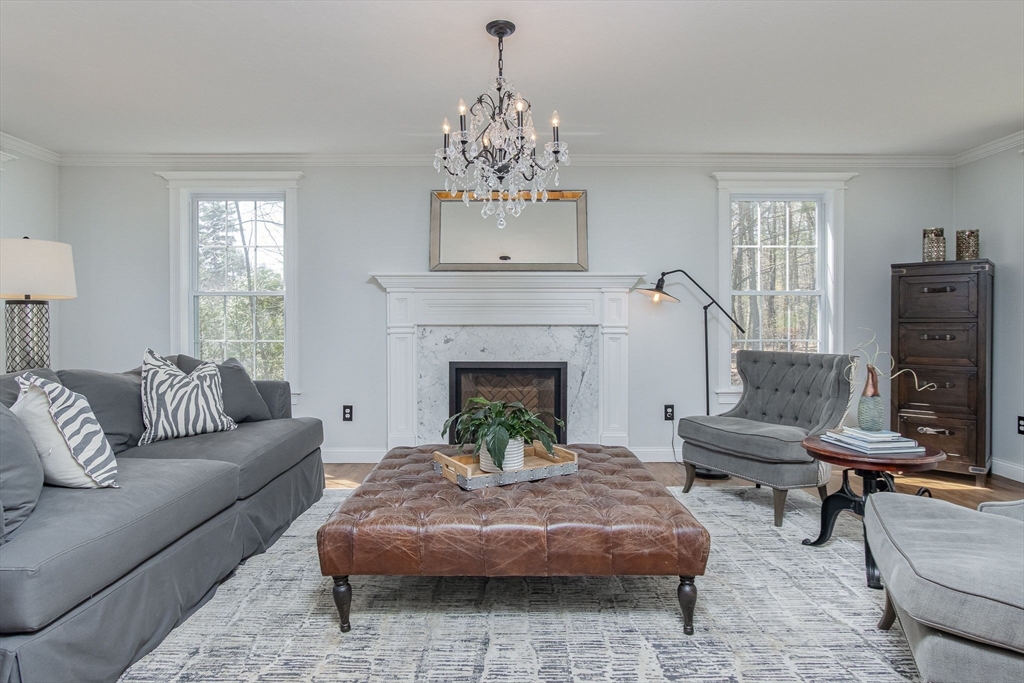 Gorgeous colonial home set back from a quiet country road directly abutting conservation land. Stunning updates featured throughout. Functional floor plan catering to both entertaining & everyday living. Hardwood flooring & beautiful trim work throughout the home. Remodeled kitchen w/inset cabinetry, built-in fridge, wall oven/micro & dining area. Open concept dining room w/ wainscoting & crown molding. Formal living room/office. Spacious front-to-back family room w/ inviting fireplace & marble surround. Updated half bath/laundry. Elaborate primary suite w/ walk-in closet & spa-like bath boasting tiled shower, soaking tub, & double sink vanity. Three spacious bedrooms share an updated bathroom w/ double sink vanity & tiled shower w/ built-in bench. Versatile space in bonus room w/ separate staircase also found on the 2nd floor. Walk-up attic for expansion potential & all your storage needs. Finished LL rec room. Well manicured landscaping, rear deck, & very private outdoor space.