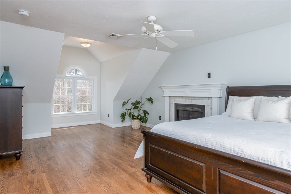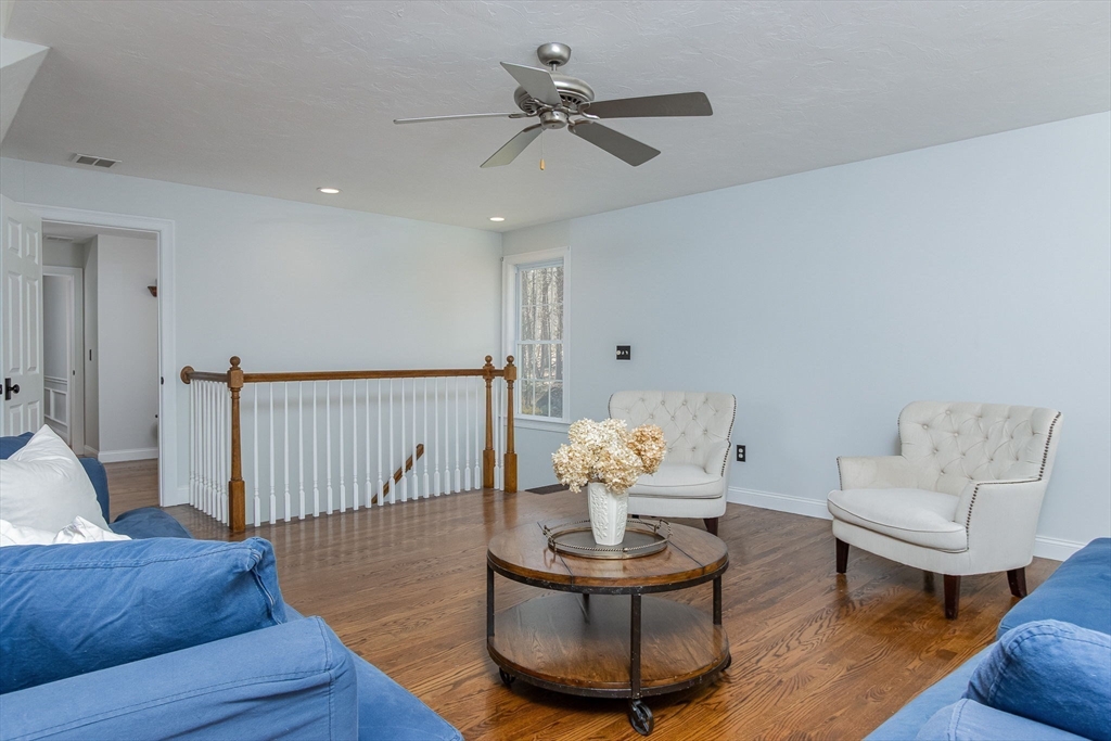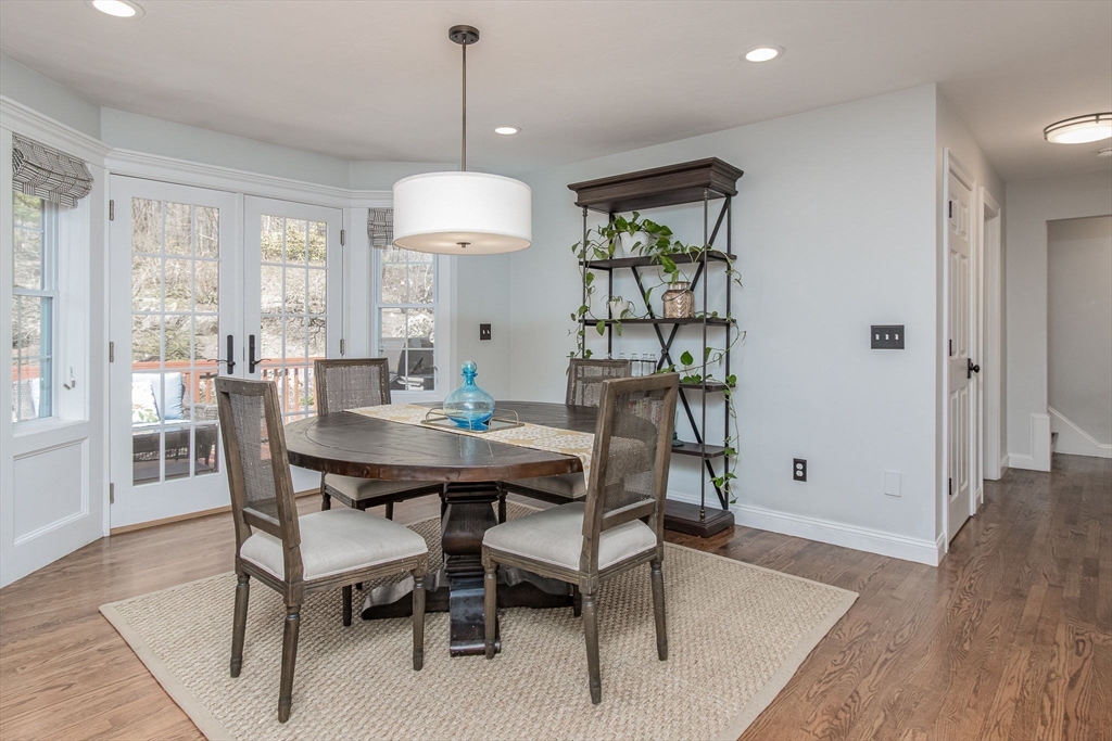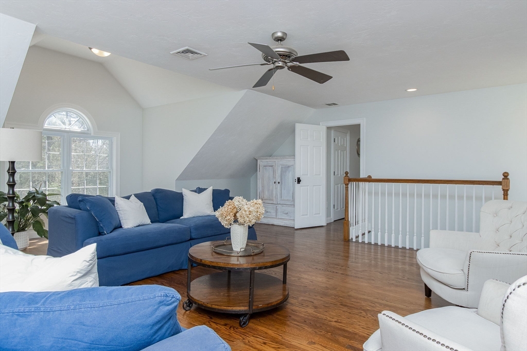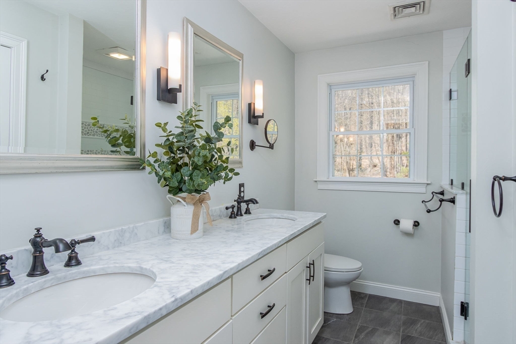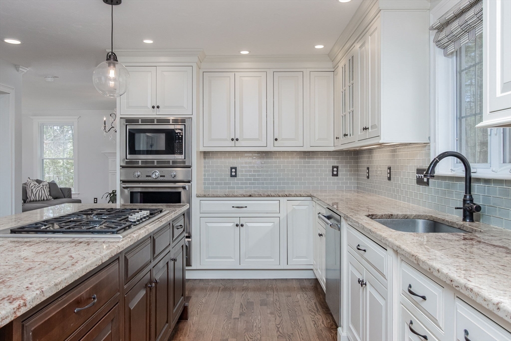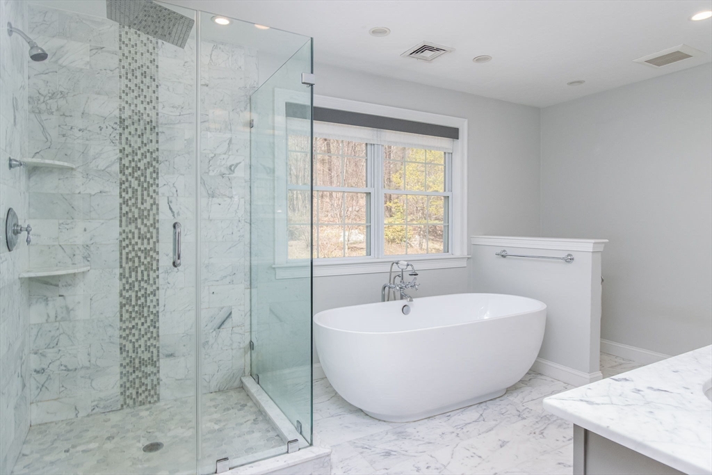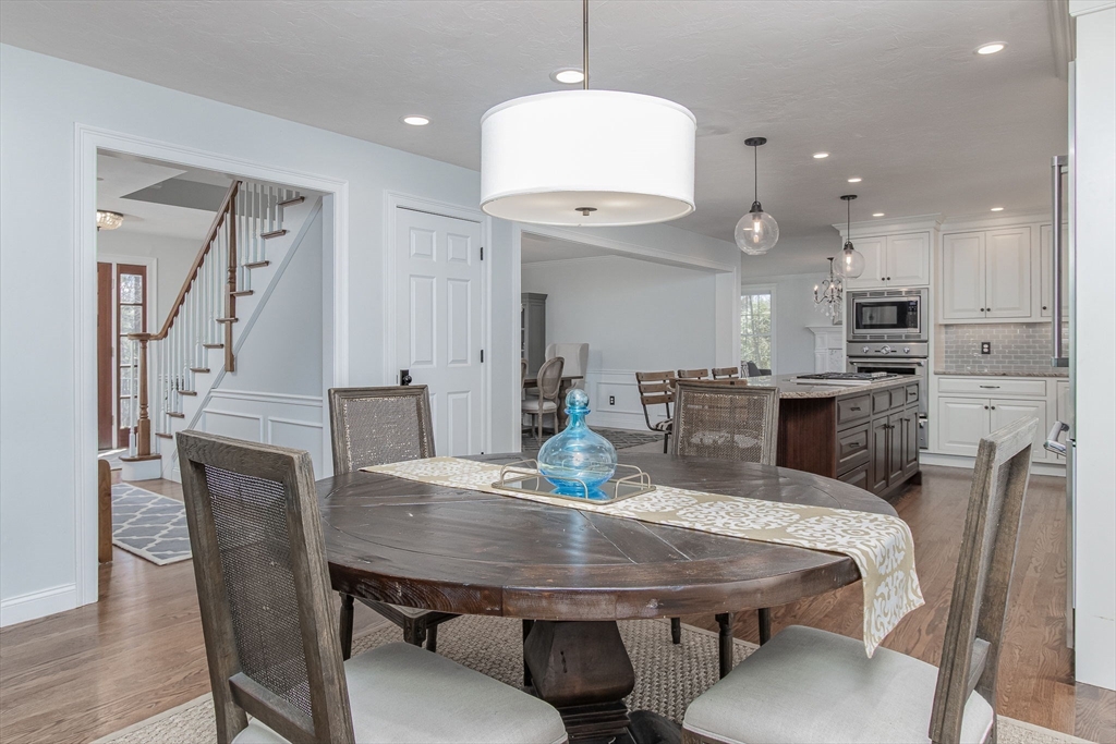 Gorgeous colonial home set back from a quiet country road directly abutting conservation land. Stunning updates featured throughout. Functional floor plan catering to both entertaining & everyday living. Hardwood flooring & beautiful trim work throughout the home. Remodeled kitchen w/inset cabinetry, built-in fridge, wall oven/micro & dining area. Open concept dining room w/ wainscoting & crown molding. Formal living room/office. Spacious front-to-back family room w/ inviting fireplace & marble surround. Updated half bath/laundry. Elaborate primary suite w/ walk-in closet & spa-like bath boasting tiled shower, soaking tub, & double sink vanity. Three spacious bedrooms share an updated bathroom w/ double sink vanity & tiled shower w/ built-in bench. Versatile space in bonus room w/ separate staircase also found on the 2nd floor. Walk-up attic for expansion potential & all your storage needs. Finished LL rec room. Well manicured landscaping, rear deck, & very private outdoor space.