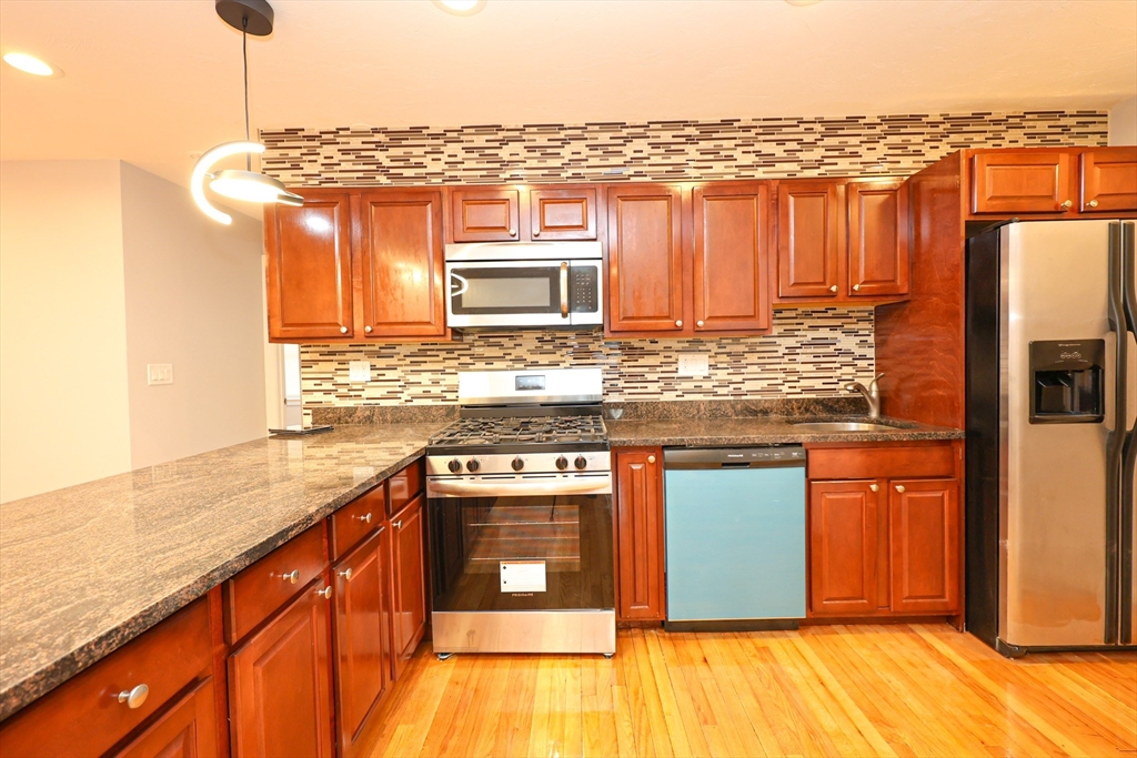 Beautifully updated 3-bedroom apartment in Boston's Dorchester neighborhood featuring an open-concept kitchen with rich cherry cabinetry, granite countertops, and stainless steel appliances including gas range, built-in microwave, dishwasher, and French-door refrigerator. Stylish mosaic tile backsplash and a spacious breakfast bar create a welcoming hub for cooking and entertaining. Gleaming hardwood floors flow throughout, complemented by neutral gray walls and crisp white trim, while a generous living room with bay window brings in abundant natural light. Stay comfortable year-round with central air and recessed lighting throughout. Three spacious bedrooms offer flexibility for family, guests, or a home office—each with hardwood floors and ample closet space. Set on a residential side street near Grove Hall, this home offers easy access to public transportation, neighborhood shopping and dining.