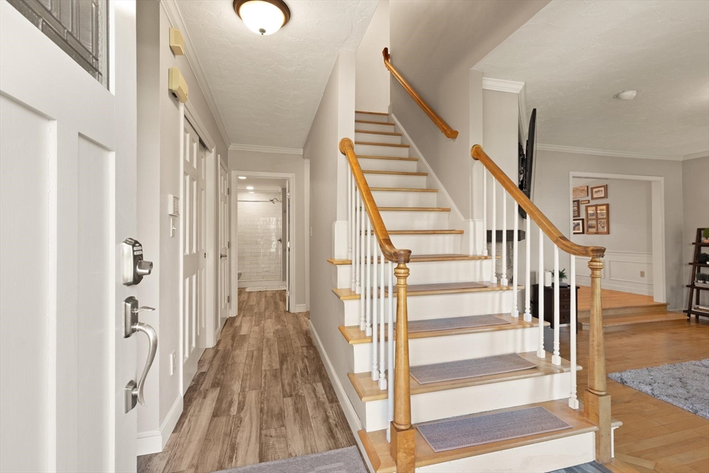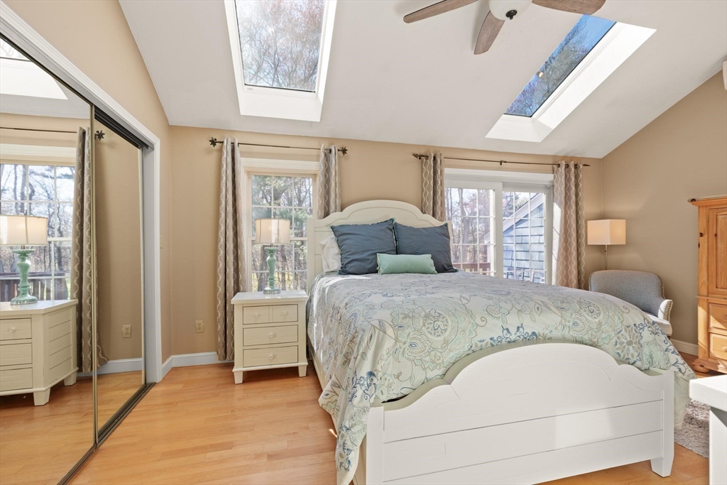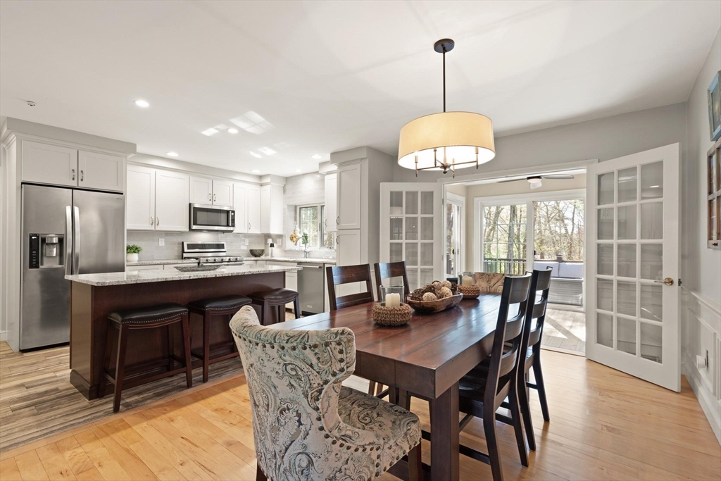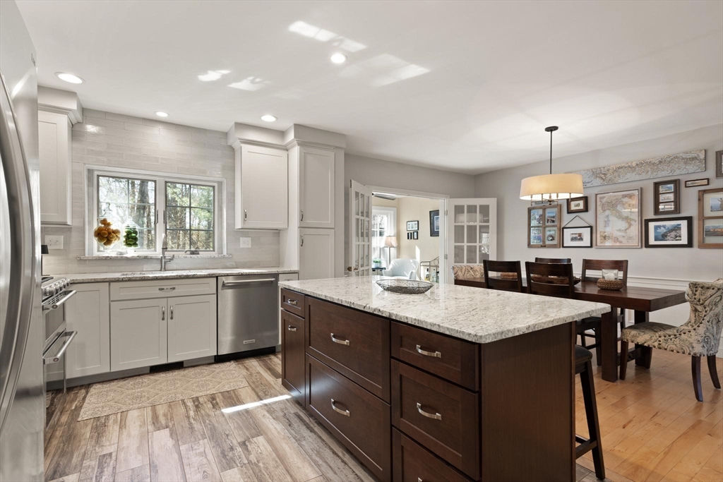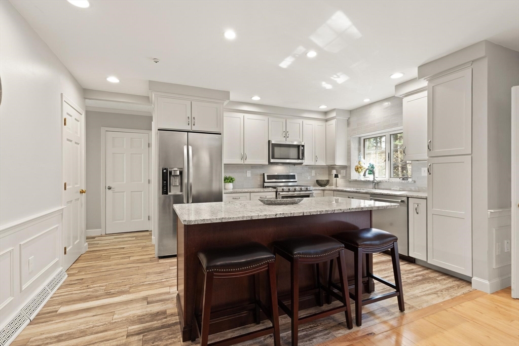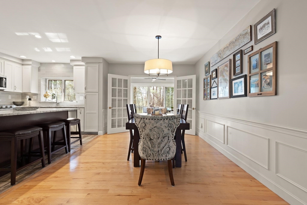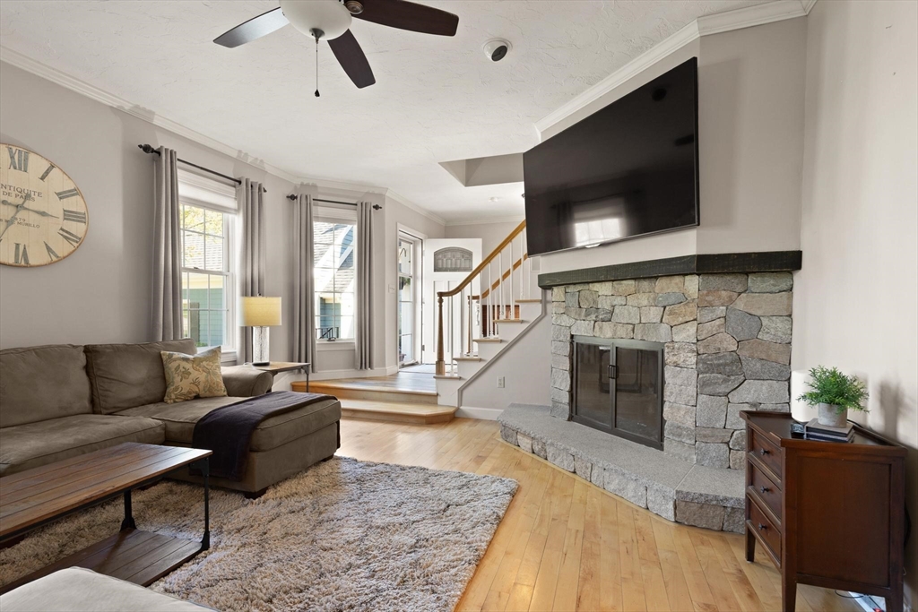 Rarely available 'Stonehedge Farms II' condo that feels like a single family. Sunken living room with fireplace, crown molding, and maple flooring that goes into dining rm - open to the kitchen - as well as up the stairs. Tile flooring, granite countertops, stainless steel appliances, and a large island grace the kitchen. Through French doors from dining room you access a lovely Sun Room with two sets of double sliders to the deck overlooking the paddocks. Full bathroom with very large tiled shower. Upstairs is the bright main bedroom featuring cathedral ceiling, two skylights, mini-split and sliders to a private deck. Ensuite full bathroom w/ skylight, a beautifully tiled shower/tub combination, and two vanities. Second bedrm offers the same maple hardwood flooring as the main BR. 2nd full bath with laundry completes this level. Finished walk-out basement offers 3rd BR w/ door to back as well as double sliders, along w/ bonus room, desk area, and plenty of storage.
