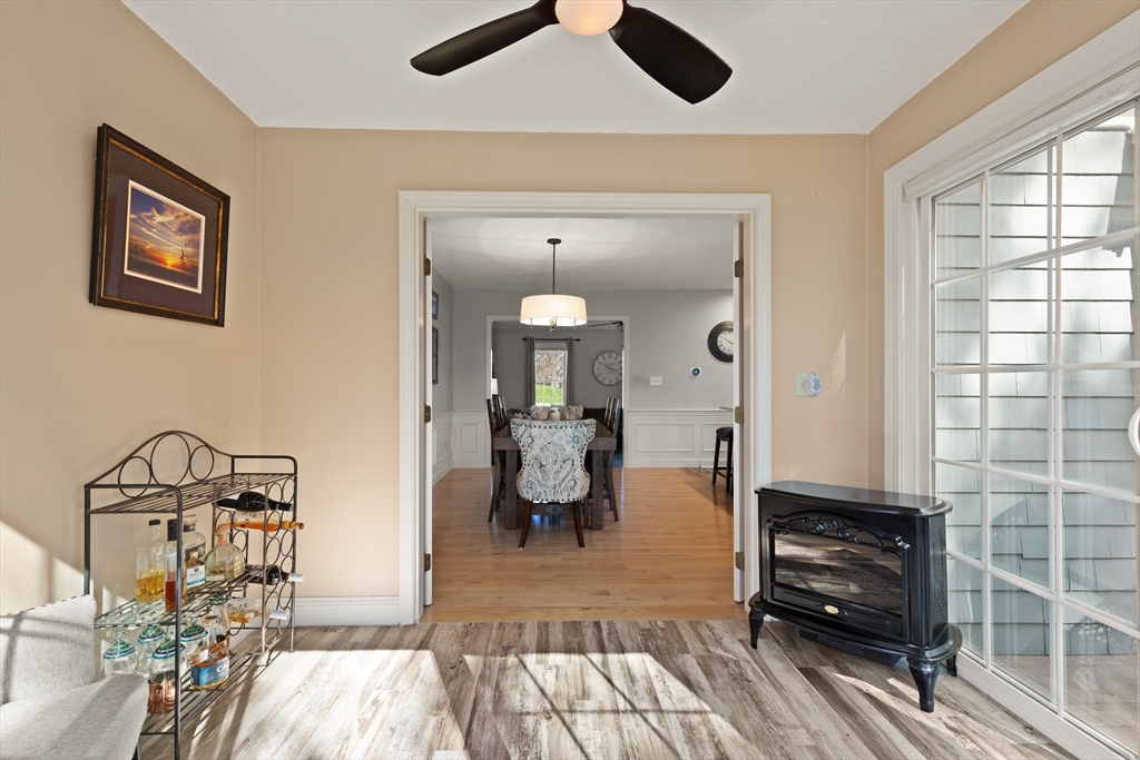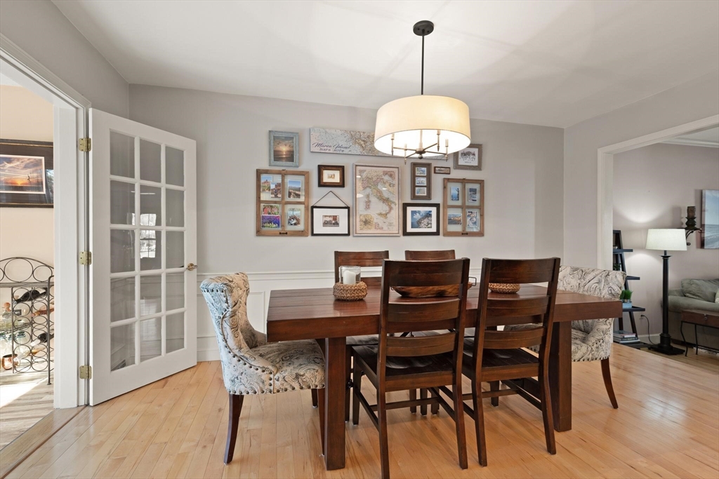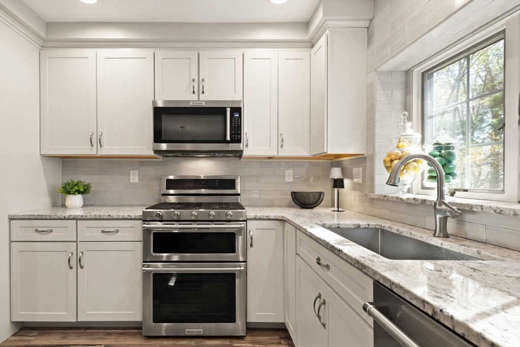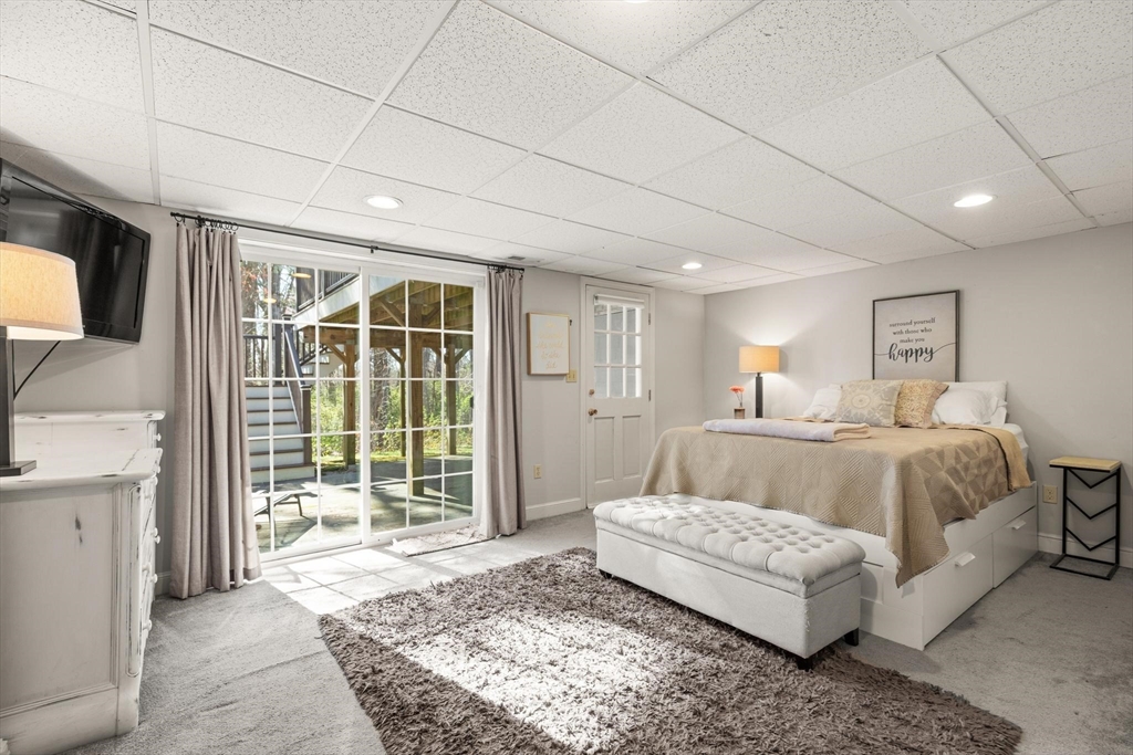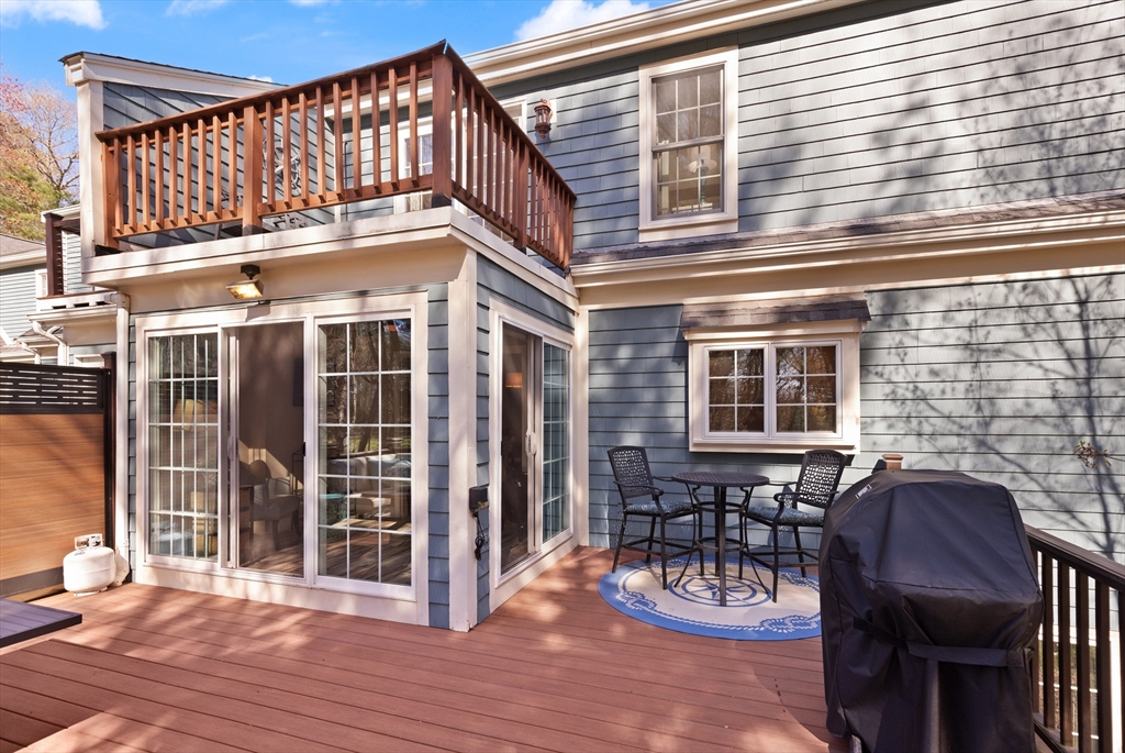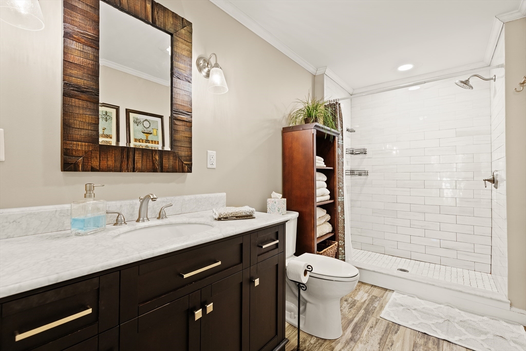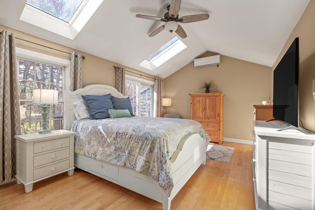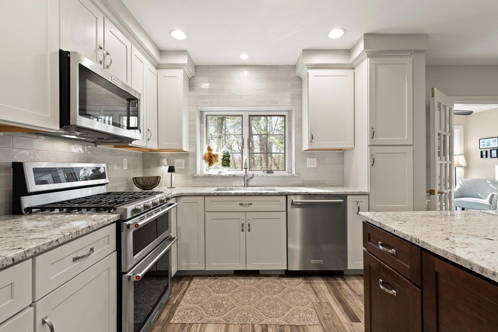 Rarely available 'Stonehedge Farms II' condo that feels like a single family. Sunken living room with fireplace, crown molding, and maple flooring that goes into dining rm - open to the kitchen - as well as up the stairs. Tile flooring, granite countertops, stainless steel appliances, and a large island grace the kitchen. Through French doors from dining room you access a lovely Sun Room with two sets of double sliders to the deck overlooking the paddocks. Full bathroom with very large tiled shower. Upstairs is the bright main bedroom featuring cathedral ceiling, two skylights, mini-split and sliders to a private deck. Ensuite full bathroom w/ skylight, a beautifully tiled shower/tub combination, and two vanities. Second bedrm offers the same maple hardwood flooring as the main BR. 2nd full bath with laundry completes this level. Finished walk-out basement offers 3rd BR w/ door to back as well as double sliders, along w/ bonus room, desk area, and plenty of storage.