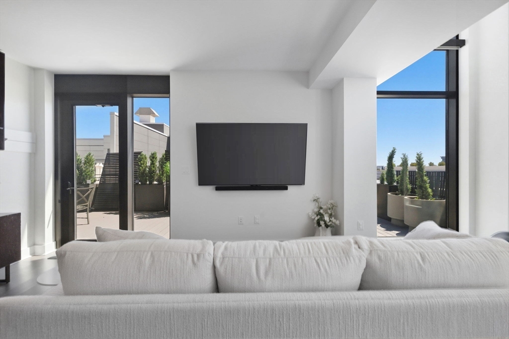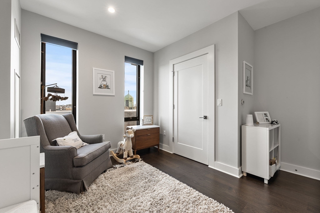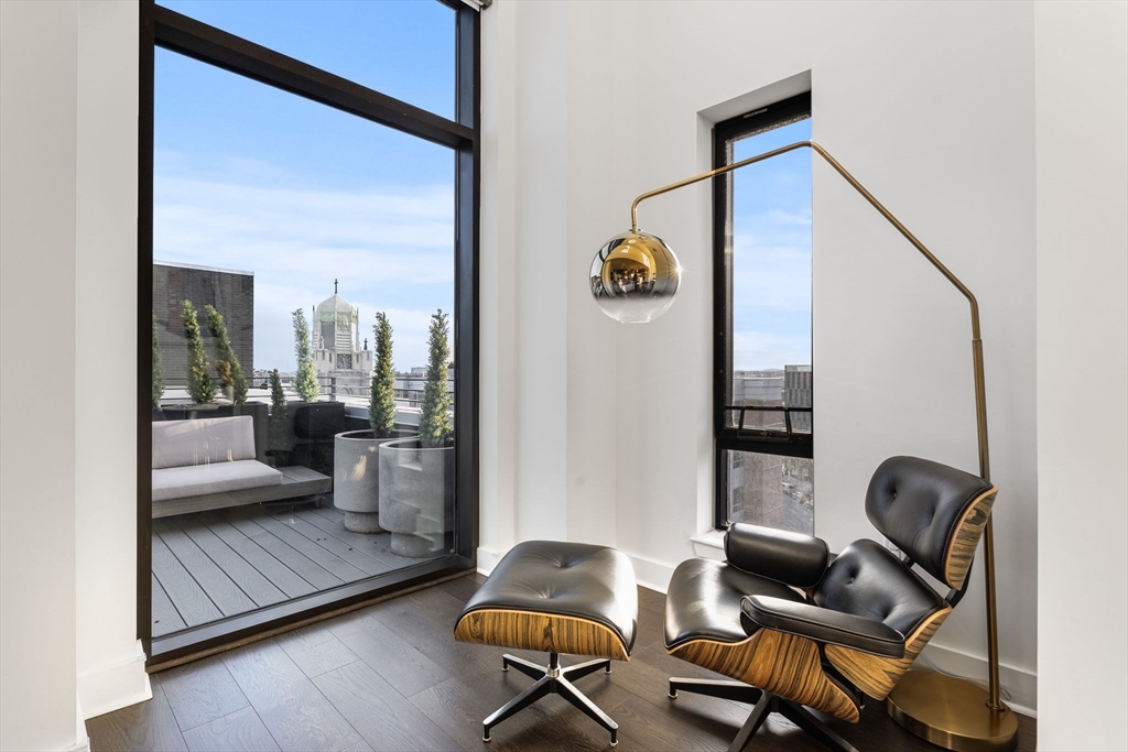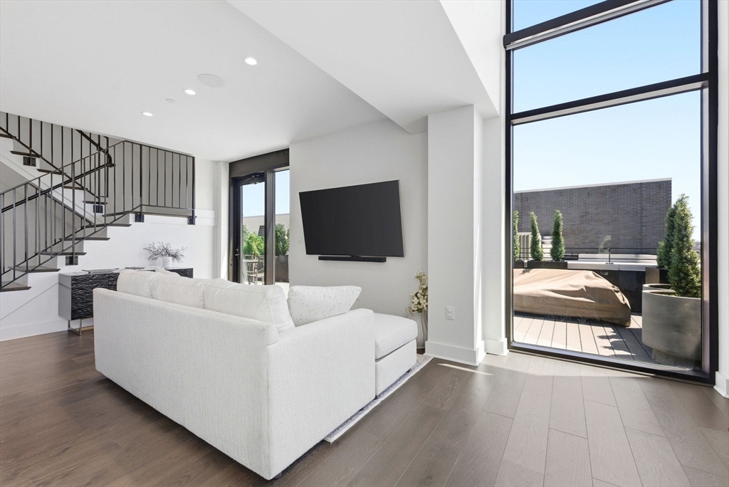 Steps from the Broadway T and South Boston’s best restaurants and cafés, this sun-drenched duplex blends dramatic design with full-service living. Double-height ceilings and expansive south-facing windows anchor the main level, where an open living area flows seamlessly into a Wolf/Sub-Zero kitchen. Positioned off the entry for added privacy, the den serves as an ideal office or bonus room and is complemented by a half bath and in-unit laundry.The upper level offers a serene primary suite with custom storage, a guest bedroom, and a second full bath. A major highlight is the 440+ sq. ft. private roof deck featuring panoramic city views, an unmatched extension of your living space.Residents enjoy luxury building amenities including full concierge services, valet, a fitness center, and two garage parking spaces. This is elevated South Boston living with immediate access to the Seaport and downtown.The Seller is offering a credit at closing equal to twelve (12) months of the HOA fee.