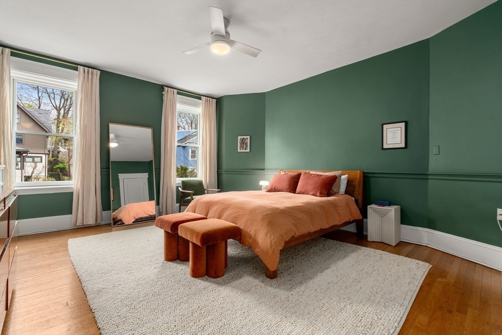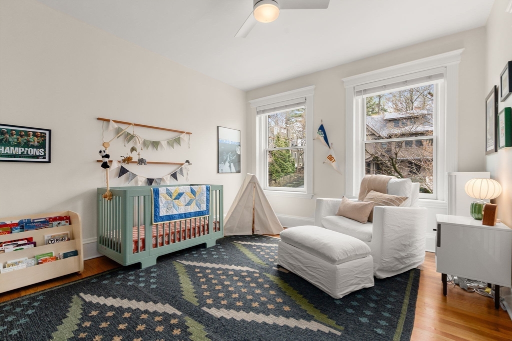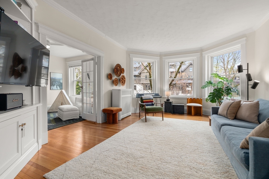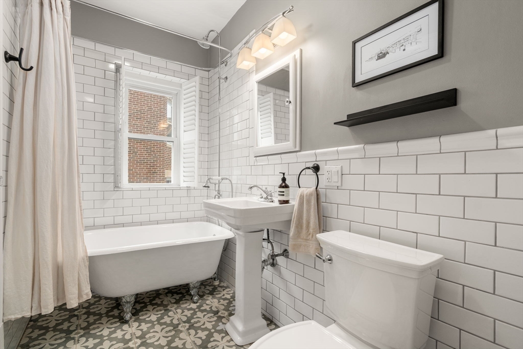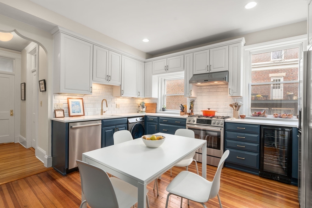 Stunning two-bedroom, one-bathroom condo on desirable Mason Terrace. An elegant arched entry from the foyer leads to a spacious living room featuring built-in cabinetry and serene treetop views. French doors lead to a versatile second bedroom with a generous closet with built-in systems. The primary suite offers two large closets.. The updated bathroom exudes charm with classic subway tile, a clawfoot tub/shower, pedestal sink, and ample linen cabinet. A beautifully renovated eat-in kitchen (2021) showcases stainless steel appliances, quartz countertops, wine refrigerator, and washer and dryer.This sun-filled home is enhanced by high ceilings, decorative molding, large windows, ceiling fans, abundant storage, and wood floors throughout. Additional features include a deeded storage unit and dedicated bike space in the basement. Ideally located near lovely Corey Hill Playground, shops, dining, and MBTA 'C' Trains.