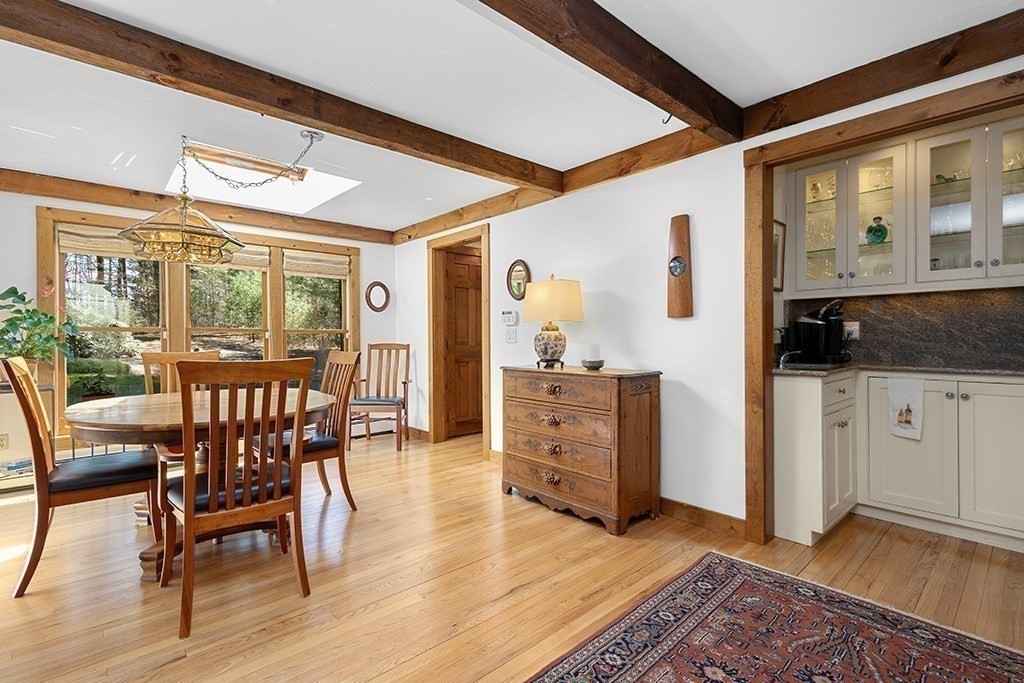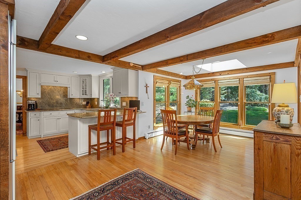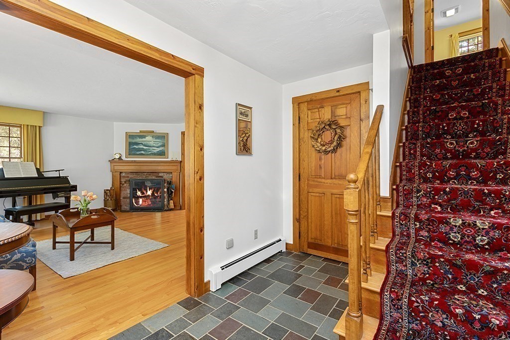 Welcome to 1 Stop River Rd! Set on 1.35 private acres surrounded by mature trees, this classic Colonial blends timeless charm with thoughtful updates. A beautifully maintained exterior and expansive yard create a serene setting for everyday living and entertaining. Inside, hardwood floors, exposed beams, and two fireplaces anchor the inviting spaces. The updated kitchen features a wet bar, pot filler, induction cooktop, wall oven, and abundant cabinetry, flowing seamlessly into the main living areas. A screened-in porch offers a peaceful place to unwind while overlooking the private backyard. The spacious primary suite includes an updated bath with a bubble tub. A finished walk-out basement provides flexible space for a family room, office, or guests with direct backyard access. Additional highlights include a 2-car garage, walk-up attic for future expansion, and a versatile floor plan ideal for today’s lifestyle.