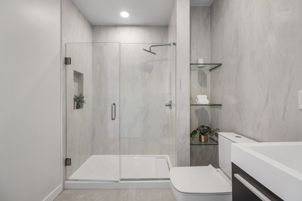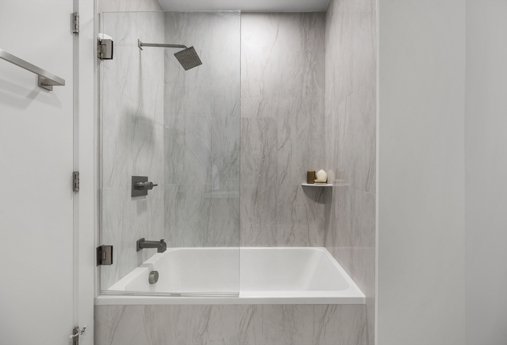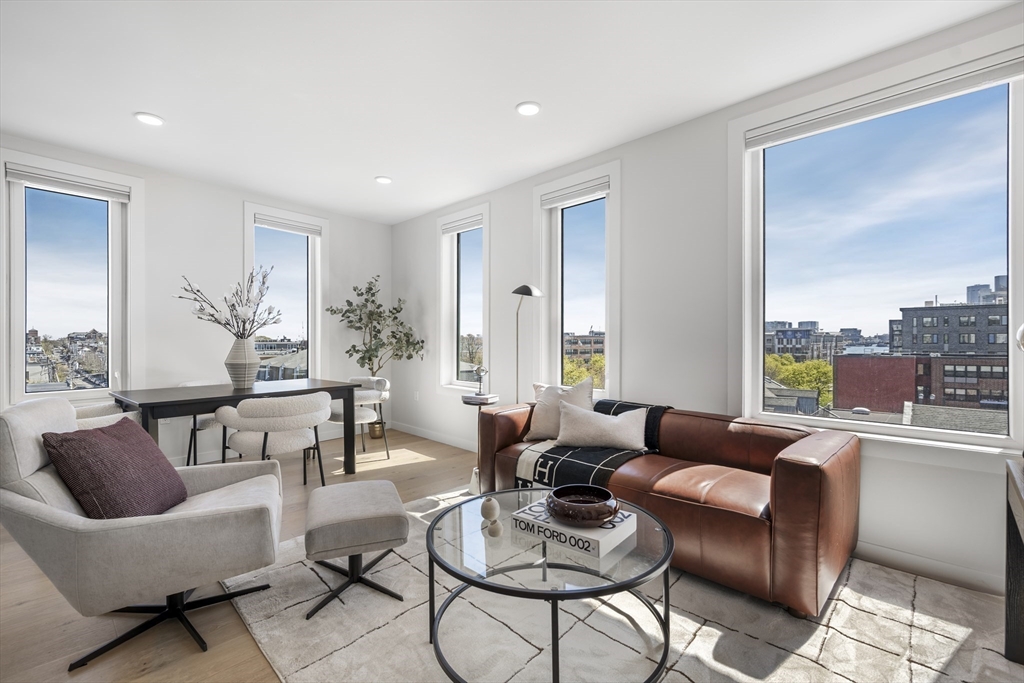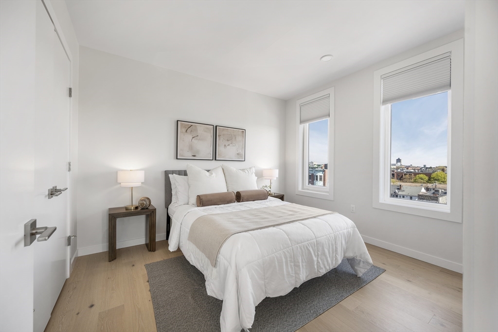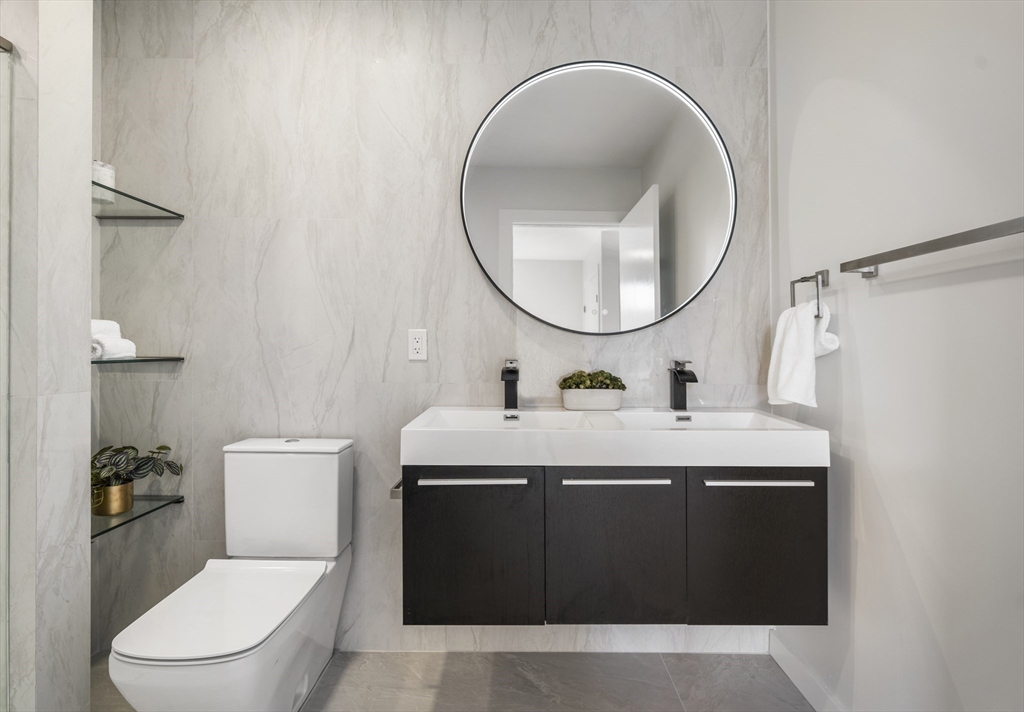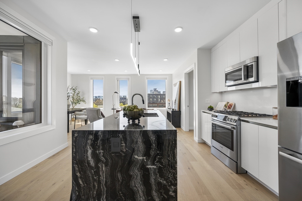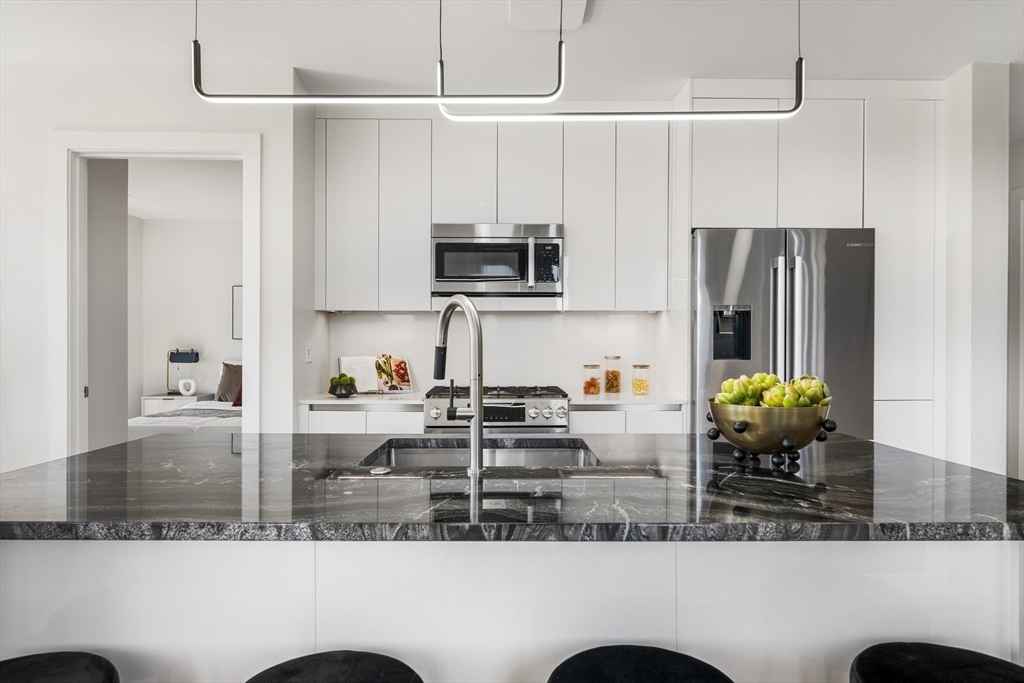 Looking for luxury AND convenience? 2 Maverick Sq presents an unmatched opportunity to live adjacent to East Boston's desirable waterfront and directly across from the Maverick T Station in the heart of Maverick Square in Jeffries Point. Unit 401 is a corner residence with PRIVATE outdoor space. Oversized windows provide tons of natural light throughout the day. Open concept floor plan. Kitchen with Quartz waterfall island, stainless appliances + slab cabinetry. Separate dining nook. Private deck with views of Boston Harbor. Two large bedrooms including Primary with en suite bath, floating vanity + frameless glass waterfall shower. Hardwood and recessed lighting throughout. Central Air, In-Unit Laundry. Professionally managed elevator building with secure entry into beautiful lobby.