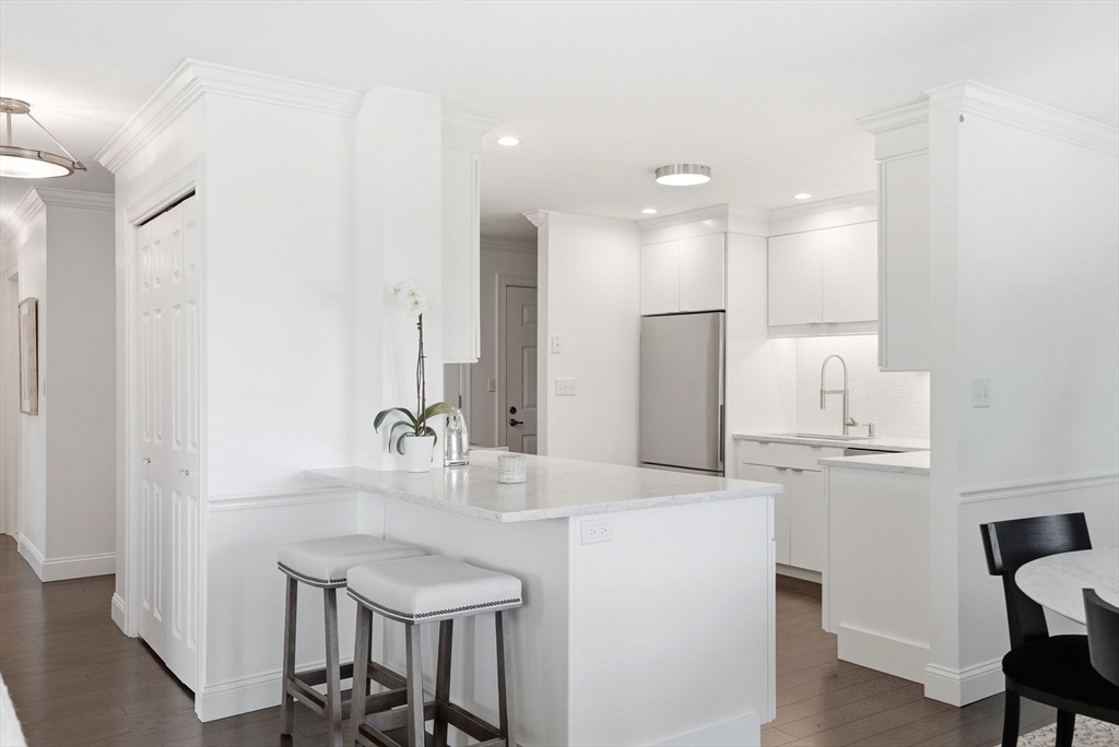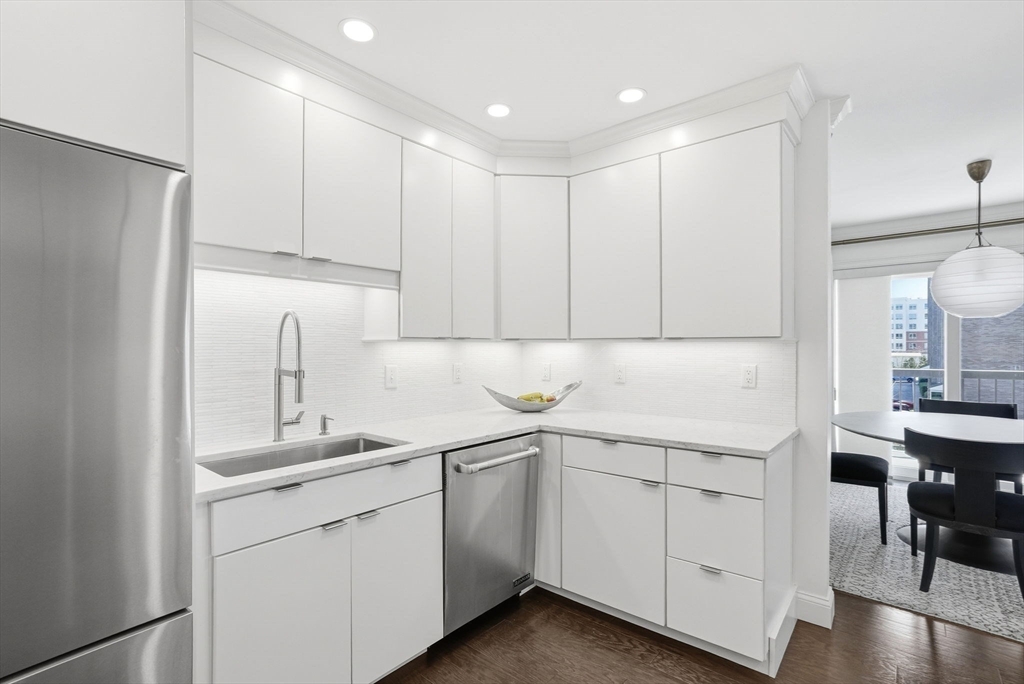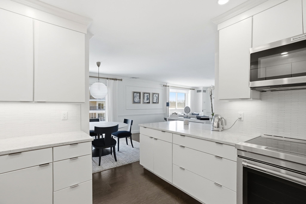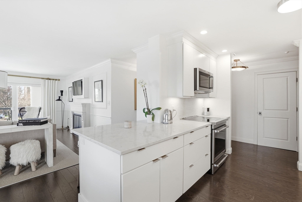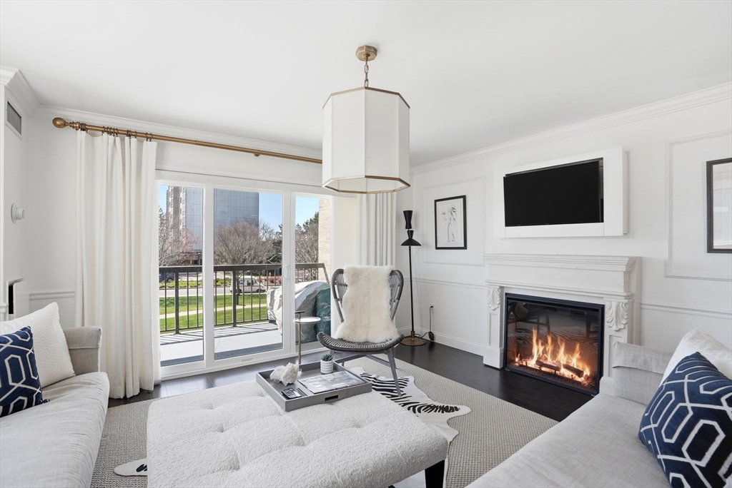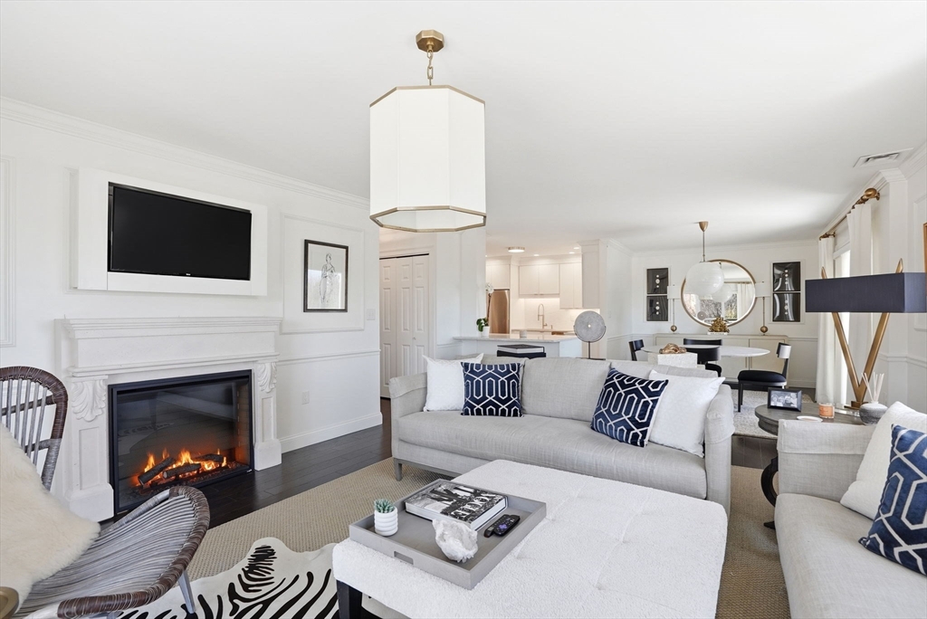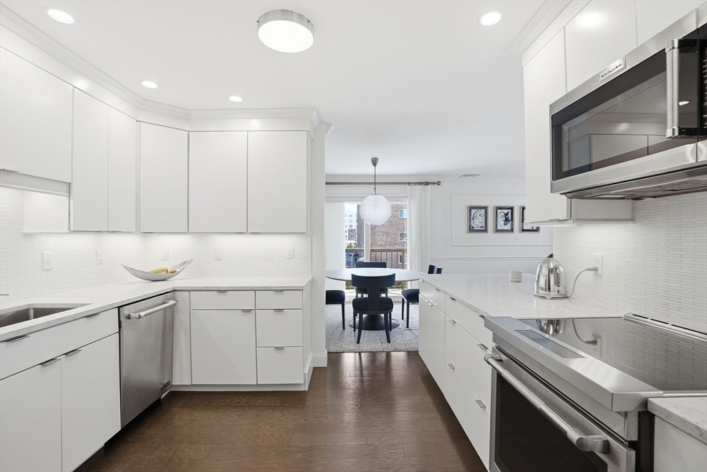 Stunning, private corner unit in sought after waterfront East Bay condominiums. Step inside to discover sunny spaces, an open floor plan, and architectural detail throughout. The welcoming foyer opens to a beautifully renovated residence seamlessly connecting the interior to the outdoors with views from two balconies. A generously sized chef's kitchen with quartz counters, stainless appliances, and a breakfast bar for sipping morning coffee. A wall of glass in the elegant dining room leads to a spacious balcony. The fireplaced living room with additional open space to the 2nd balcony is perfect for entertaining. The beautifully decorated primary suite includes double closets and a luxurious full bath. A second bedroom with full bath. For those seeking timeless design, every detail from the lighting to the flooring is elegant. East Bay offers beautiful common areas, elevators from the assigned garage parking, and waterfront al fresco dining. Minutes to the beach, Webb Park and Ferry.