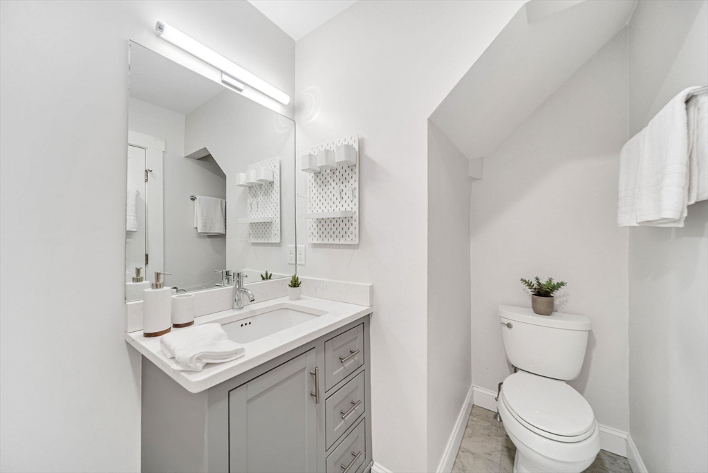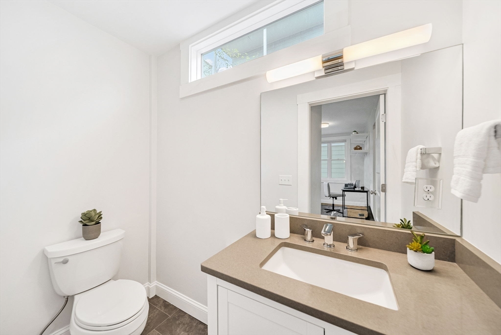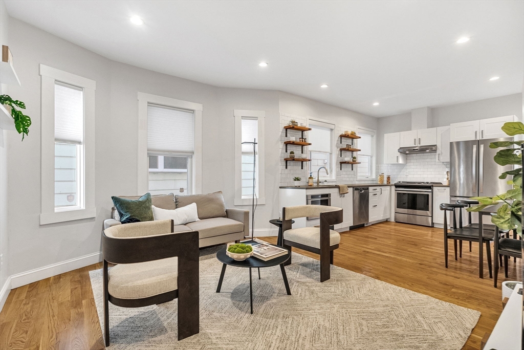 Beautifully gut-renovated in 2018, this 3-bedroom, 1.5-bath condo in a 3-unit building is minutes from Kendall, MIT, and Inman Square. Set on the first floor with easy access, the home offers three true bedrooms, a bonus office/den overlooking the shared backyard, and private basement storage—flexible space to live, work, and grow. The open-concept layout features white oak hardwood throughout and an easy flow to the kitchen with quartz countertops, shaker cabinets, subway tile backsplash, and JennAir under-counter microwave drawer. Energy-efficient upgrades include York central HVAC, Navien tankless water heater, in-unit LG washer/dryer, Energy Star appliances, Harvey windows, CertainTeed siding, and a 2020 rooftop solar system offsetting utility bills by $1,500/year. With Donnelly Field at your doorstep, enjoy green space, ample street parking, pool, library, playgrounds, restaurants, and cafes nearby. 10-minute walk to Kendall, 15 to Inman. Walk Score 94, Bike Score 99