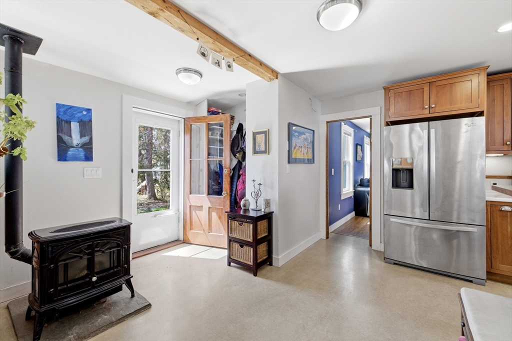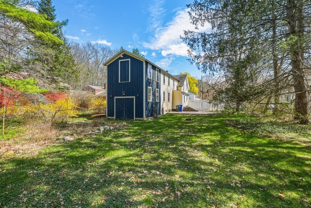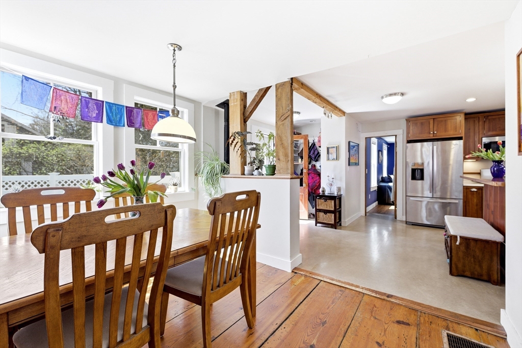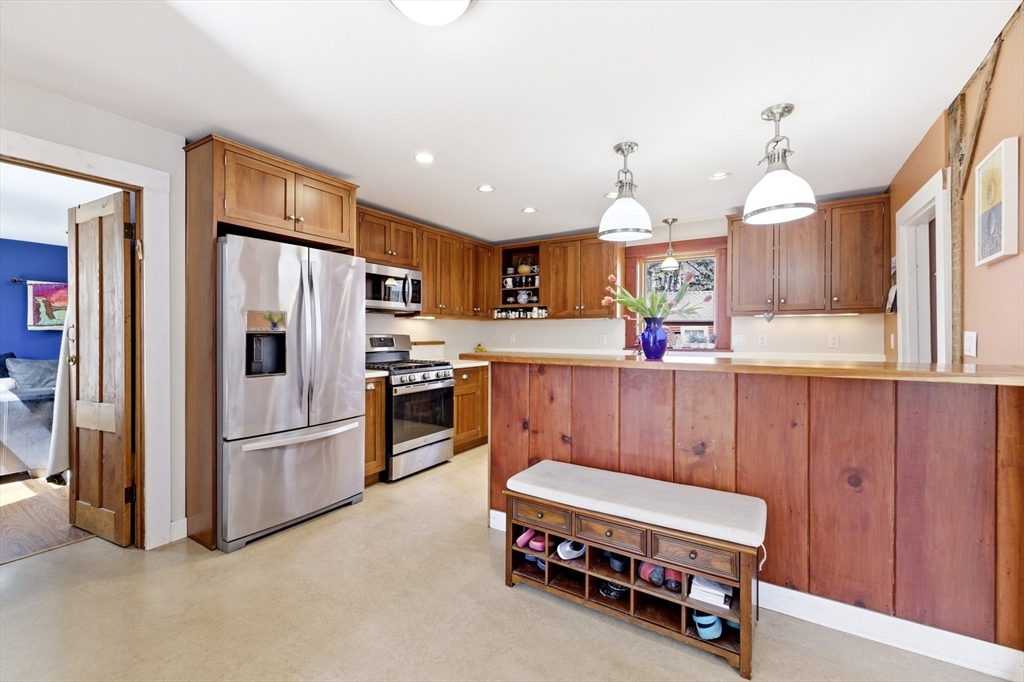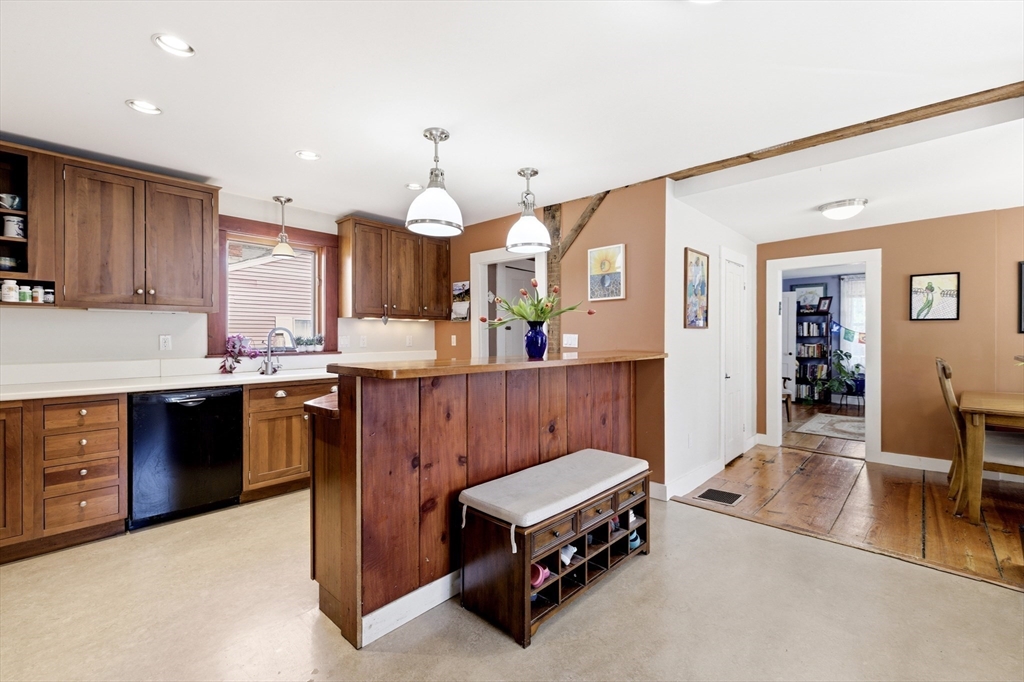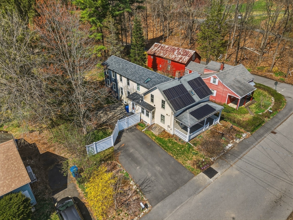Traditional 4 bed/2.5 bath farmhouse with modern updates! The renovated kitchen offers abundant cabinetry & workspace w/ peninsula seating & a cozy dining area.The main level features a versatile family room or guest space w/ half bath, a welcoming living room & a dedicated office or dining rm. Rich wood flooring runs throughout much of the home. Upstairs, three original bedrooms alongside a spacious primary bedroom with spa-like ensuite bath, huge walk-in closet & propane stove. Extras: owned solar panels, pellet stove, newer water heater and asphalt driveway. Enjoy peaceful mornings on the front porch or custom paver patio, afternoons in the garden and open space of the large yard. A contemporary, attached barn provides additional storage. Puffers Pond & its waterfall dam are across the street, as are several wooded paths. Close to Mill River Recreation area with its outdoor summer pool, the vibrant Mill-District, UMass and Amherst Center. Showings begin @ Friday Open House 4:30-6pm.