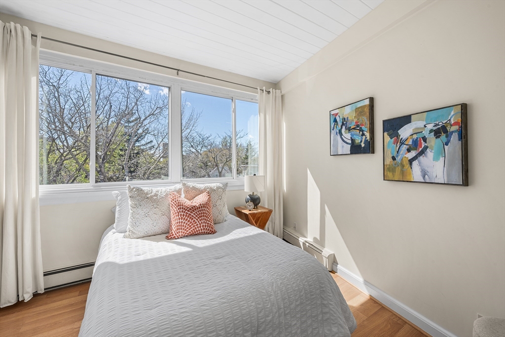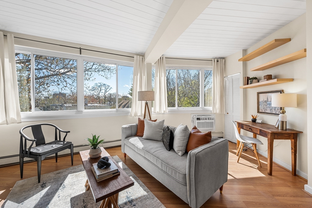 Perched on the top floor of the iconic “Round Building” in Cambridge’s highly desirable Riverside neighborhood, this bright & inviting 2-bedroom condo offers a rare blend of style, convenience, & location. Sunlight pours into every room through oversized windows, creating an airy, open feel throughout the thoughtfully designed living room & kitchen space—perfect for both everyday living & entertaining. The renovated kitchen features maple cabinetry, granite countertops, & stainless steel appliances, seamlessly connecting to the main living area. Additional amenities include 2 window ACs, common laundry, bike storage, & a deeded covered parking space (#5), with a modest annual maintenance fee. The professionally managed association ensures peace of mind & well-maintained common areas with a lower condo fee for owner-occupants. Ideally located just minutes from Central Square & the Red Line MBTA, as well as an array of restaurants, shops, entertainment, & the scenic Charles River.