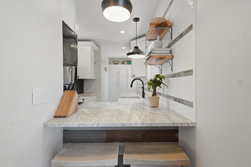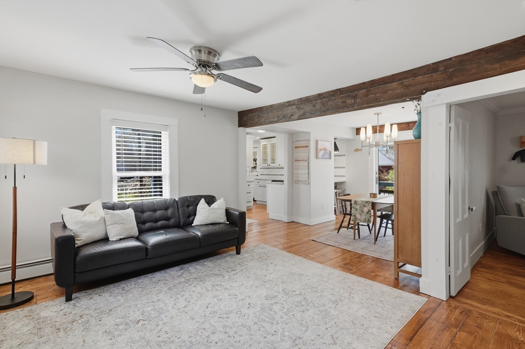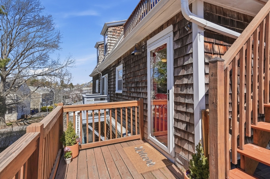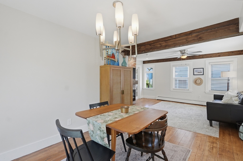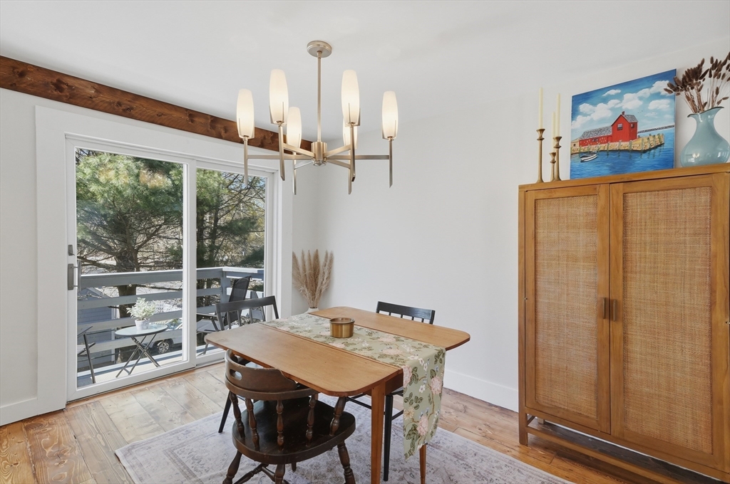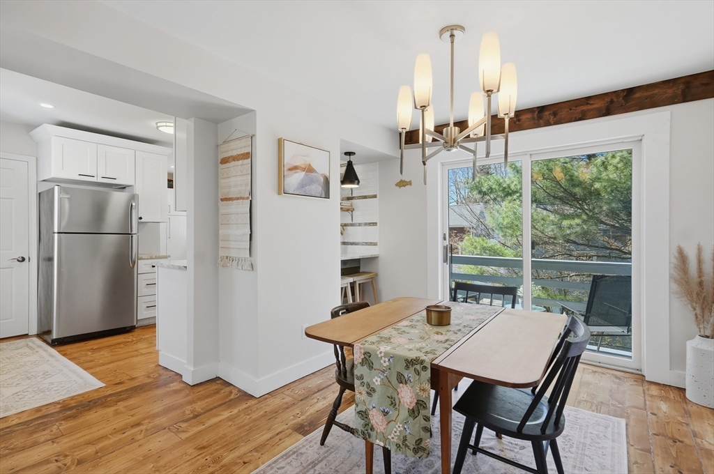 Bright and inviting 2-bedroom condo offering character, updates, and coastal lifestyle appeal in desirable Marblehead. This second-level unit features pine flooring throughout, exposed beam accents, and a comfortable open flow between the living and dining areas with a fireplace creating a welcoming focal point. The kitchen includes stone countertops, stainless appliances, breakfast bar seating, and exterior access to a private deck/balcony. Both bedrooms are well-proportioned with great natural light, and in-unit laundry adds convenience. Recent improvements include refinished and treated flooring (2024), freshly painted walls and trim (2024), new dishwasher, storm door, and window blinds. Enjoy close proximity to Marblehead’s historic downtown, beaches, shops, restaurants, parks, and scenic harbor areas, an excellent opportunity to enjoy North Shore living.