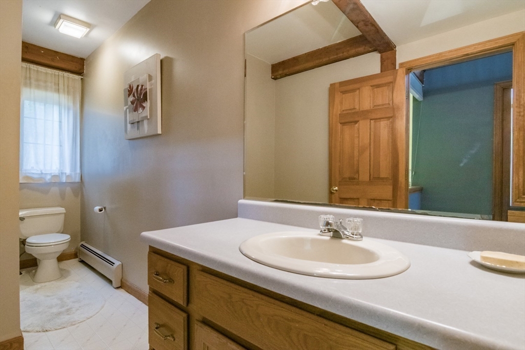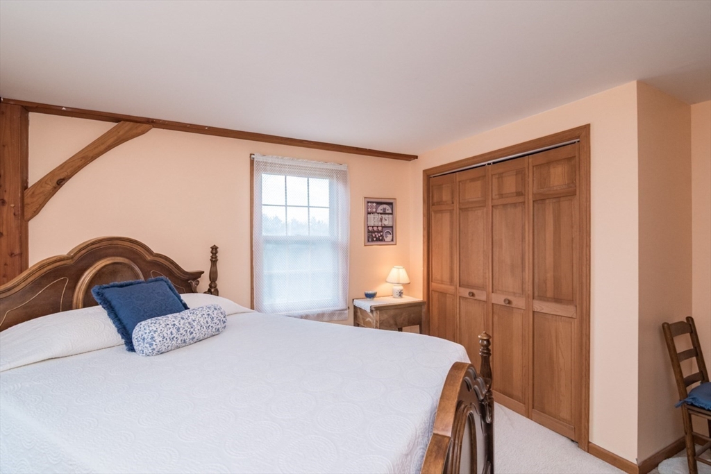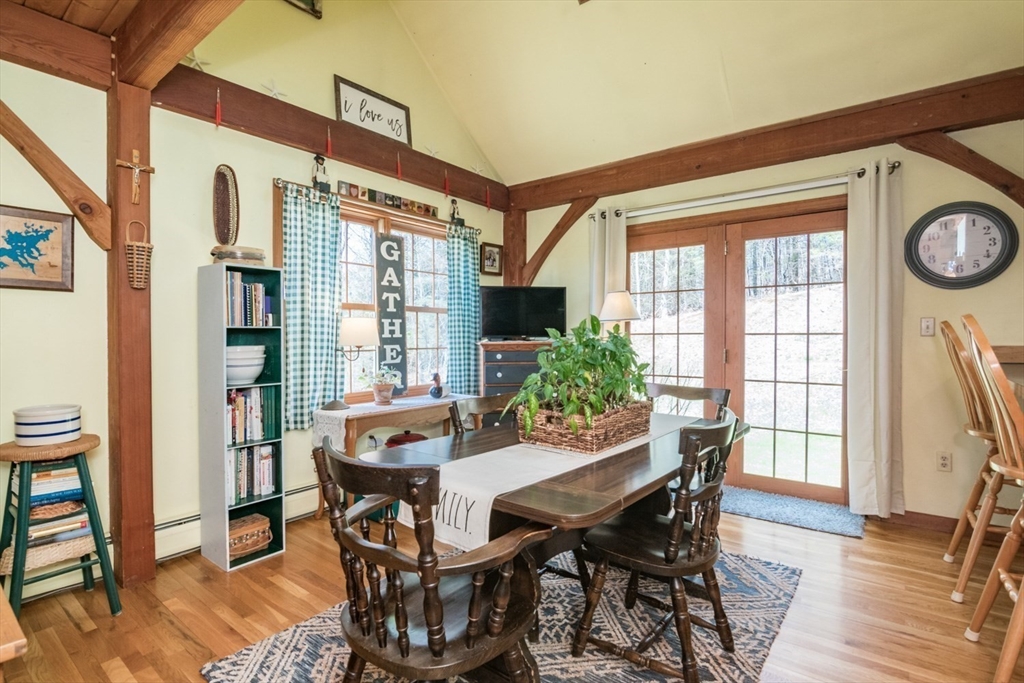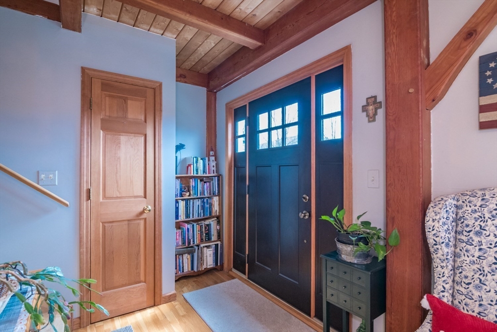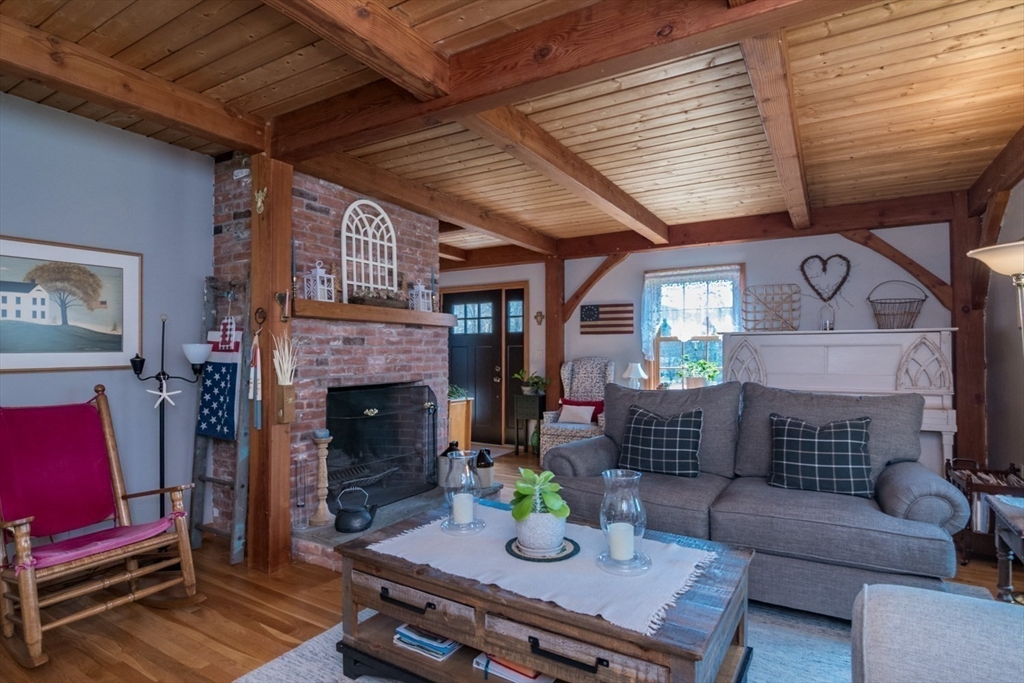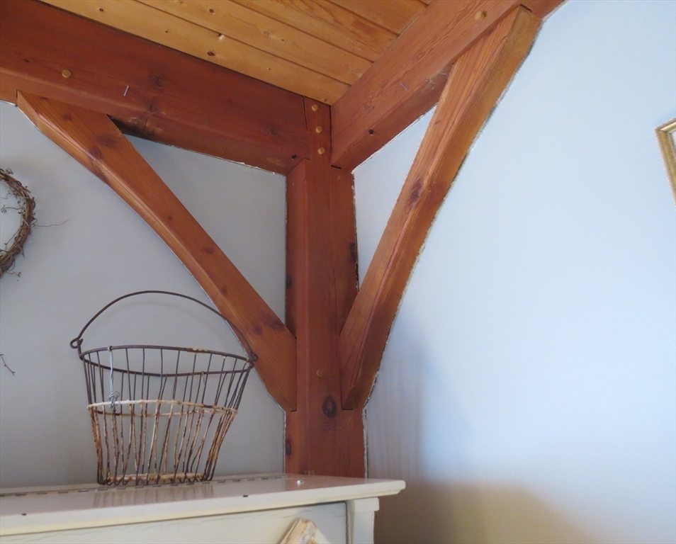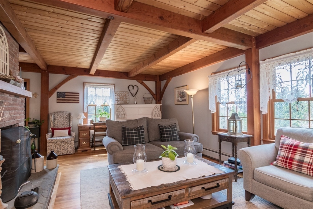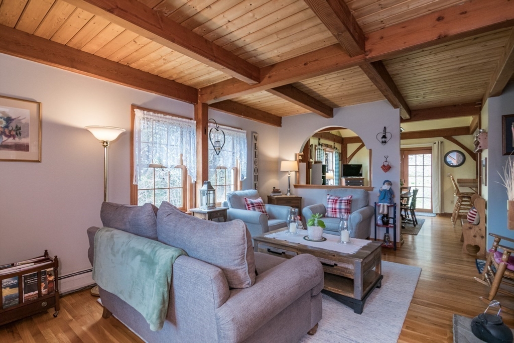 Custom-built Post & Beam Saltbox has been lovingly cared for by its original owners. Centered by a beautiful working fireplace w/raised stone hearth in the spacious livingroom, the main level features hardwood floors, beamed ceilings and lots of natural sunlight. The adjacent diningroom showcases a half cathedral ceiling w/skylight and French door to rear yard. DR is also open to the kitchen w/ ample cabinets & counters, a peninsula breakfast bar and pantry closet. A hallway offers separation for the roomy den or study, that could also be utilized as a bedroom. The first-floor bath w/laundry offers convenience along with the slate floored side entrance. Second level primary BR suite w/ full bath, loft space & walk-in closet has exposed brick chimney & cathedral ceiling. Two more BRS and full bath also on the 2nd floor. Lower level has good storage area as well as a bright and comfortable family room w/full size windows and slider to exterior. Southern exposure,elevated setting w/views.