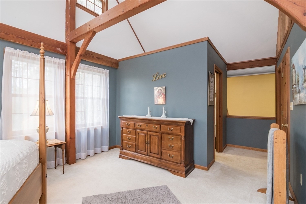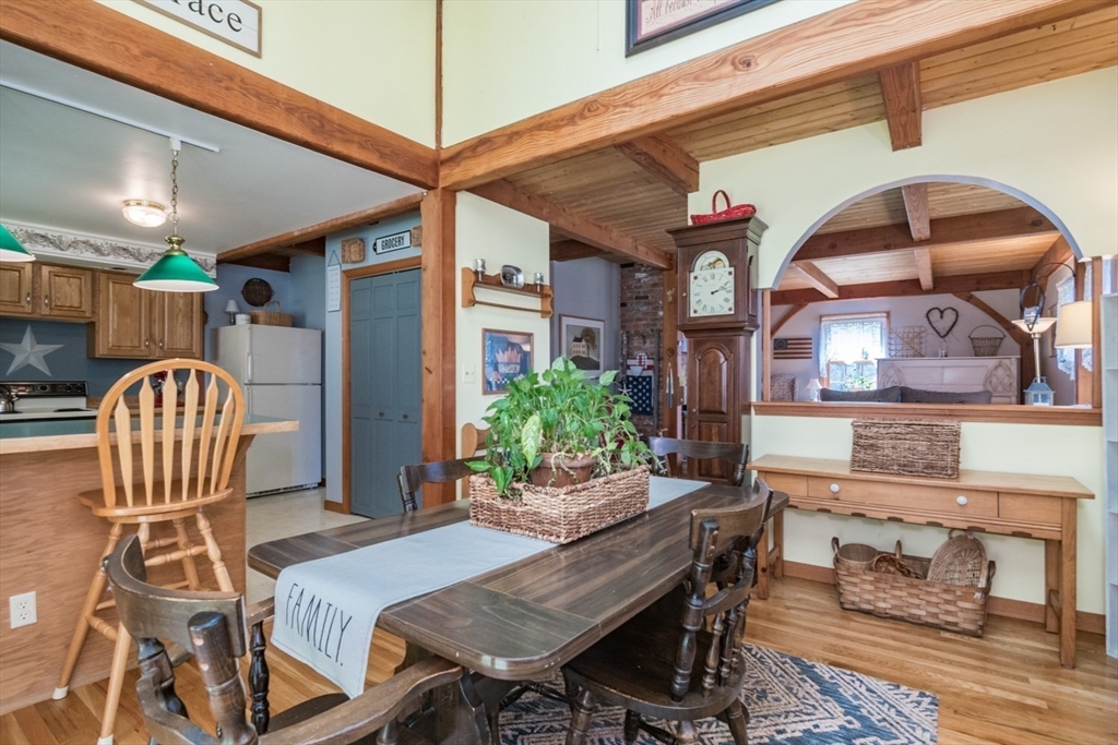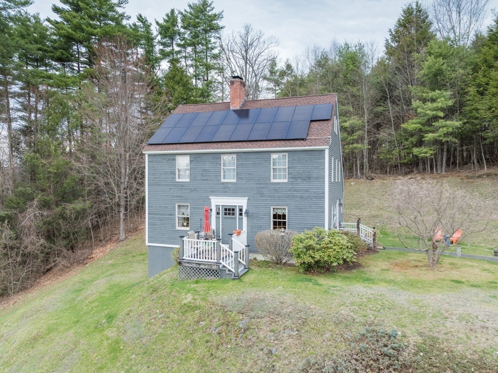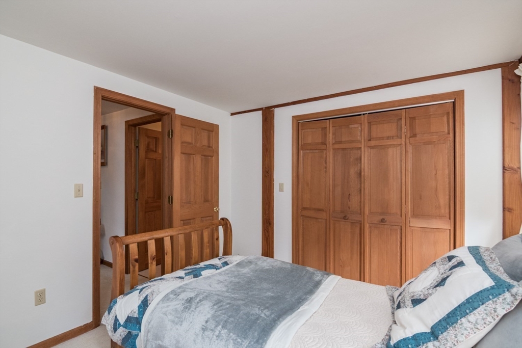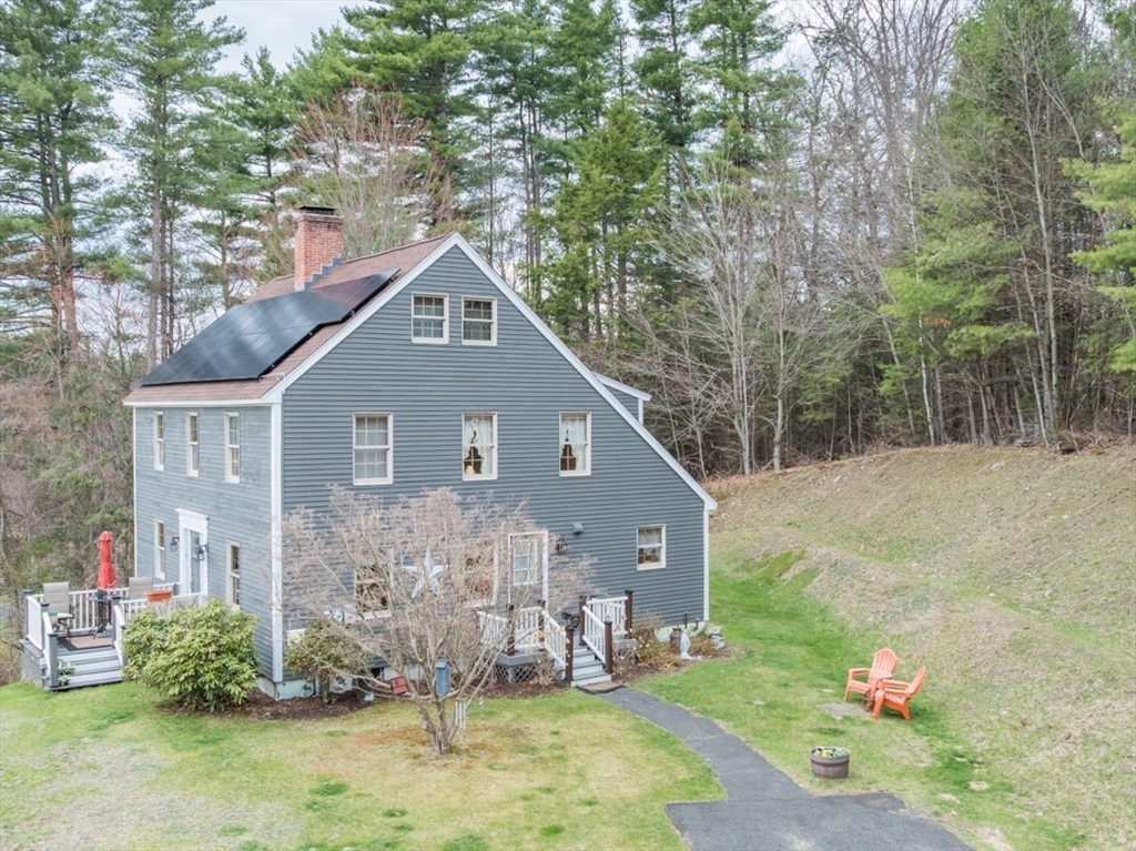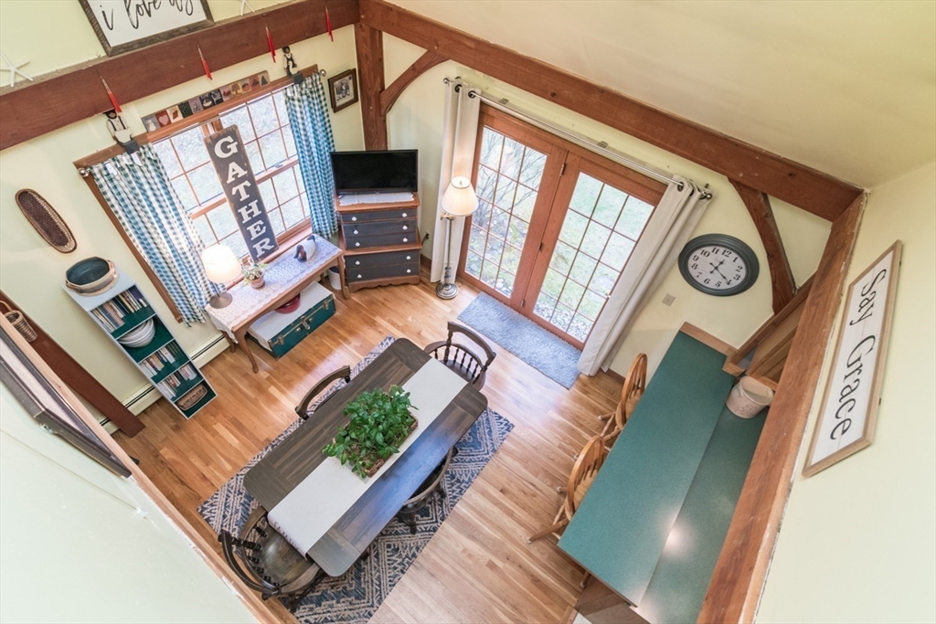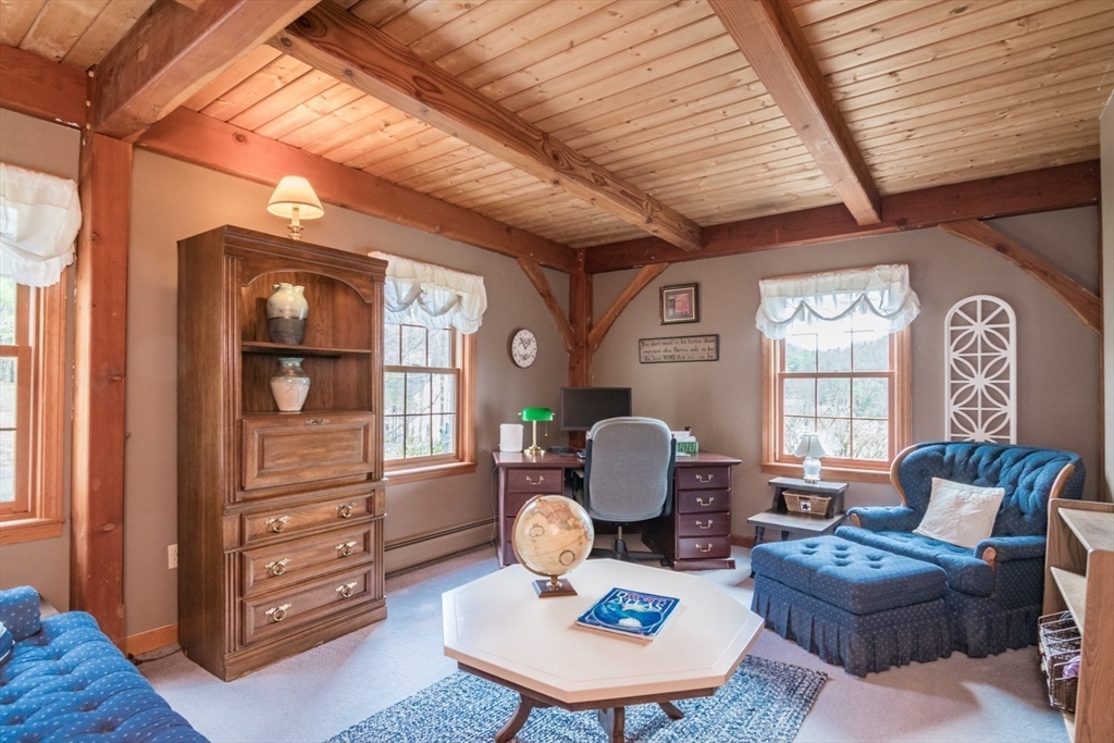 Custom-built Post & Beam Saltbox has been lovingly cared for by its original owners. Centered by a beautiful working fireplace w/raised stone hearth in the spacious livingroom, the main level features hardwood floors, beamed ceilings and lots of natural sunlight. The adjacent diningroom showcases a half cathedral ceiling w/skylight and French door to rear yard. DR is also open to the kitchen w/ ample cabinets & counters, a peninsula breakfast bar and pantry closet. A hallway offers separation for the roomy den or study, that could also be utilized as a bedroom. The first-floor bath w/laundry offers convenience along with the slate floored side entrance. Second level primary BR suite w/ full bath, loft space & walk-in closet has exposed brick chimney & cathedral ceiling. Two more BRS and full bath also on the 2nd floor. Lower level has good storage area as well as a bright and comfortable family room w/full size windows and slider to exterior. Southern exposure,elevated setting w/views.