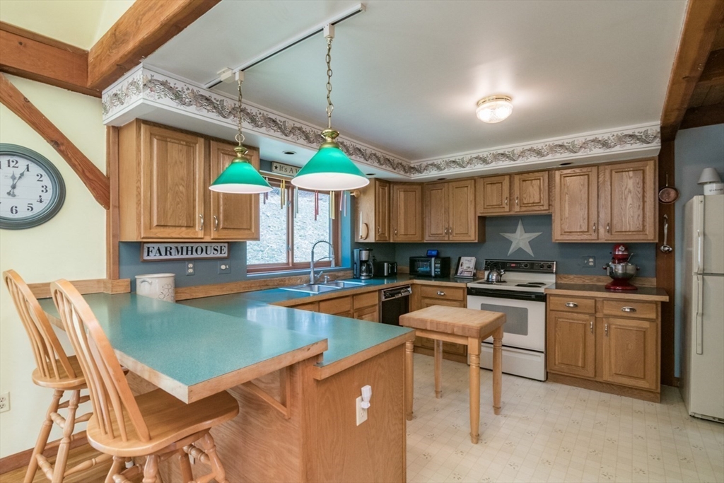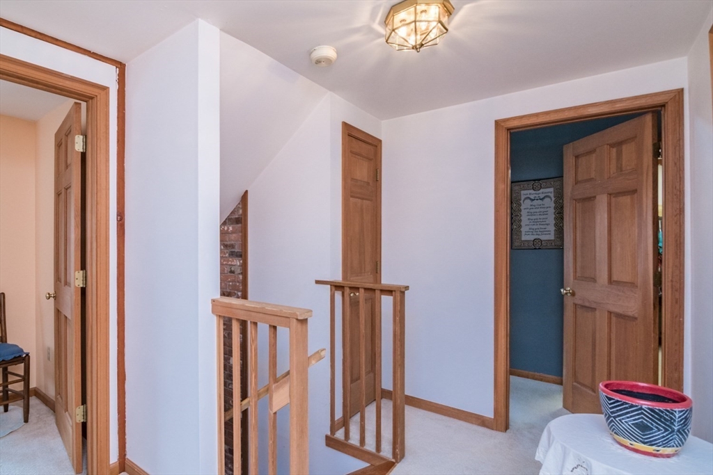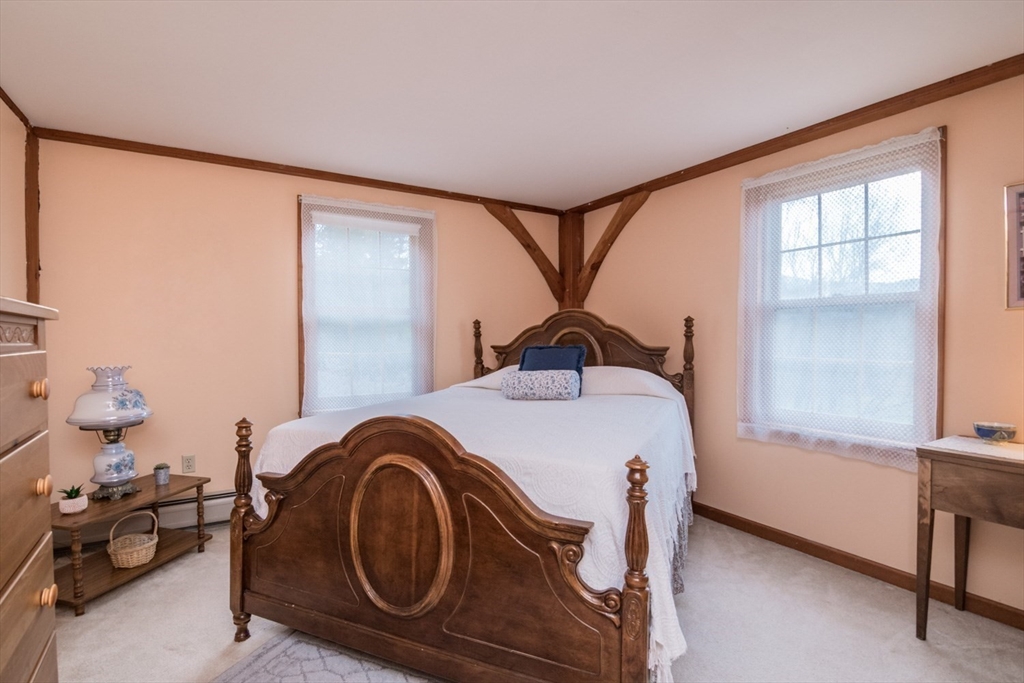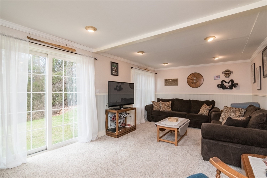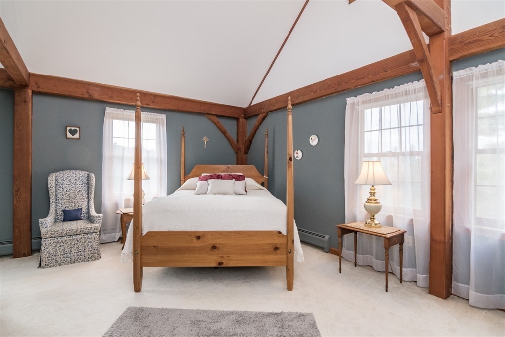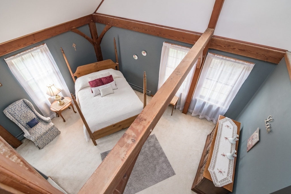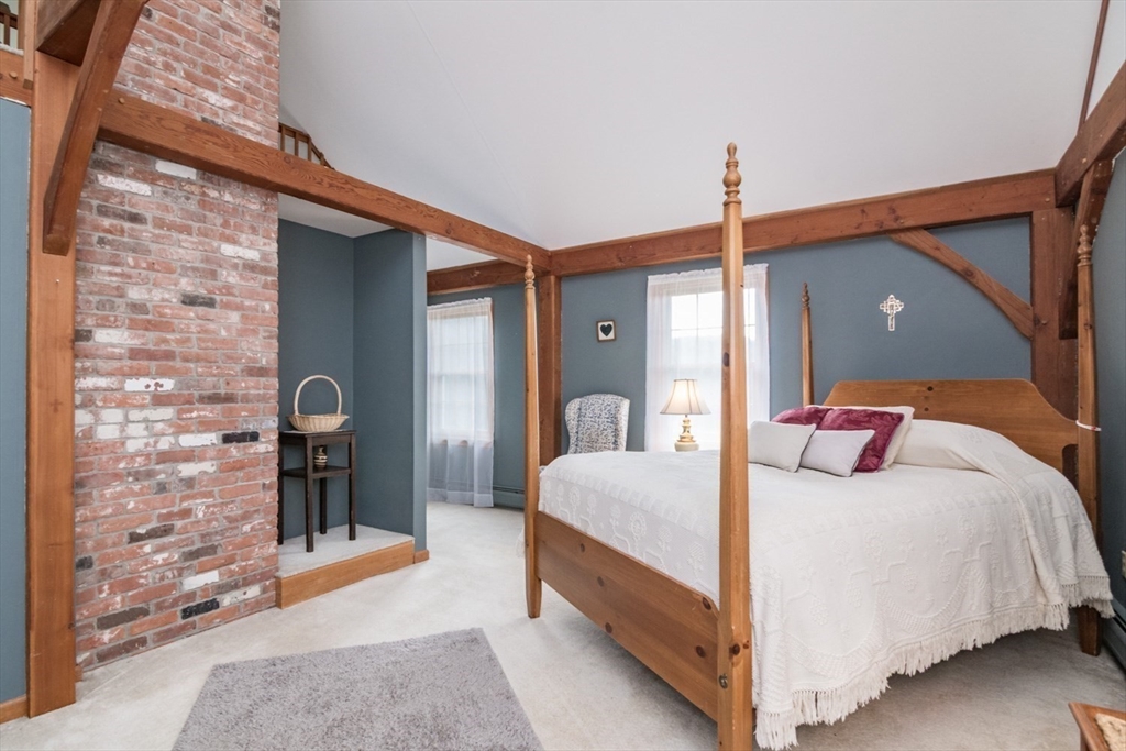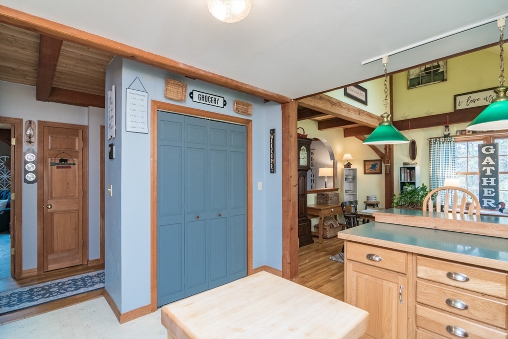 Custom-built Post & Beam Saltbox has been lovingly cared for by its original owners. Centered by a beautiful working fireplace w/raised stone hearth in the spacious livingroom, the main level features hardwood floors, beamed ceilings and lots of natural sunlight. The adjacent diningroom showcases a half cathedral ceiling w/skylight and French door to rear yard. DR is also open to the kitchen w/ ample cabinets & counters, a peninsula breakfast bar and pantry closet. A hallway offers separation for the roomy den or study, that could also be utilized as a bedroom. The first-floor bath w/laundry offers convenience along with the slate floored side entrance. Second level primary BR suite w/ full bath, loft space & walk-in closet has exposed brick chimney & cathedral ceiling. Two more BRS and full bath also on the 2nd floor. Lower level has good storage area as well as a bright and comfortable family room w/full size windows and slider to exterior. Southern exposure,elevated setting w/views.