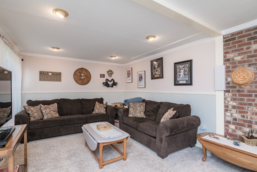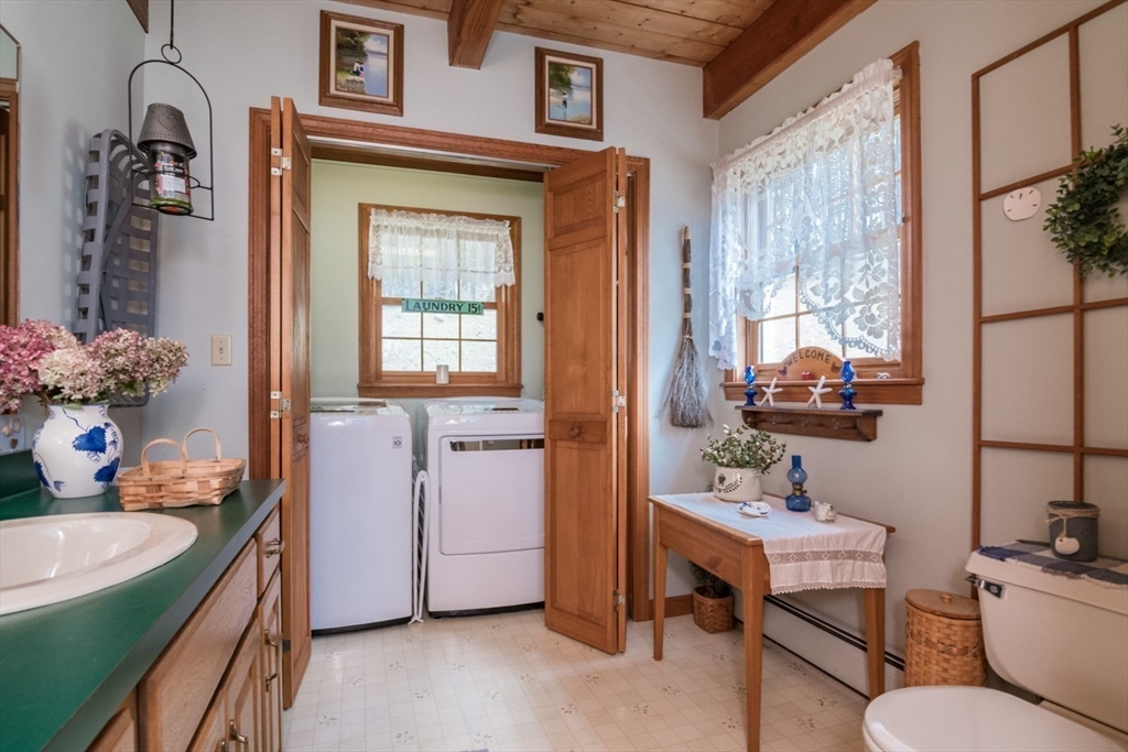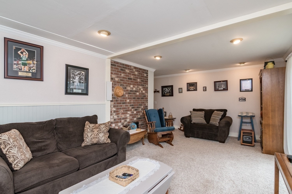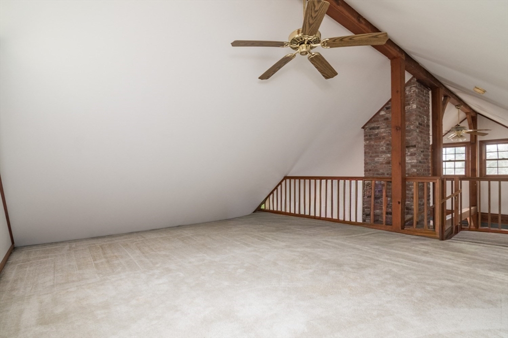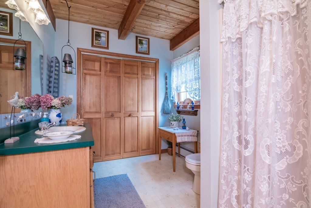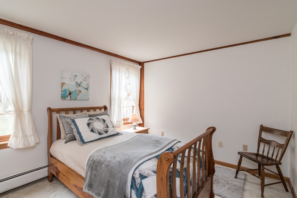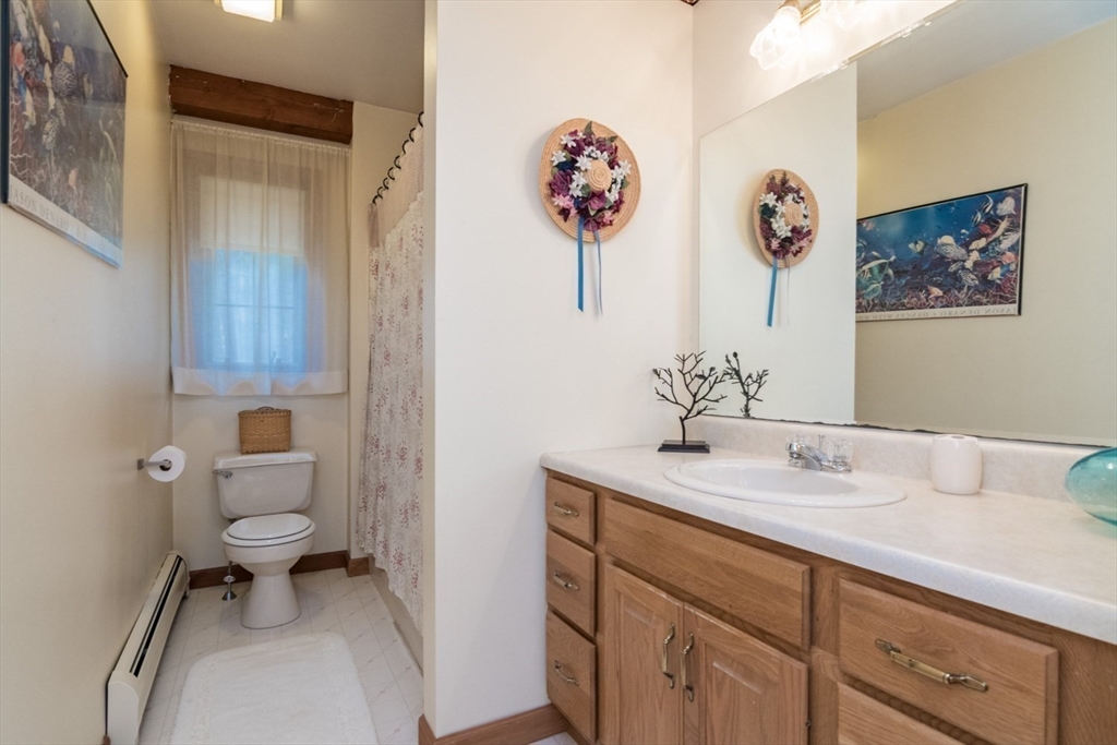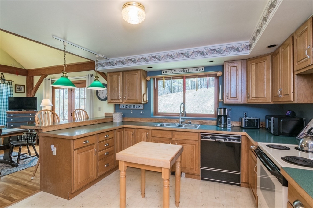 Custom-built Post & Beam Saltbox has been lovingly cared for by its original owners. Centered by a beautiful working fireplace w/raised stone hearth in the spacious livingroom, the main level features hardwood floors, beamed ceilings and lots of natural sunlight. The adjacent diningroom showcases a half cathedral ceiling w/skylight and French door to rear yard. DR is also open to the kitchen w/ ample cabinets & counters, a peninsula breakfast bar and pantry closet. A hallway offers separation for the roomy den or study, that could also be utilized as a bedroom. The first-floor bath w/laundry offers convenience along with the slate floored side entrance. Second level primary BR suite w/ full bath, loft space & walk-in closet has exposed brick chimney & cathedral ceiling. Two more BRS and full bath also on the 2nd floor. Lower level has good storage area as well as a bright and comfortable family room w/full size windows and slider to exterior. Southern exposure,elevated setting w/views.