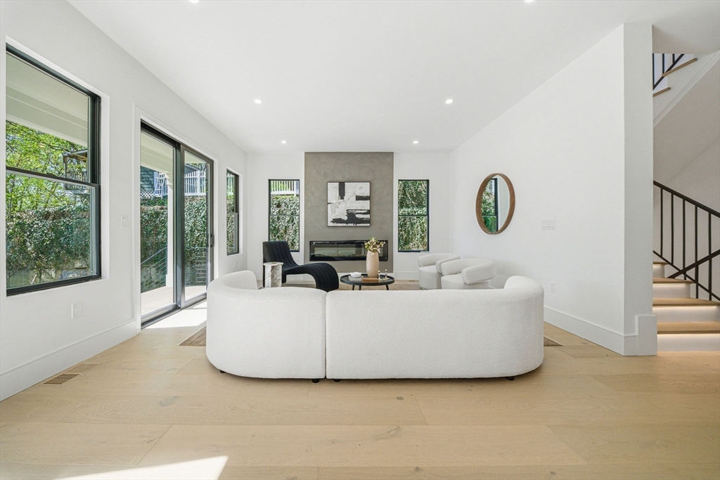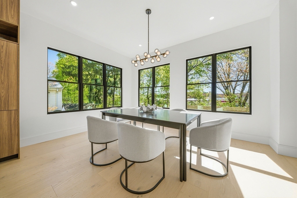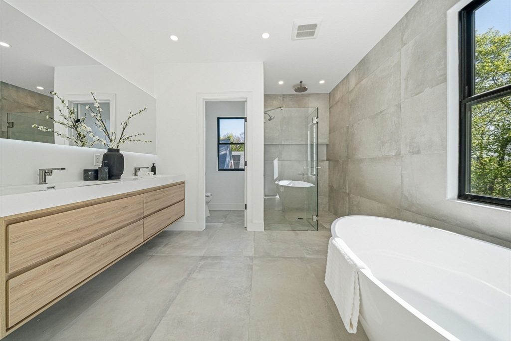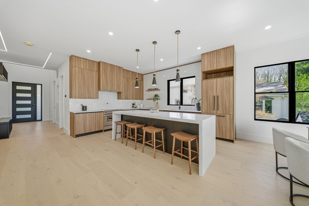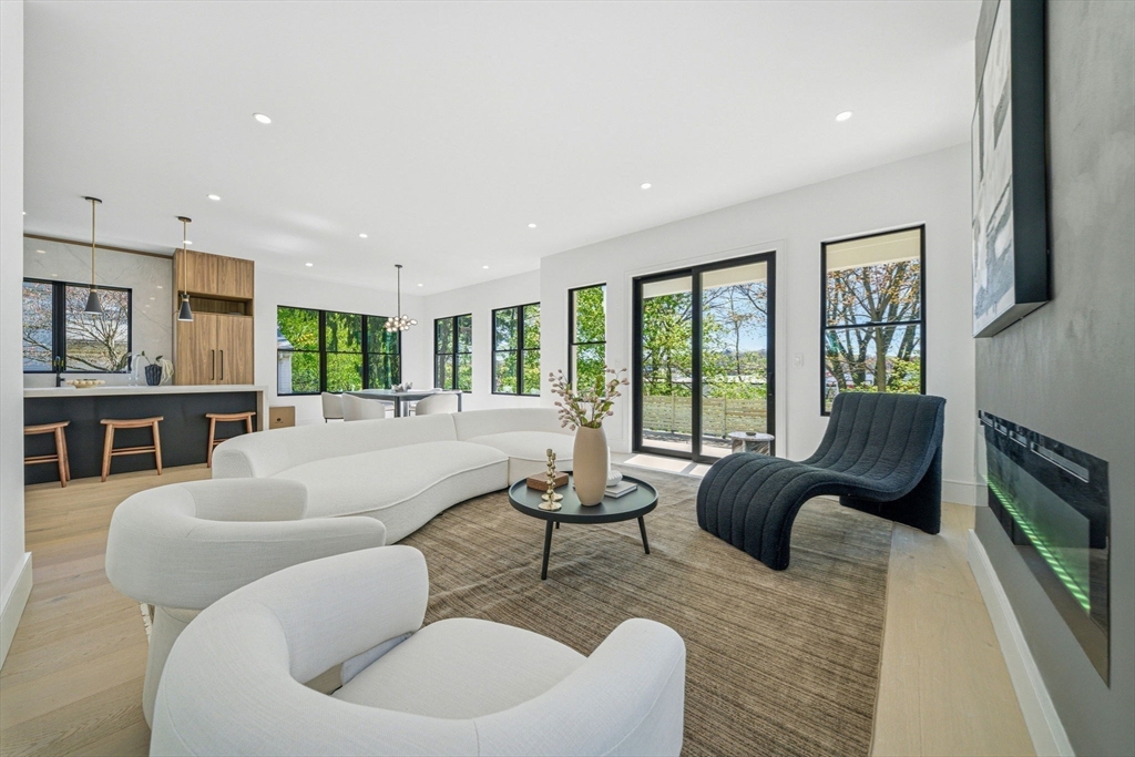 New construction in desirable Newton Upper Falls, offering 5 bedrooms, 5 full baths, and 1 half bath, across approximately 4,950 sq ft of thoughtfully designed living space. This exceptional home features 3 finished levels plus a fully finished lower level. The main level offers soaring 10-foot ceilings, expansive sun-filled living and dining areas, and an open layout ideal for modern living. The designer kitchen flows seamlessly into spacious family areas and outdoor access. Upper levels include generously sized bedrooms, multiple private baths, and flexible living spaces. Attached garage parking adds convenience. Ideally located near Needham Street shopping, dining, major commuter routes, public transportation, and scenic backyard walking trails—a rare opportunity for sophisticated new construction in Newton.