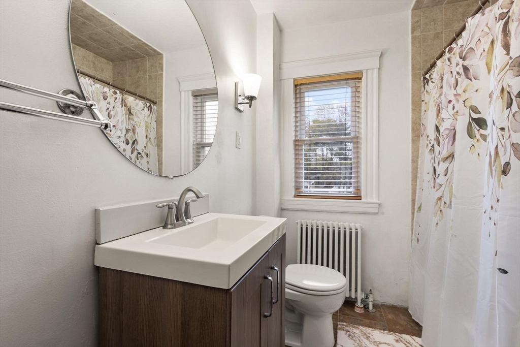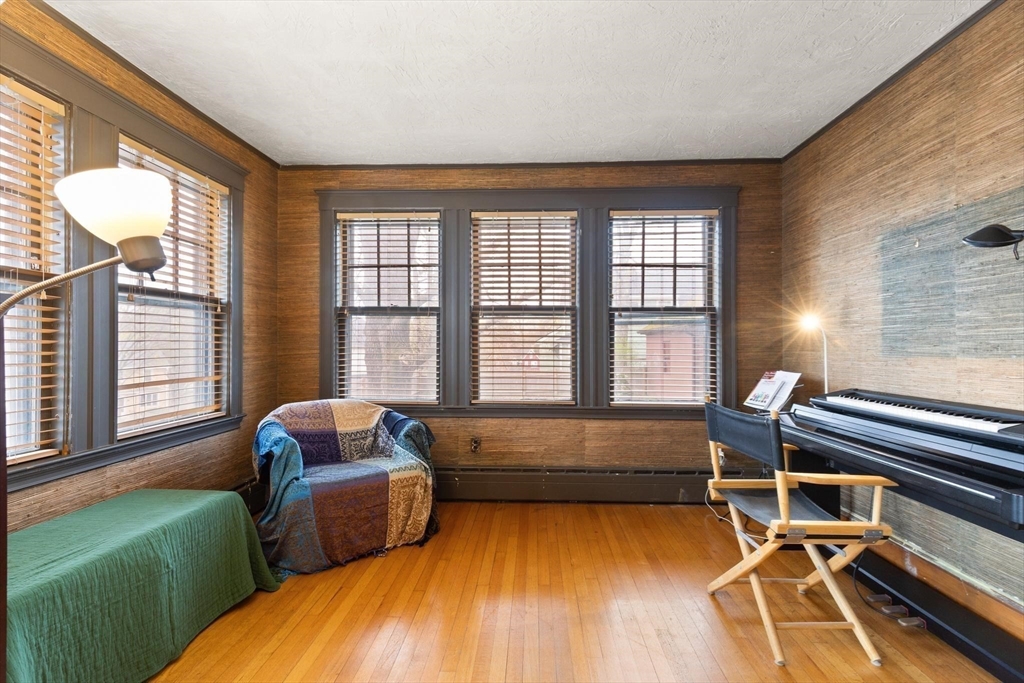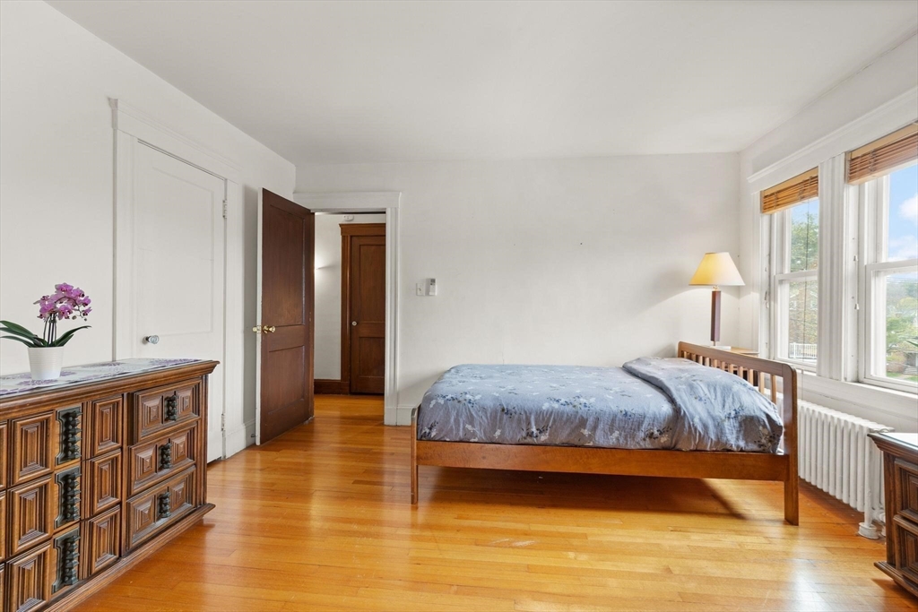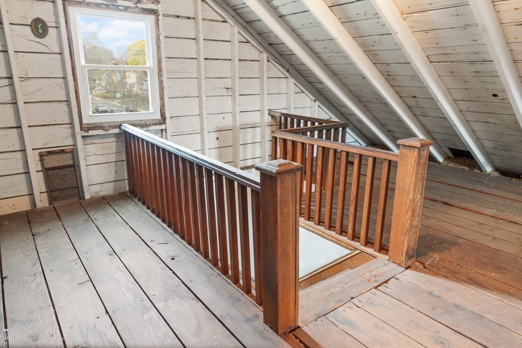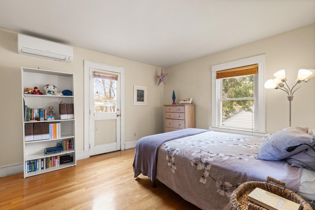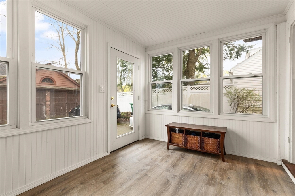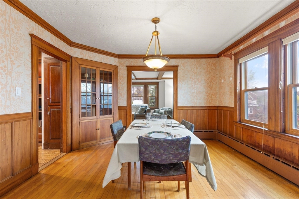 Charming Tudor-style home in a highly sought-after location! The inviting main level offers a spacious living room with a striking beamed ceiling, wood-burning fireplace, and custom built-in cabinetry. A formal dining room with built-in hutch flows into a comfortable den. The kitchen features beamed ceilings, recessed lighting, and stainless-steel appliances. Enjoy the recently renovated 3-season porch with seamless access to a large, fenced backyard complete with patio. Upstairs offers 3 generous bedrooms, 2 dedicated home office rooms, a full bath, and abundant closet space. A large walk-up attic provides exciting expansion potential, and the finished basement adds valuable extra space. Additional highlights include a detached 2-car garage and impressive energy-efficient upgrades such as replacement windows, solar panels, and mini-split systems. Ideally located within walking distance to the West Medford Commuter Rail, the Brooks School, Medford High, Victory Park and more!
