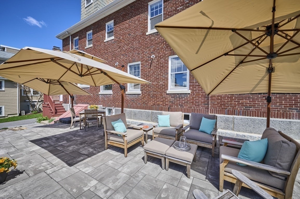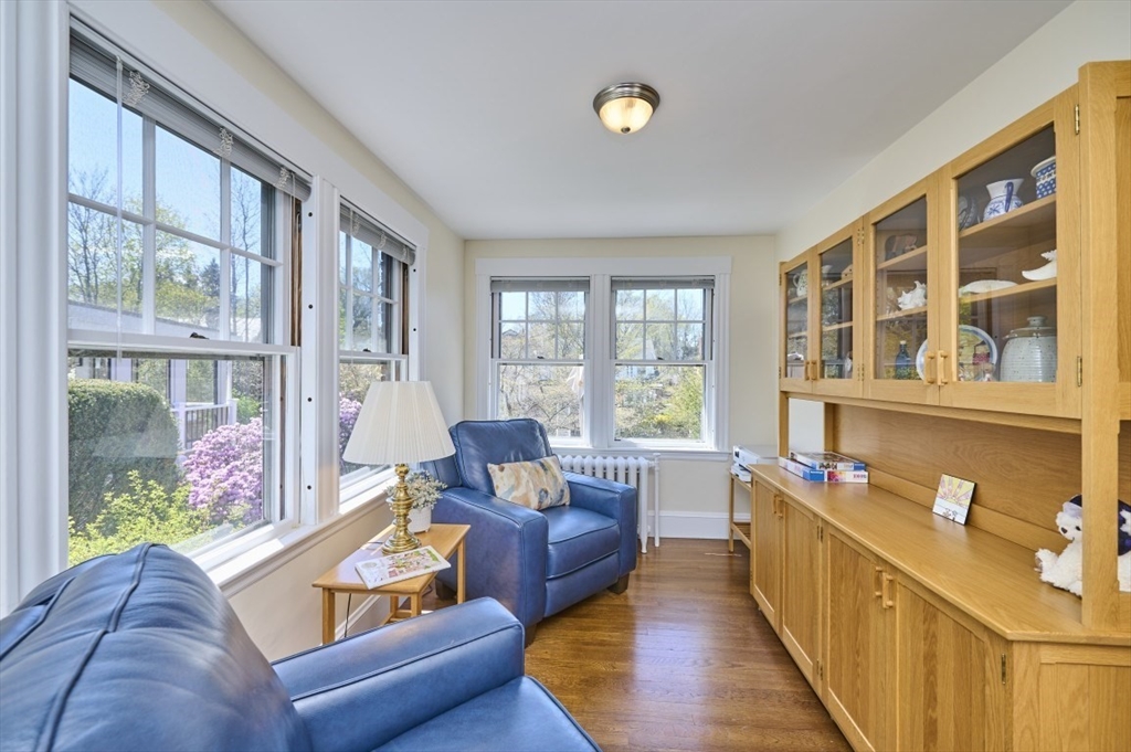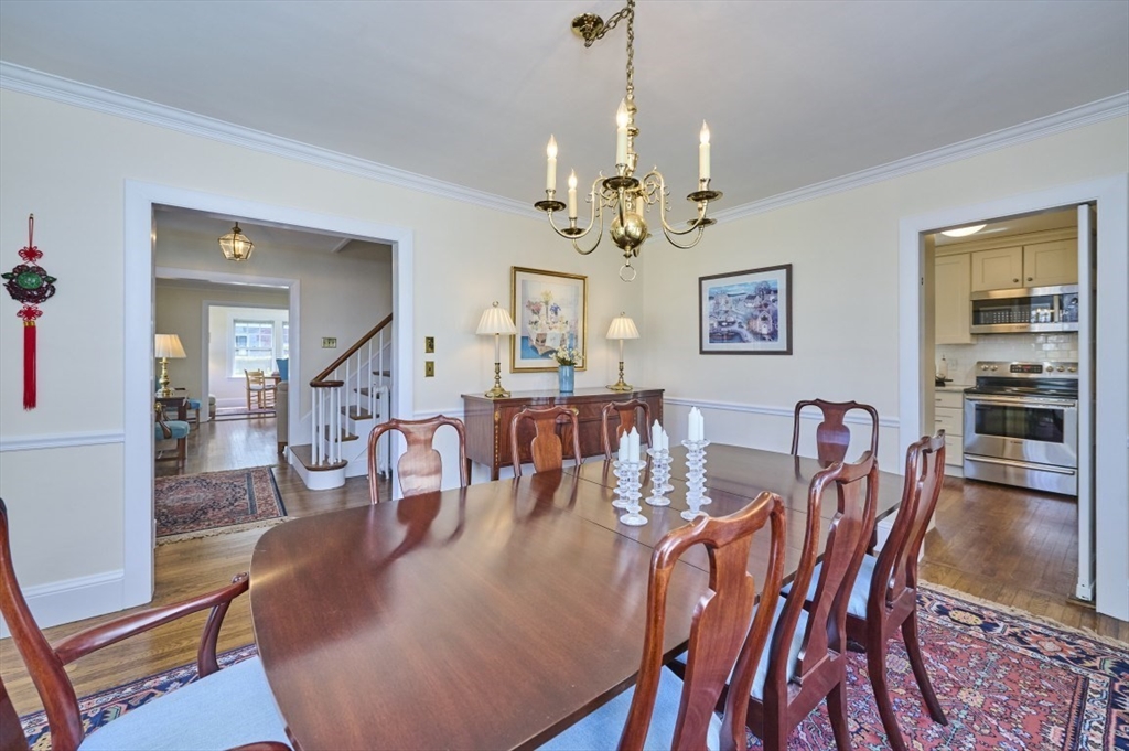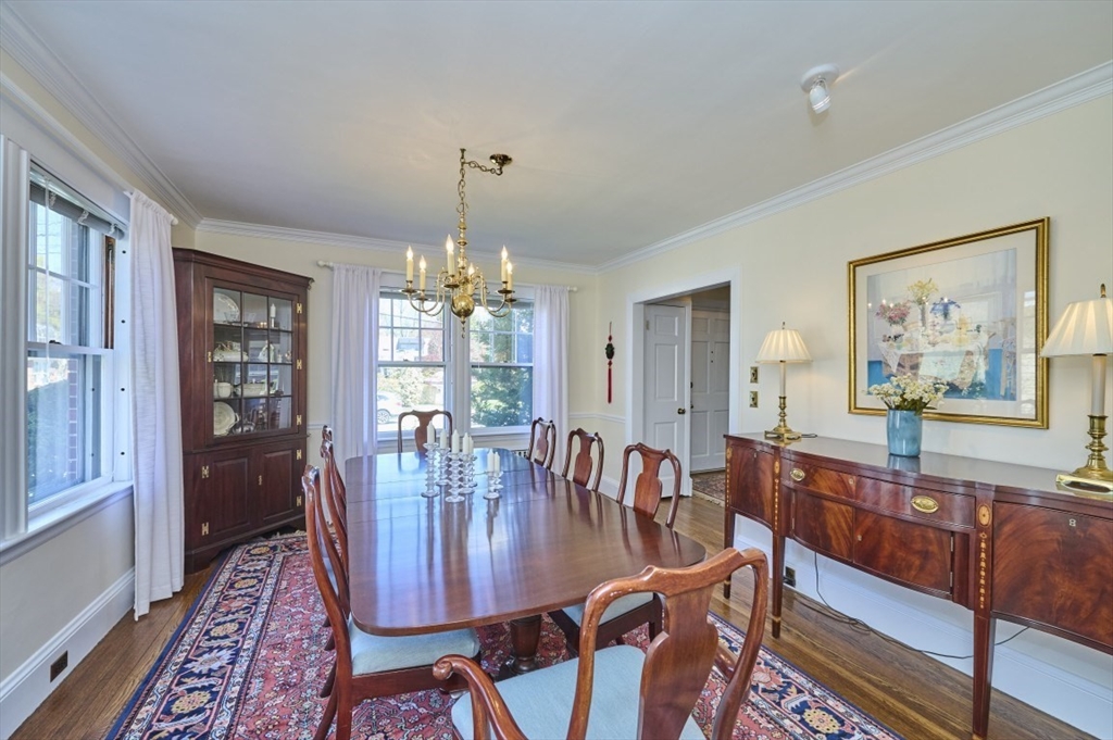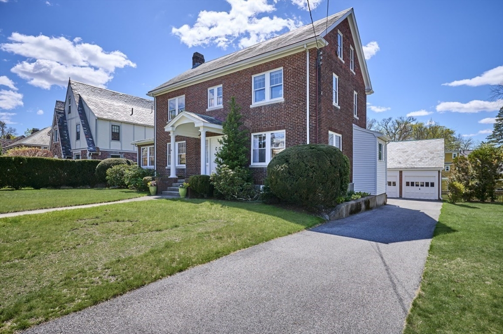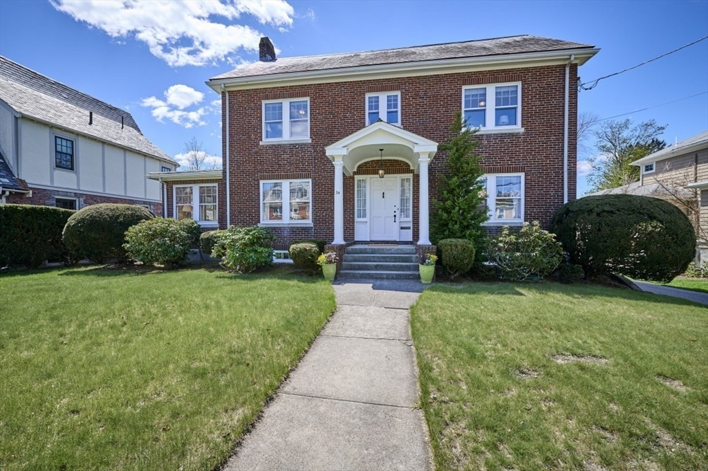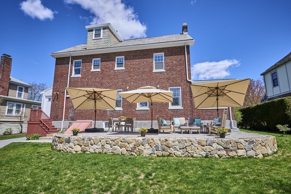 Exceptional pride of ownership throughout this classic brick Colonial in prime Newton location. Spacious front-to-back living room with fireplace opens to an inviting sun room/office. Formal dining room with molding flows into a renovated eat-in kitchen with stainless steel appliances and quartz countertops. Mudroom, closet and half bath complete the main level. Second floor features a serene primary suite with custom closet and bath, plus two additional bedrooms, full bath, cedar closet and linen closet. Third floor offers two bedrooms/offices and full bath. Flexible living space with eave storage. Entertain and relax on the oversized stone patio and yard. Brick two-car garage and driveway that holds five vehicles. Convenient to schools, parks, shops, restaurants, Mass Pike, Commuter Rail, Express bus and more. Welcome home!
