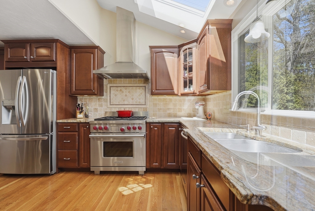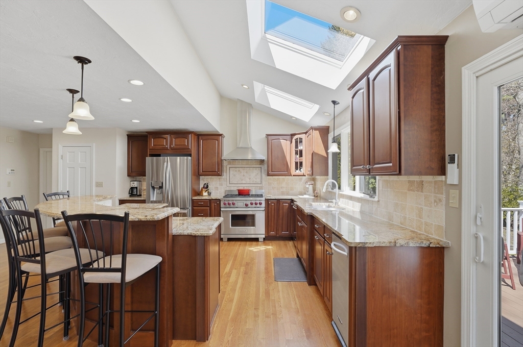 Discover unparalleled space & style in this expansive 5-bed Northborough Colonial. Beautiful HW floors guide you through a bright & airy main level, featuring a formal living room & dining room. The heart of the home is the gourmet chef’s kitchen, equipped w/ exotic granite countertops, a premium 6-burner Wolf range, skylights, & a center island. Adjacent to the kitchen, the family room serves as a cozy retreat w/ its wood-burning fireplace, vaulted ceilings w/ skylights, & direct access to the back deck. A convenient 1/2-bath w/ laundry completes the 1st floor. Level 2 has 3 bedrooms including a primary suite w/ a large walk-in closet & private en-suite. A 2nd full bathroom is off the hallway. The 3rd floor has even MORE space w/ 2 bedrooms & a full bath. The basement adds to the impressive layout w/ a finished game room/home gym. Outside, the private backyard is a peaceful haven w/ a back deck all situated in a fantastic neighborhood minutes from local amenities & local schools.