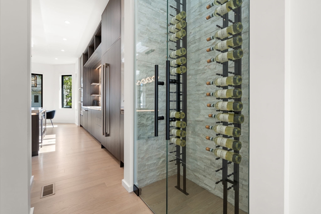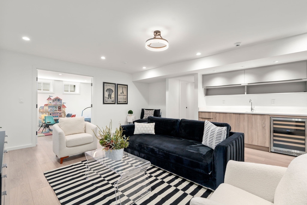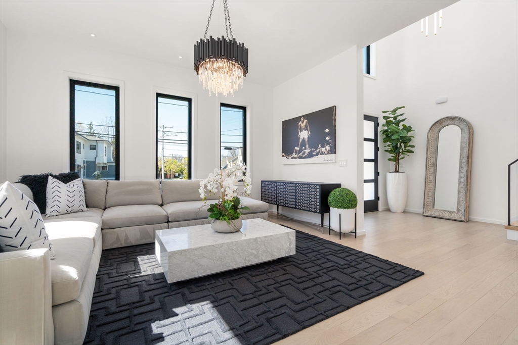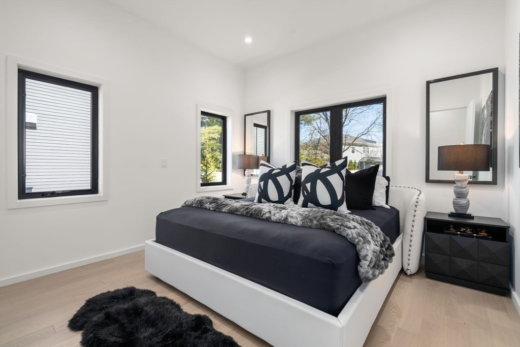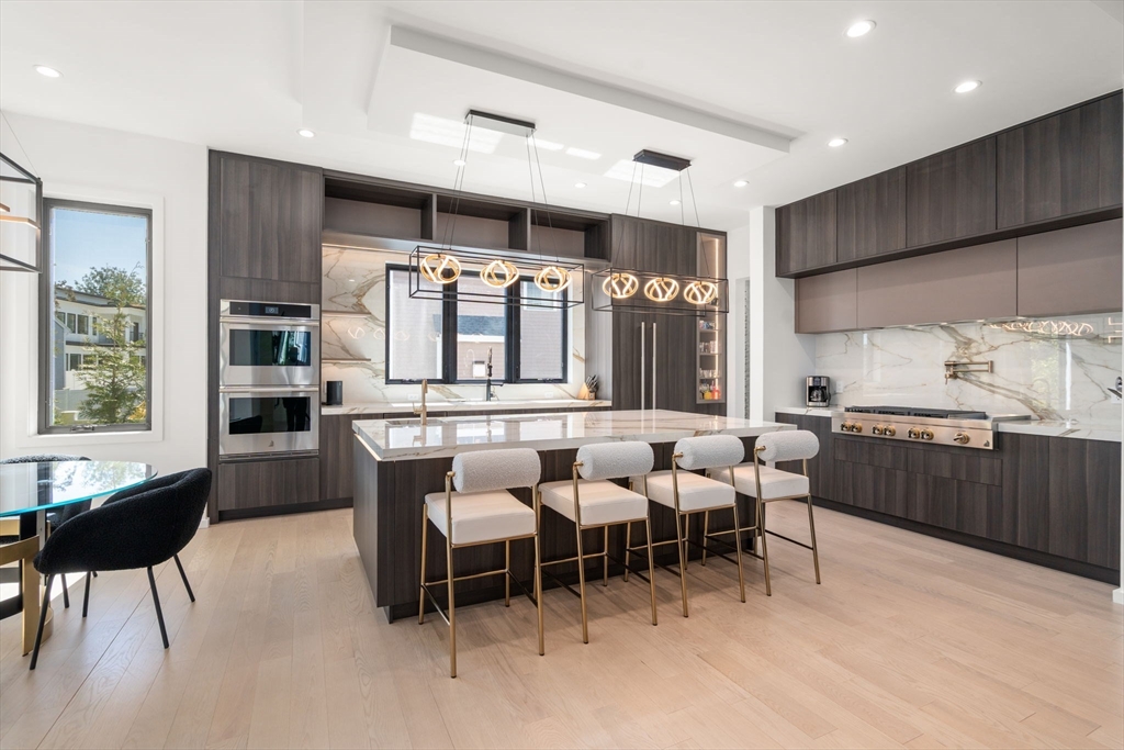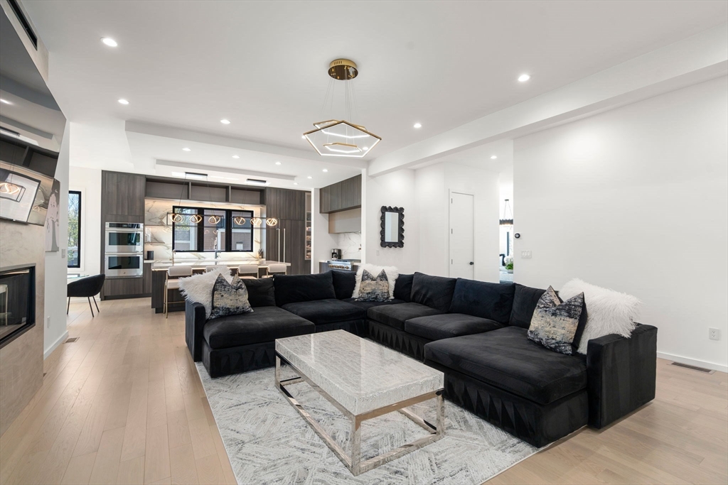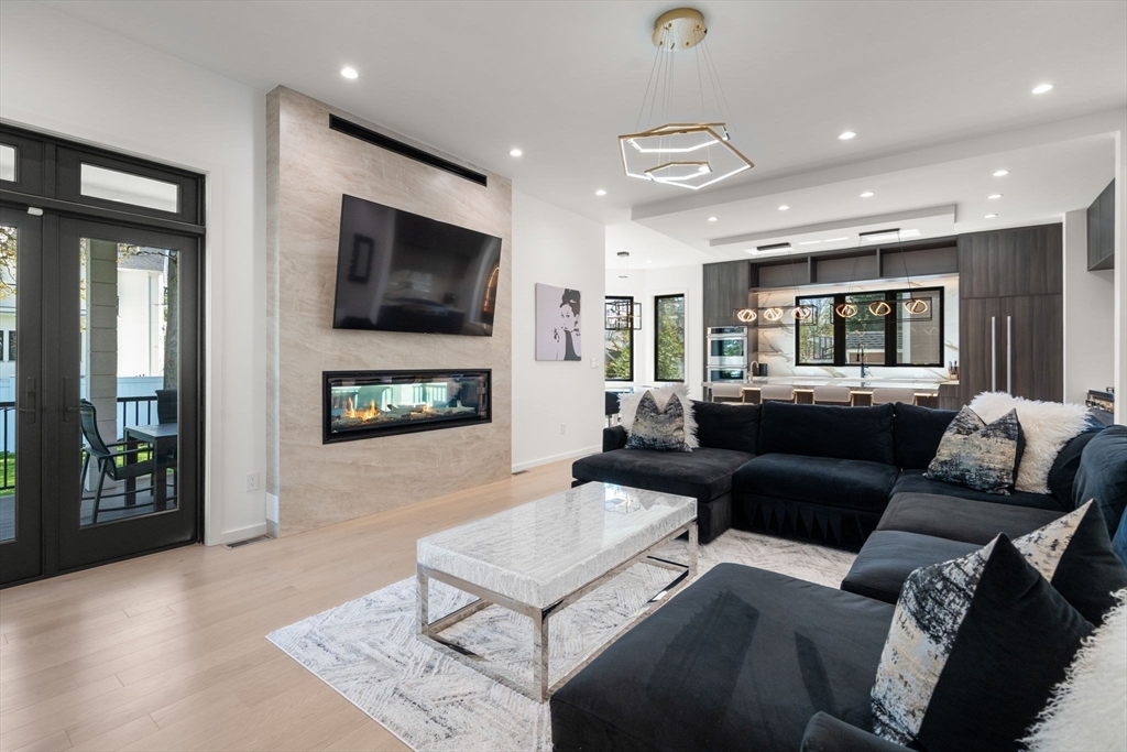 This impeccably designed Contemporary masterpiece near Newton Centre blends modern style and luxury across four levels with over 6,000 square feet of living space. On the main floor find a 2-story foyer with uplit staircase, 10-foot ceilings, wide-plank hardwood floors and open living/dining areas framed with expansive windows. The chic designer kitchen has a porcelain island that seats four, designer lighting, Jenn-Air appliances, wine room and a casual dining area. Enjoy seamless access to the covered deck and patio from the spacious family room with its double-sided fireplace. Find 4 ensuite bedrooms upstairs, including a primary suite with a spa-like bath, dual walk-in closets and private balcony. The skylit 3rd floor adds a bedroom and flexible office or bedroom. Discover a wet bar and spaces for media, gym or recreation in the finished lower level. Also note the 1st-floor bedroom, heated 2-car garage and custom mudroom.Close to schools and amenities. An extraordinary custom home!