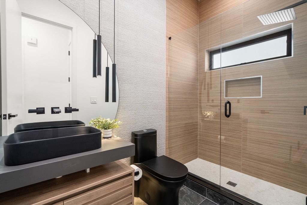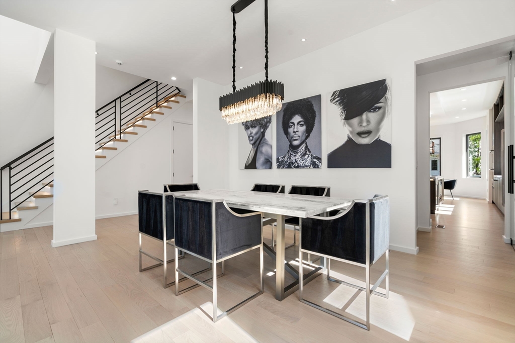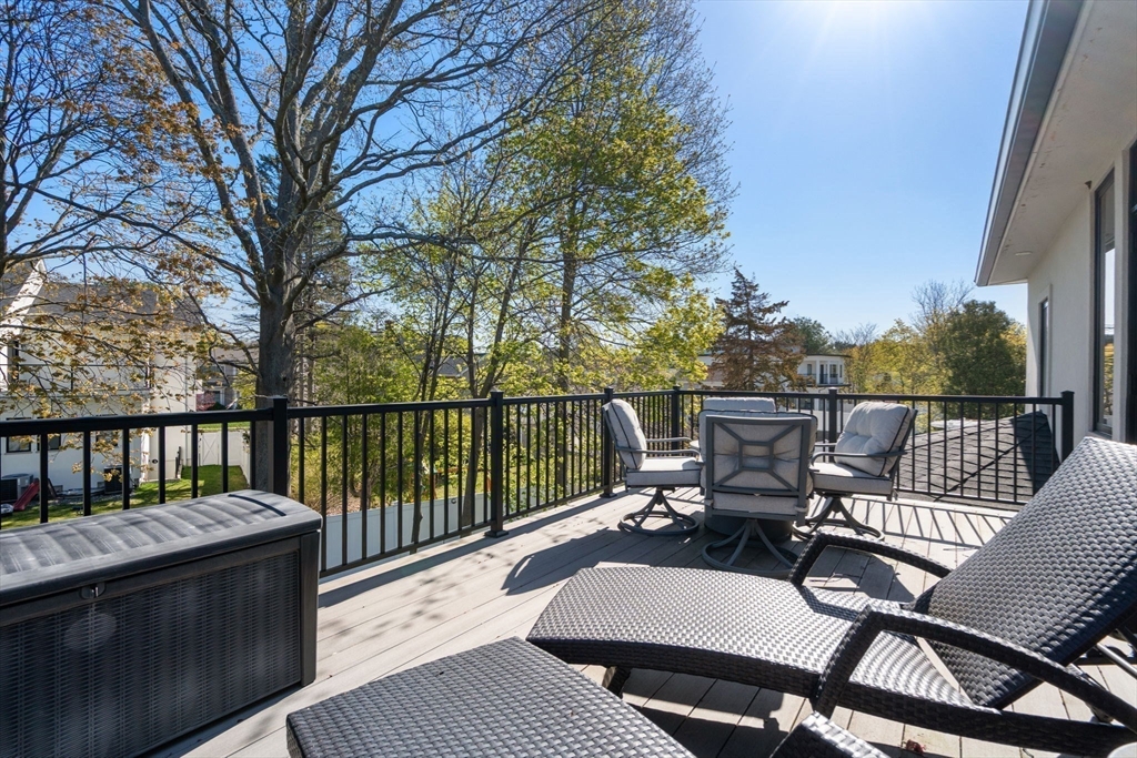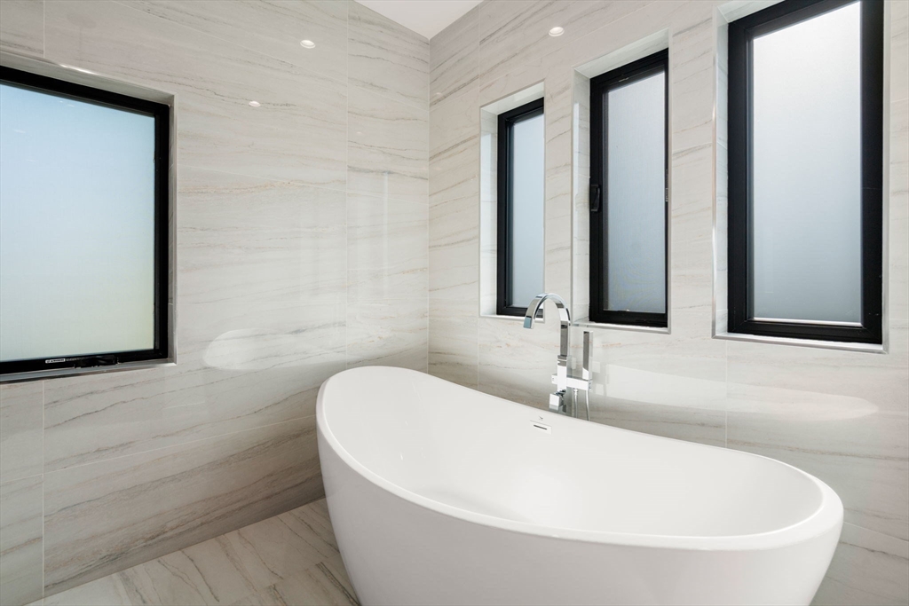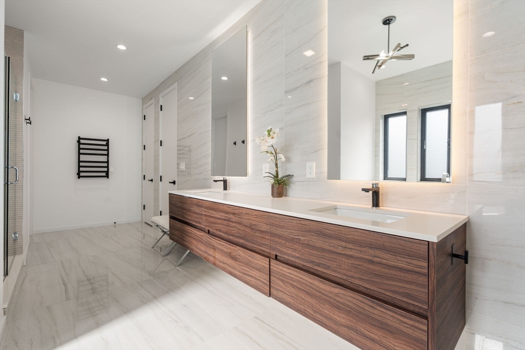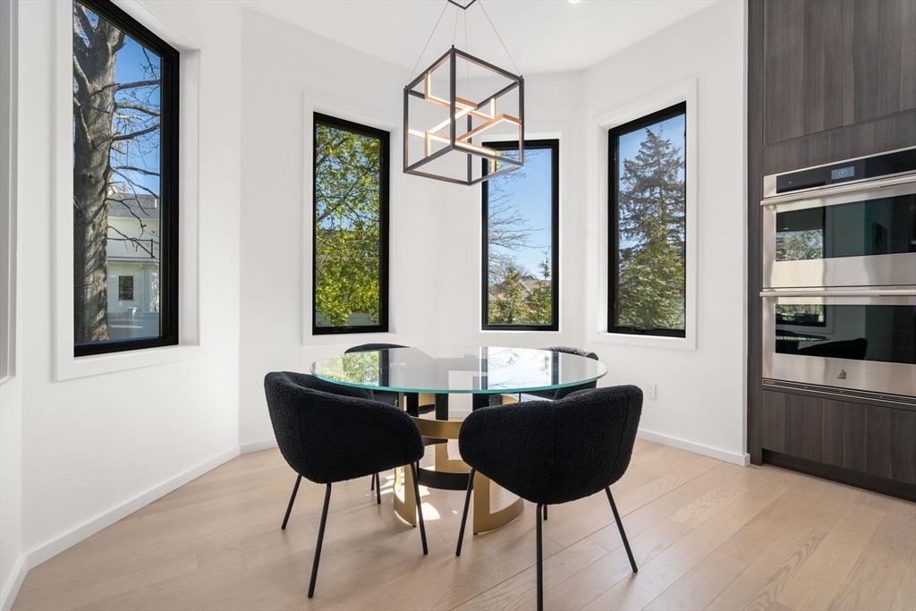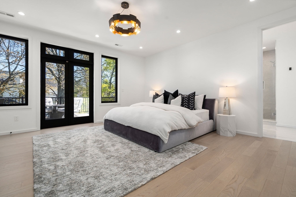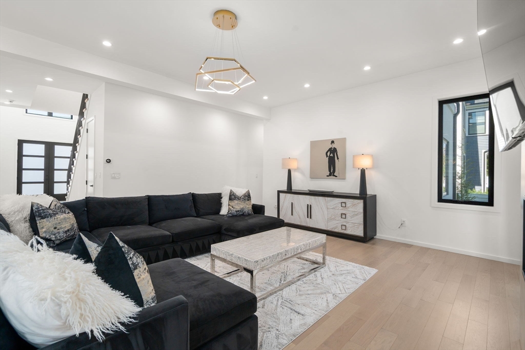 This impeccably designed Contemporary masterpiece near Newton Centre blends modern style and luxury across four levels with over 6,000 square feet of living space. On the main floor find a 2-story foyer with uplit staircase, 10-foot ceilings, wide-plank hardwood floors and open living/dining areas framed with expansive windows. The chic designer kitchen has a porcelain island that seats four, designer lighting, Jenn-Air appliances, wine room and a casual dining area. Enjoy seamless access to the covered deck and patio from the spacious family room with its double-sided fireplace. Find 4 ensuite bedrooms upstairs, including a primary suite with a spa-like bath, dual walk-in closets and private balcony. The skylit 3rd floor adds a bedroom and flexible office or bedroom. Discover a wet bar and spaces for media, gym or recreation in the finished lower level. Also note the 1st-floor bedroom, heated 2-car garage and custom mudroom.Close to schools and amenities. An extraordinary custom home!