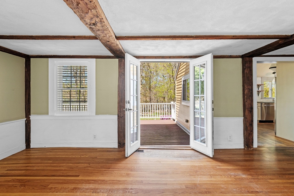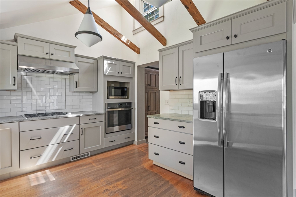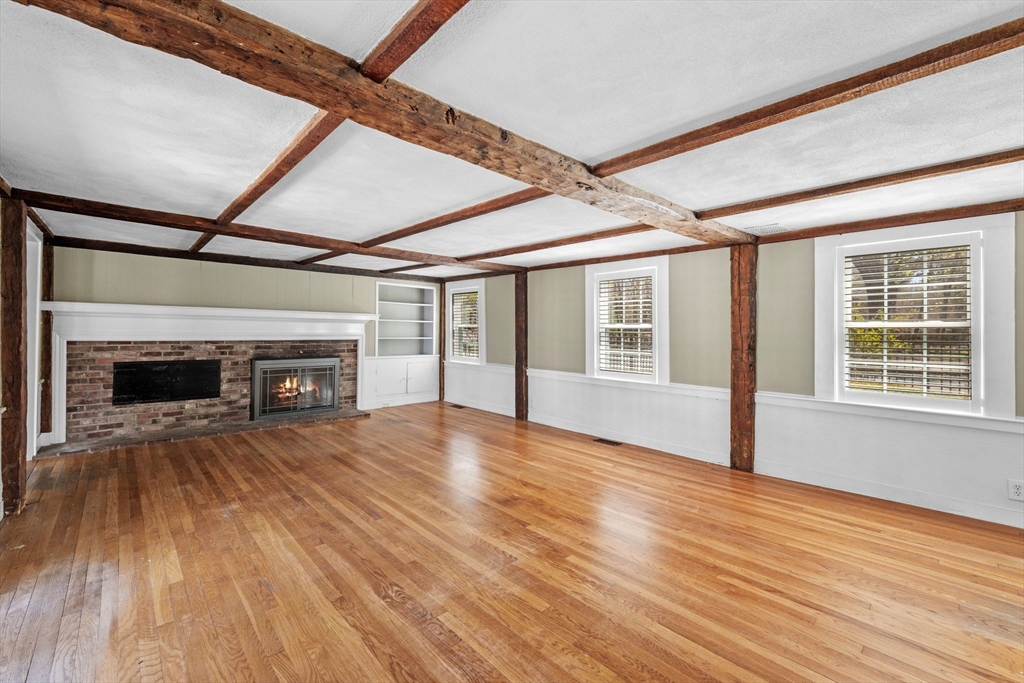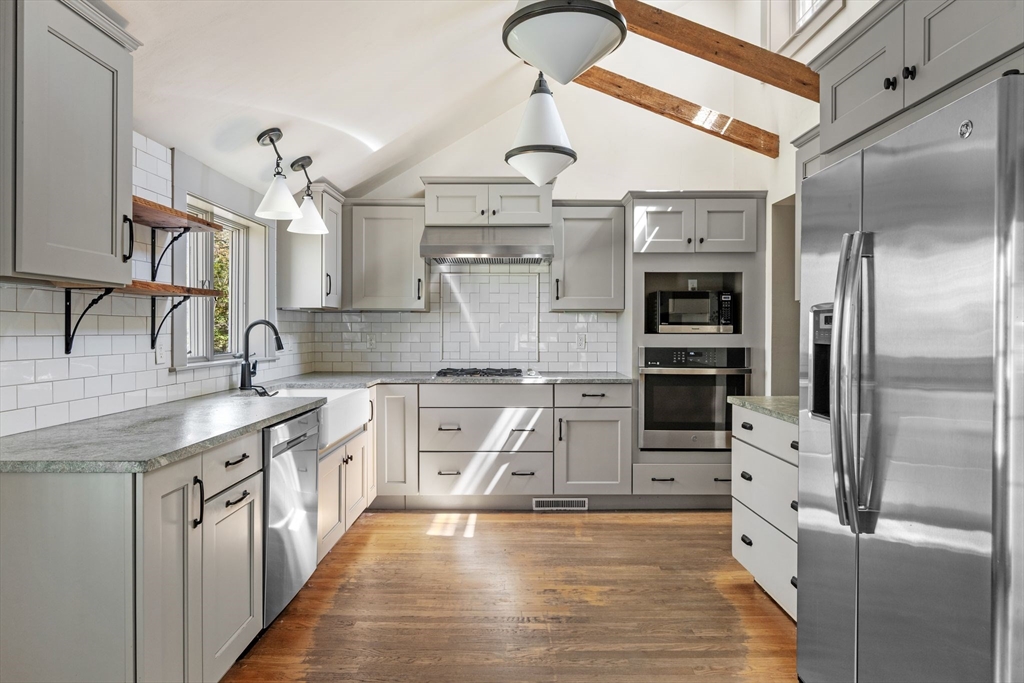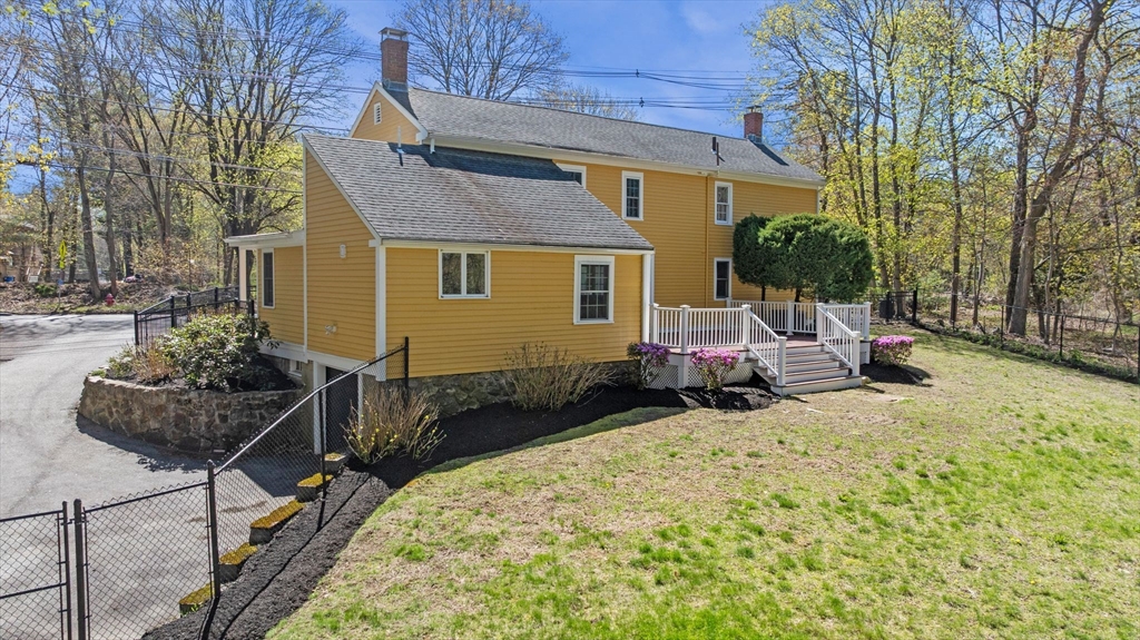 Welcome to 1 Chestnut- a beautiful, move in ready home offering a perfect blend of character and modern comfort on a spacious lot in North Reading, located in the desirable Batchelder School District. Bright, open kitchen features vaulted ceiling with exposed wood beams, shaker cabinetry, leather granite countertops, stainless steel appliances, and subway tile backsplash. The oversized living room offers hardwood floors, rustic beam detail, and a cozy fireplace- perfect for entertaining. Convenient mudroom/laundry area with added storage. Four bedrooms with one being conveniently located on the first floor along with two full bathrooms with modern finishes. Enjoy abundant natural light throughout and a large outdoor fenced in space offering both privacy and flexibility. Plenty of storage in the full basement that leads to an underneath 1 car garage/ storage space.