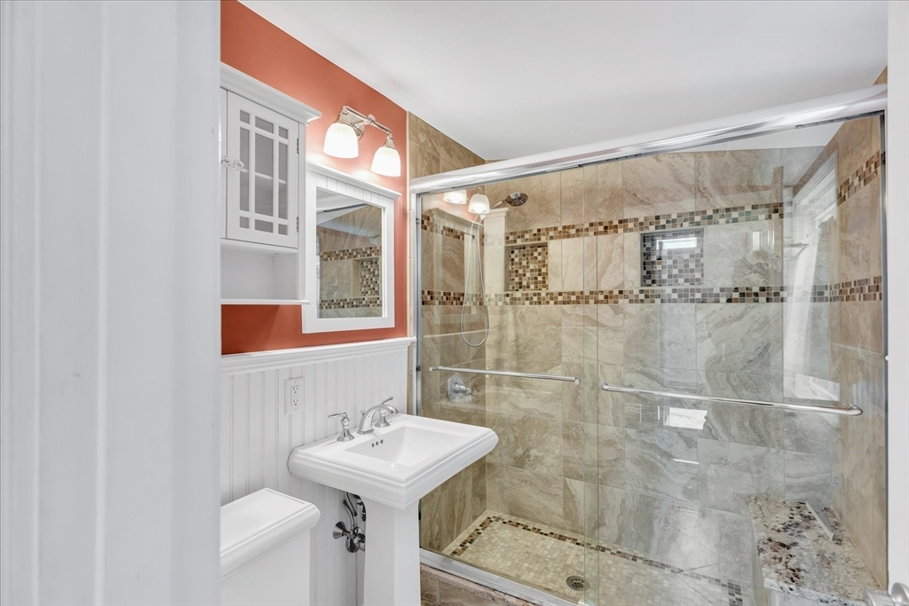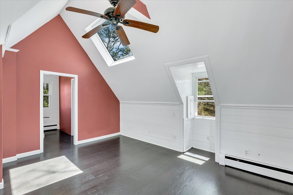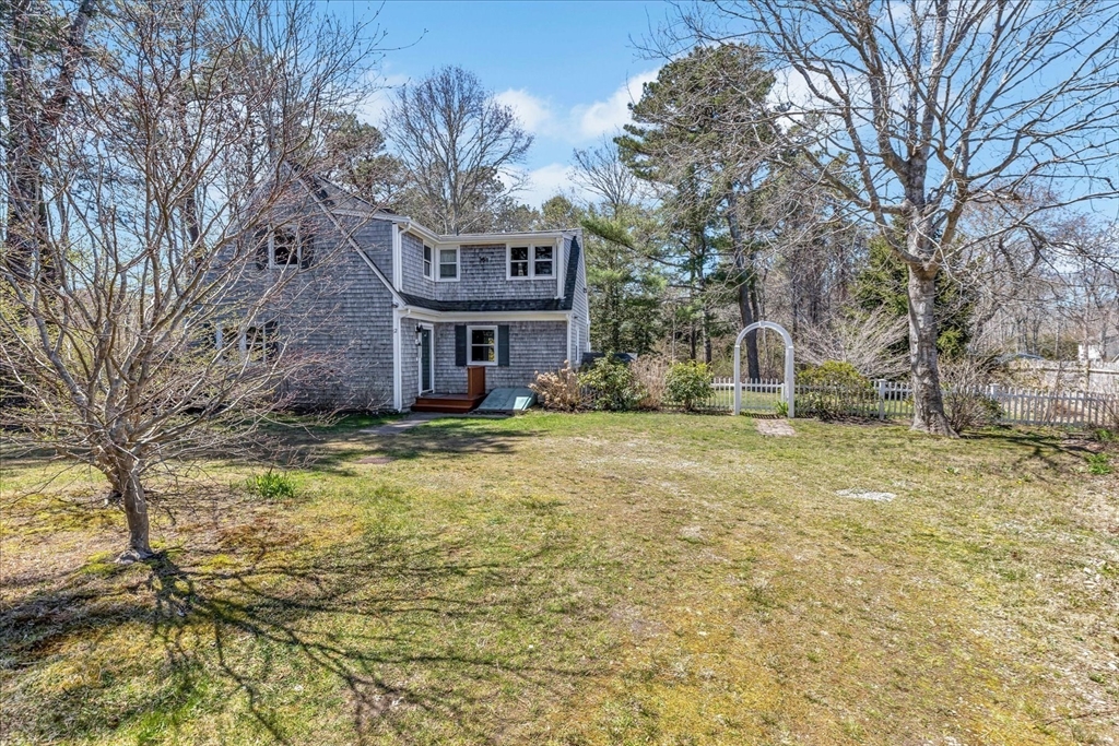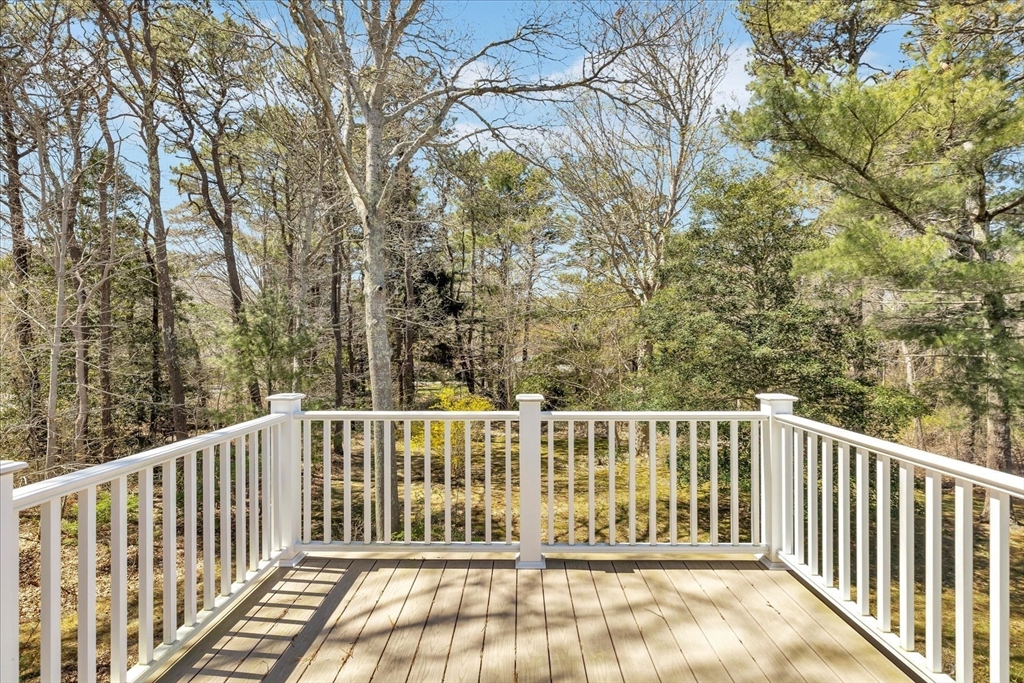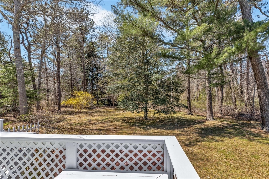 Tucked into a private, nearly acre wooded setting that feels worlds away from everyday life, this home offers a peaceful retreat with warmth, character, and room to breathe. Set well back from the road down a long drive, the home is largely hidden from view, creating a quiet sense of seclusion while still offering convenient access to Sandwich amenities, conservation areas, golf, and nearby beaches. Just down the sidewalk is Snake Pond Beach, ideal for swimming, kayaking, or relaxing by the water. Inside, wood floors, a stone fireplace, built-ins, and inviting living spaces create timeless charm. The kitchen and baths are nicely updated, while the upper level offers vaulted ceilings, skylights, and glass doors opening to a balcony overlooking the trees. The finished lower level with its own fireplace adds flexible space for living, work, or recreation. Outside, a spacious deck and generous yard invite outdoor dining, gardening, or quiet afternoons surrounded by natural beauty.