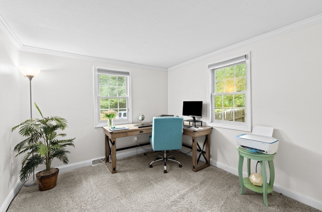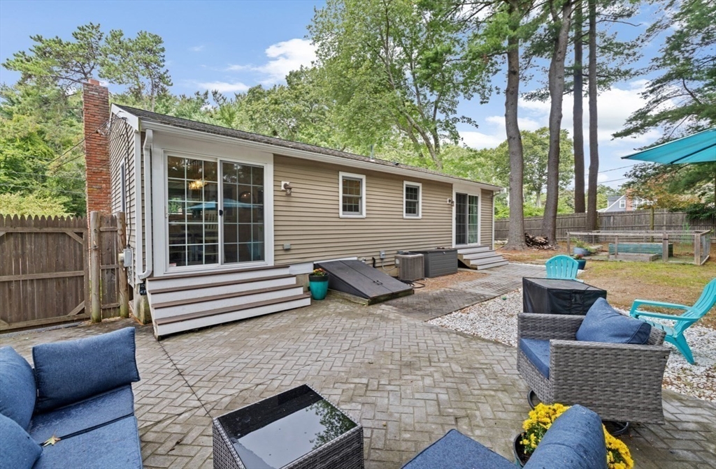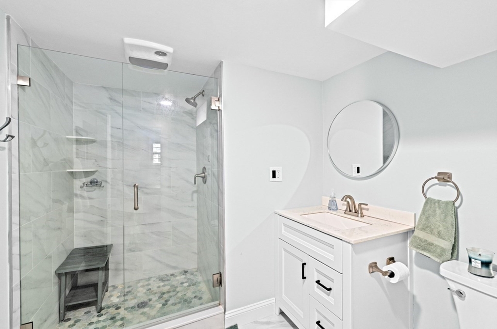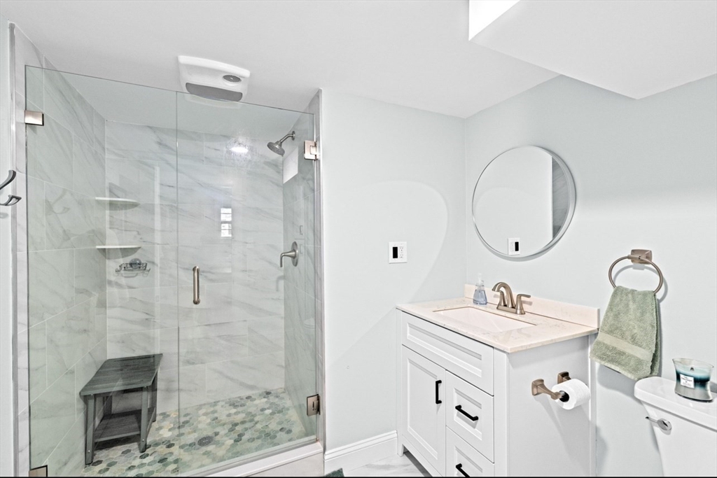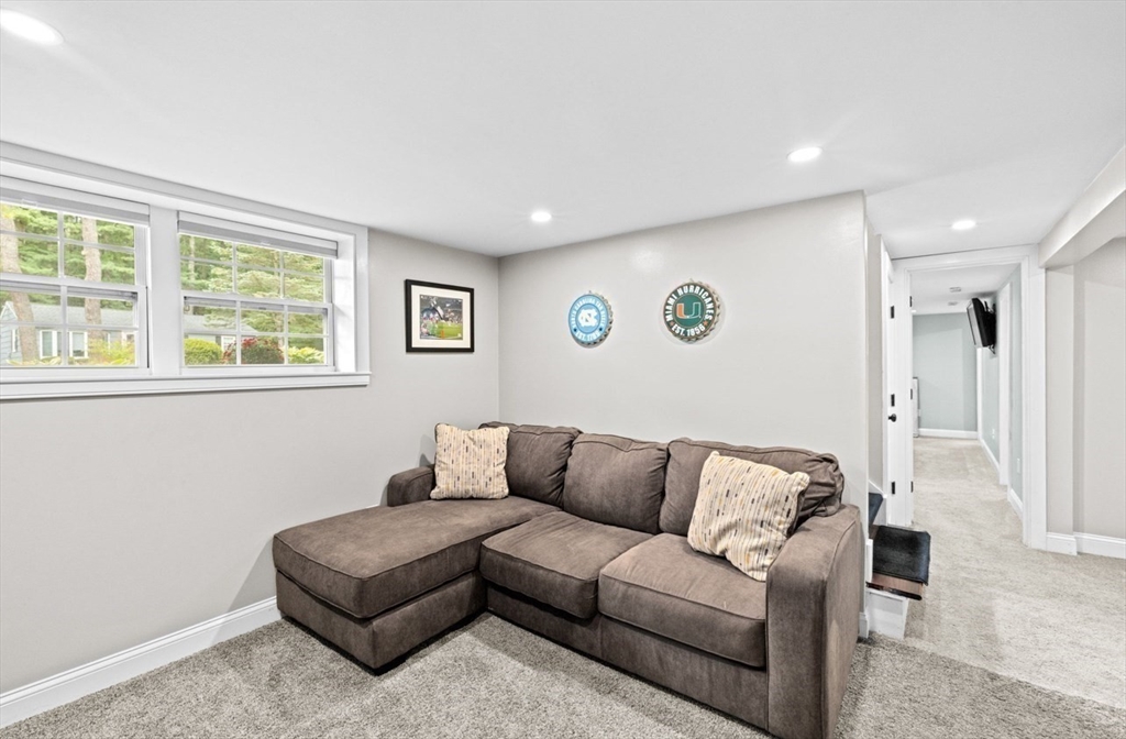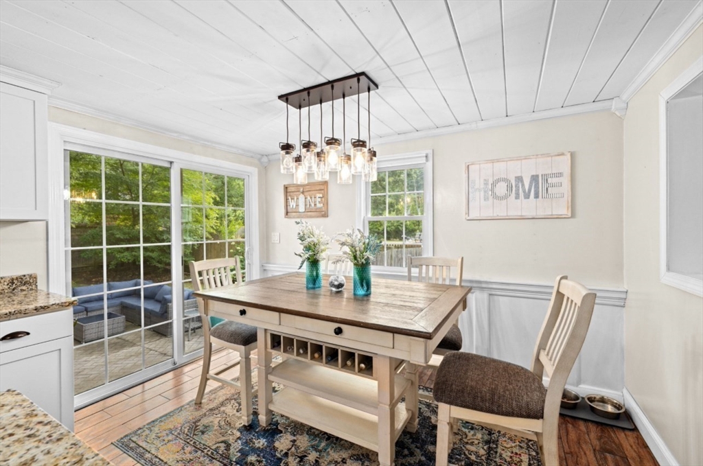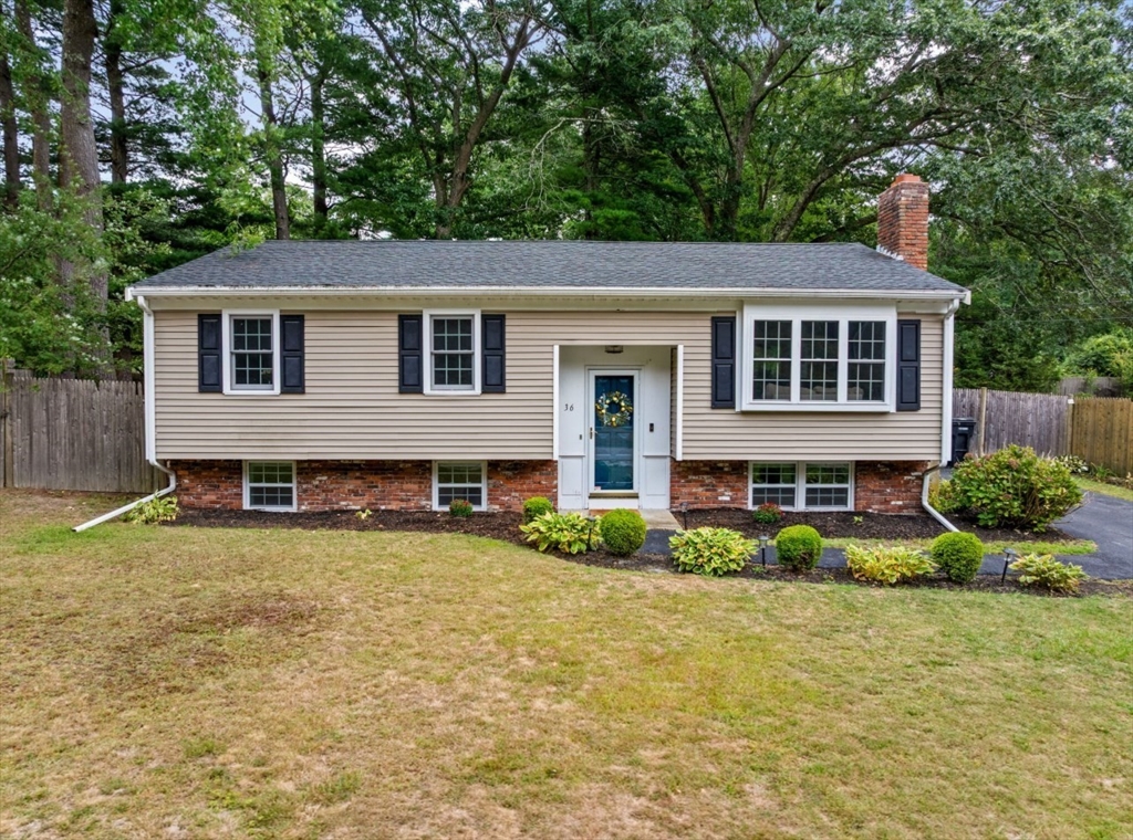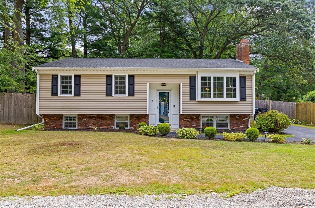 This beautifully maintained 4-bedroom home is move in ready and situated on a quiet dead-end street, just minutes from Route 3 and the commuter rail - offering the perfect balance of convenience and peaceful living. The main level features an open concept layout designed for today's lifestyle, highlighted by a stunning eat in kitchen with center island, granite countertops, and stainless steel appliances. A slider leads directly to back patio and fenced in yard, creating seamless space for entertaining and outdoor enjoyment. The sun-drenched living room boasts exposed beams, and large picture window, and a classic wood burning fireplace-delivering both charm and comfort. The lower level expands your living space with a family room featuring a striking stone surround electric fireplace, ideal for relaxing or hosting guests. This level also includes a private primary suite, offering a quiet retreat with added flexibility. This home checks all the boxes for space, style and convenience!
